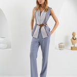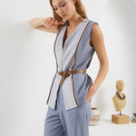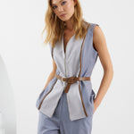 Cut with a tailored silhouette, the design is anchored by a leather waist belt that defines the body with quiet authority. A rigid metal zipper introduces a sharp, contemporary edge, reinforcing the vest’s architectural character. Every element is intentional, creating a piece that feels both functional and refined.