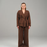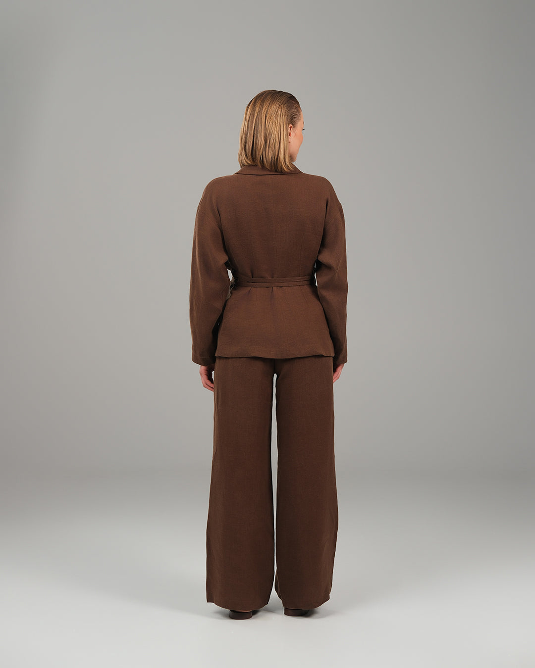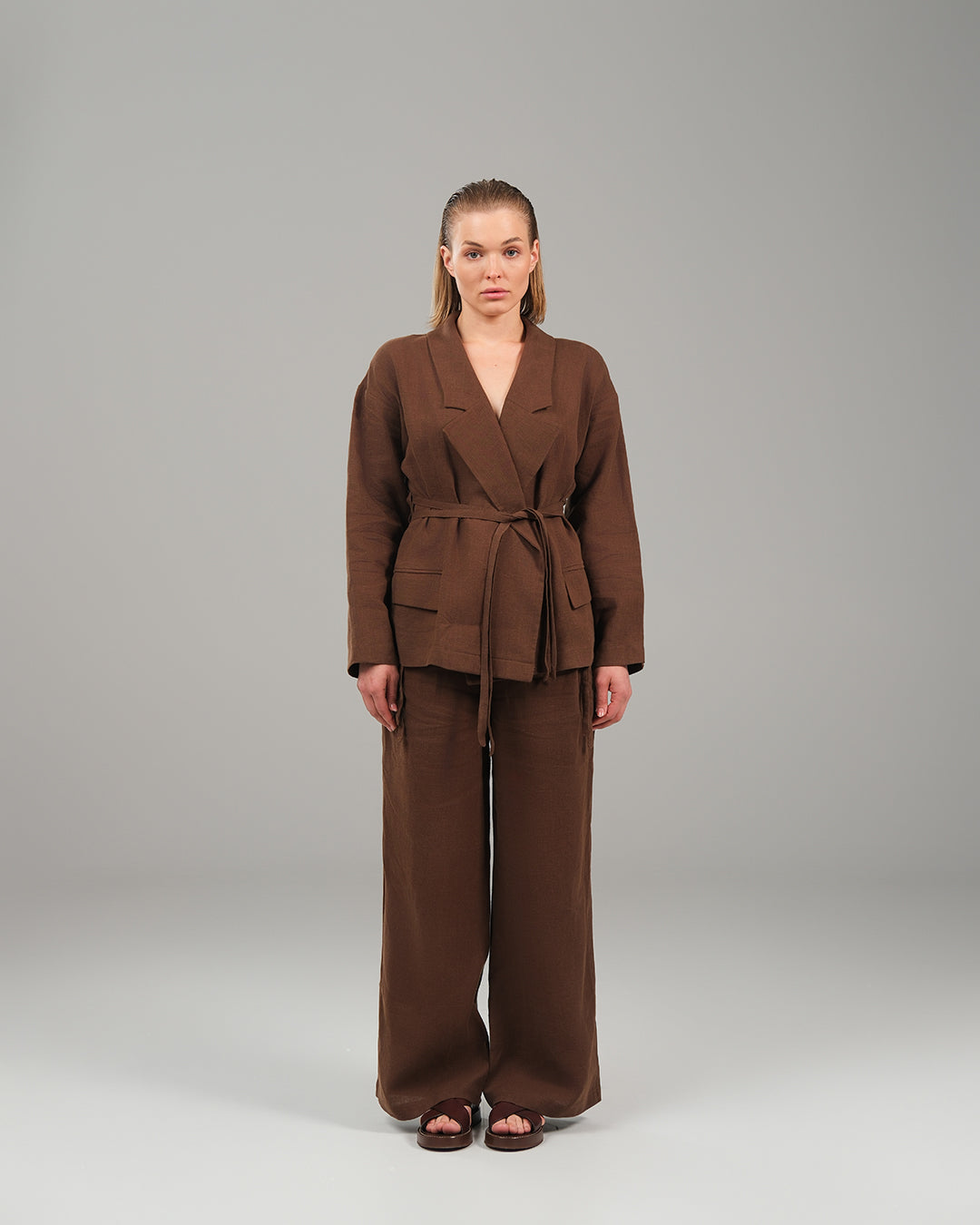 Inspired by the quiet strength of armor, the Arma Jacket combines commanding structure with natural fluidity. Its long sleeves, wrap front, and self-tie belt create a strong silhouette softened by breathable linen. Notched lapels lend a tailored edge, while its effortless wrap design allows for adjustable styling — from powerfully cinched to loosely layered.