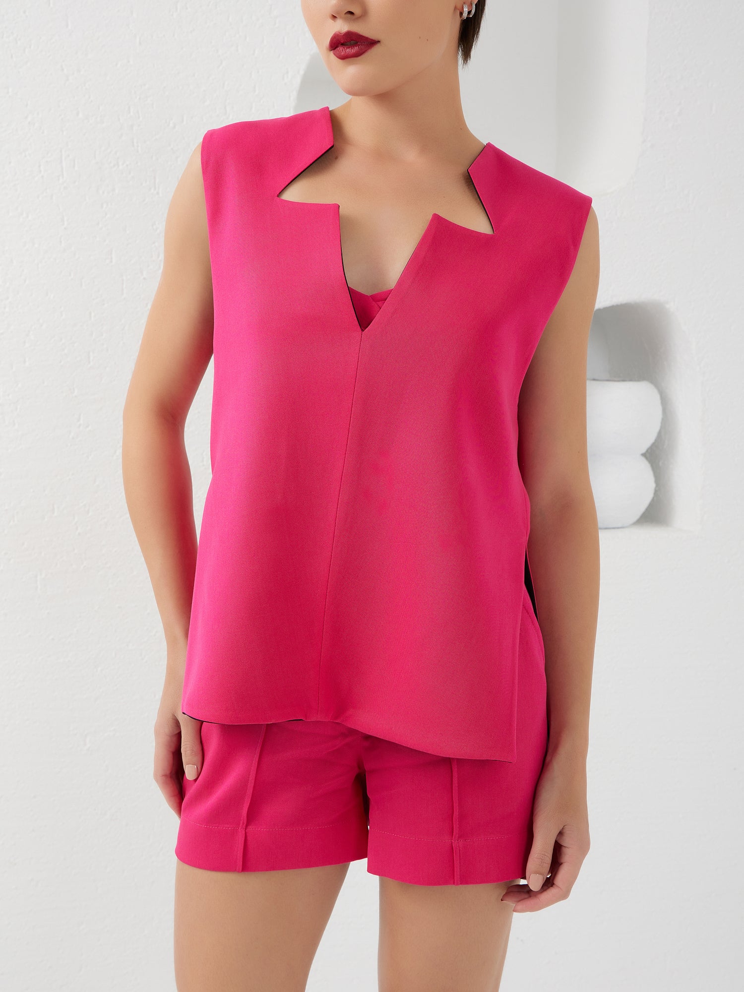 This sleeveless oversized blouse is a must for every occasion. This shirt is a symphony of linear precision and split toning, embracing deconstructed tailoring that speaks to the soul of modernity. The star neckline design adds a celestial touch, making a bold statement with its distinctive flair. Crafted with reversible ingenuity, this shirt offers the versatility to transform your look effortlessly. With a commitment to refined aesthetics, Lumina Eligma presents a piece that embodies contemporary elegance through its meticulous craftsmanship and bold design.