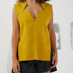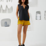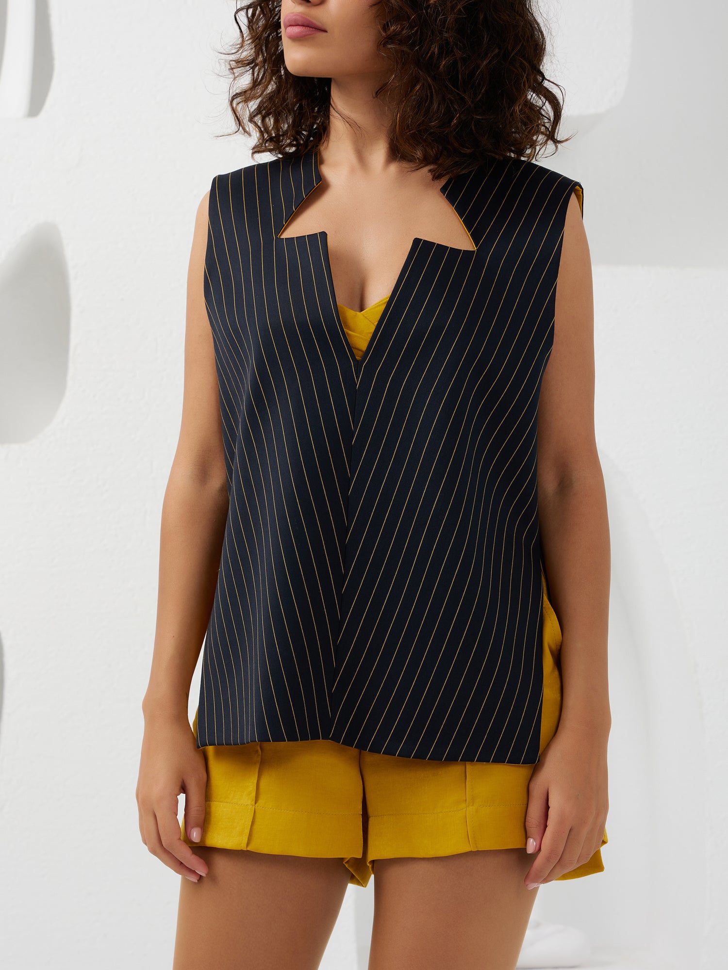 This sleeveless oversized blouse is a must for every occasion. This shirt is a symphony of linear precision and split toning, embracing deconstructed tailoring that speaks to the soul of modernity. The star neckline design adds a celestial touch, making a bold statement with its distinctive flair. Crafted with reversible ingenuity, this shirt offers the versatility to transform your look effortlessly. With a commitment to refined aesthetics, Lumina Eligma presents a piece that embodies contemporary elegance through its meticulous craftsmanship and bold design.