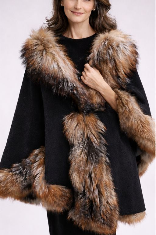 Merino Felt Fox Fur Hooded Poncho - Almond Blossoms Black