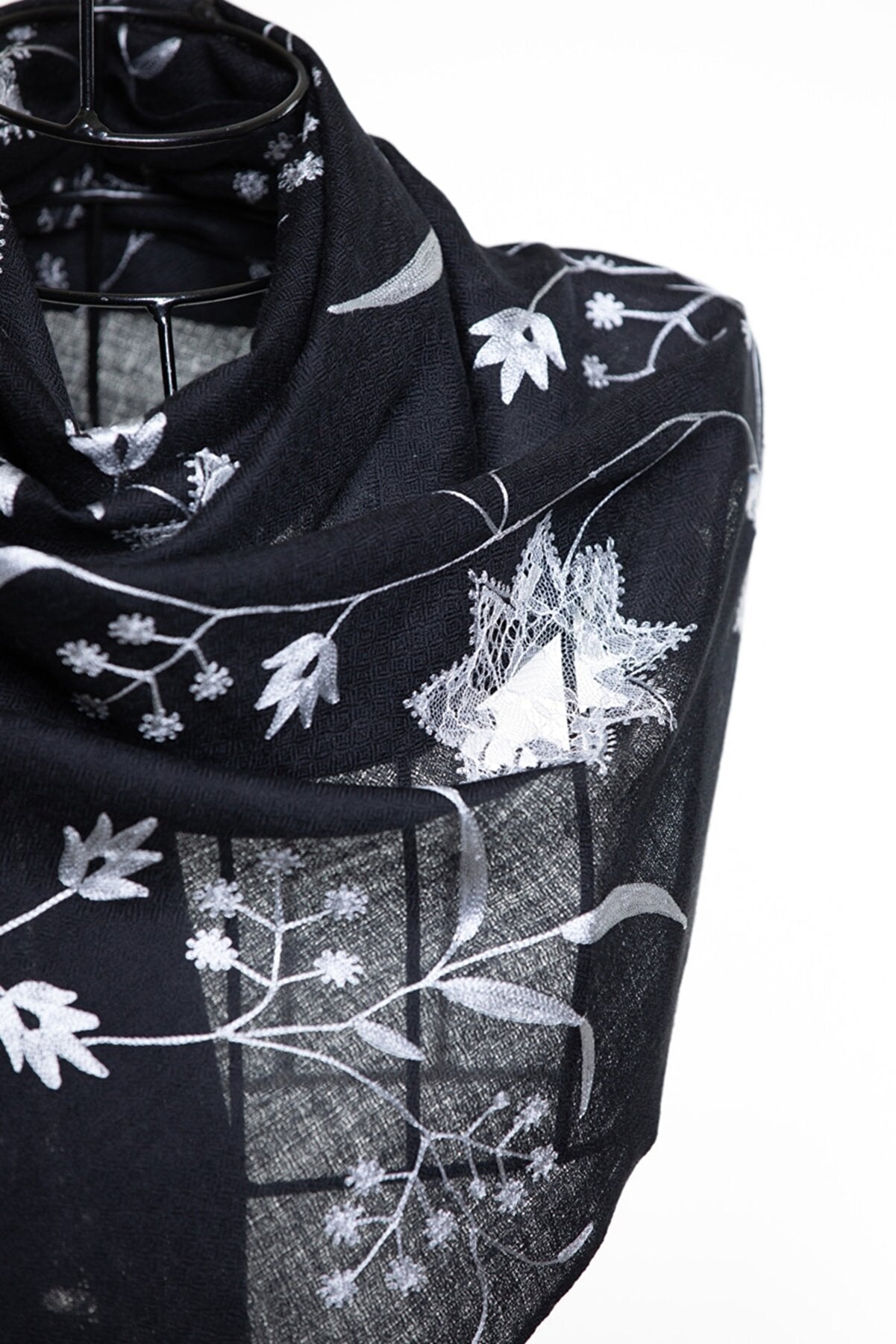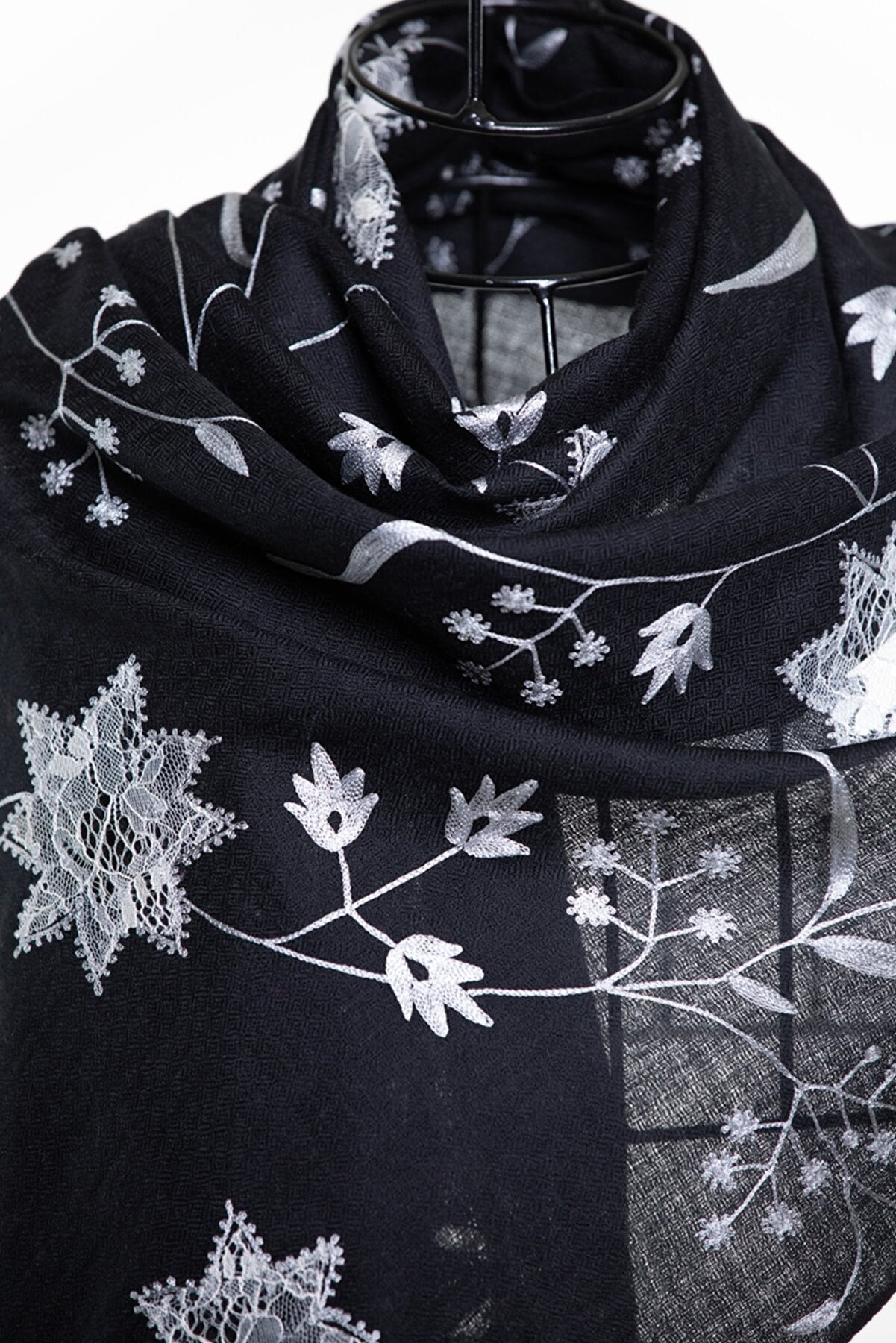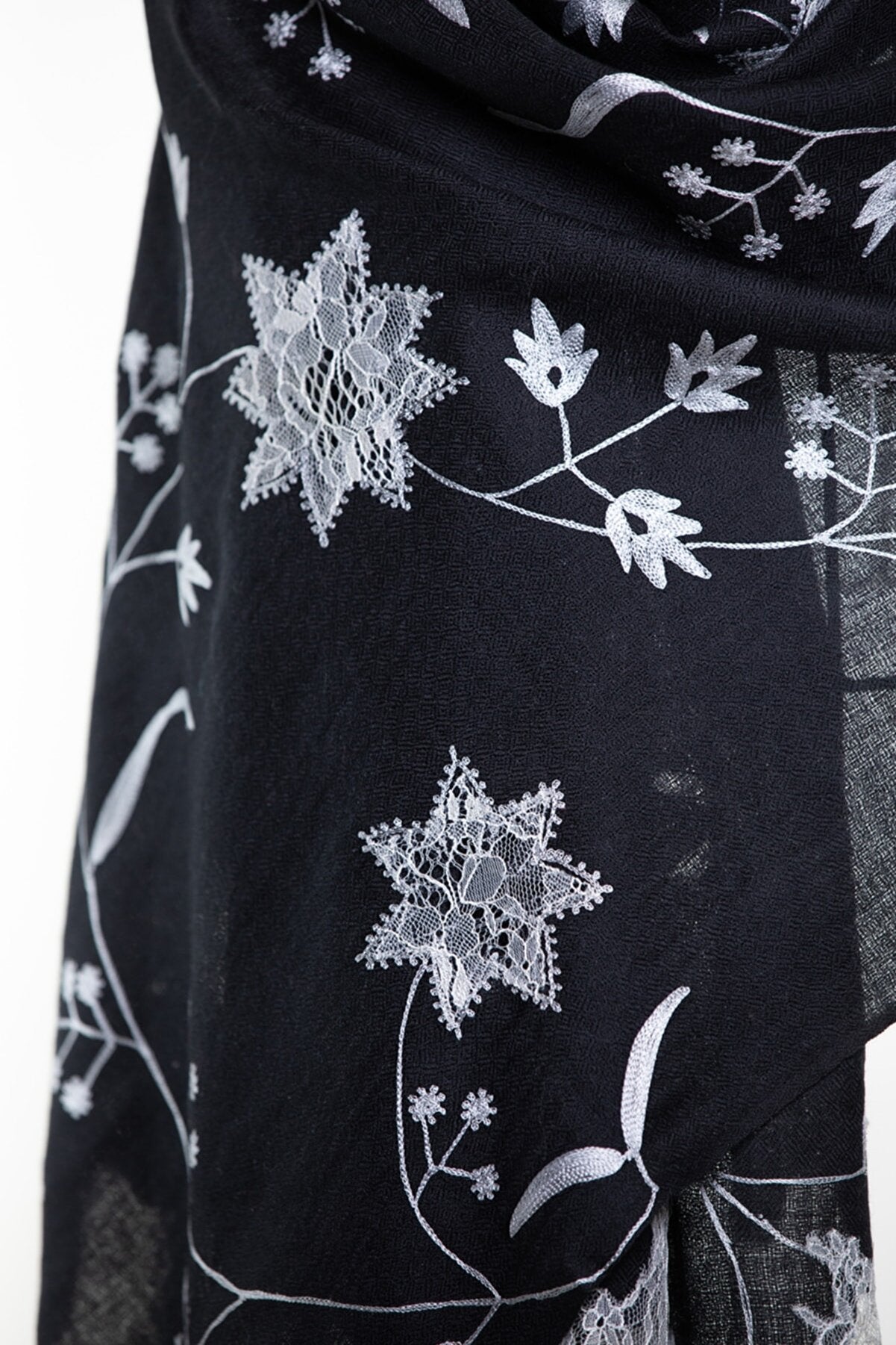 Cashmere with silky lace added to both the shawl and the borders with a subtle Embroidery silk floral patterns. Combining lace with embroidery creates a truly unique shawl with simple floral designs for an elegant and simple look.