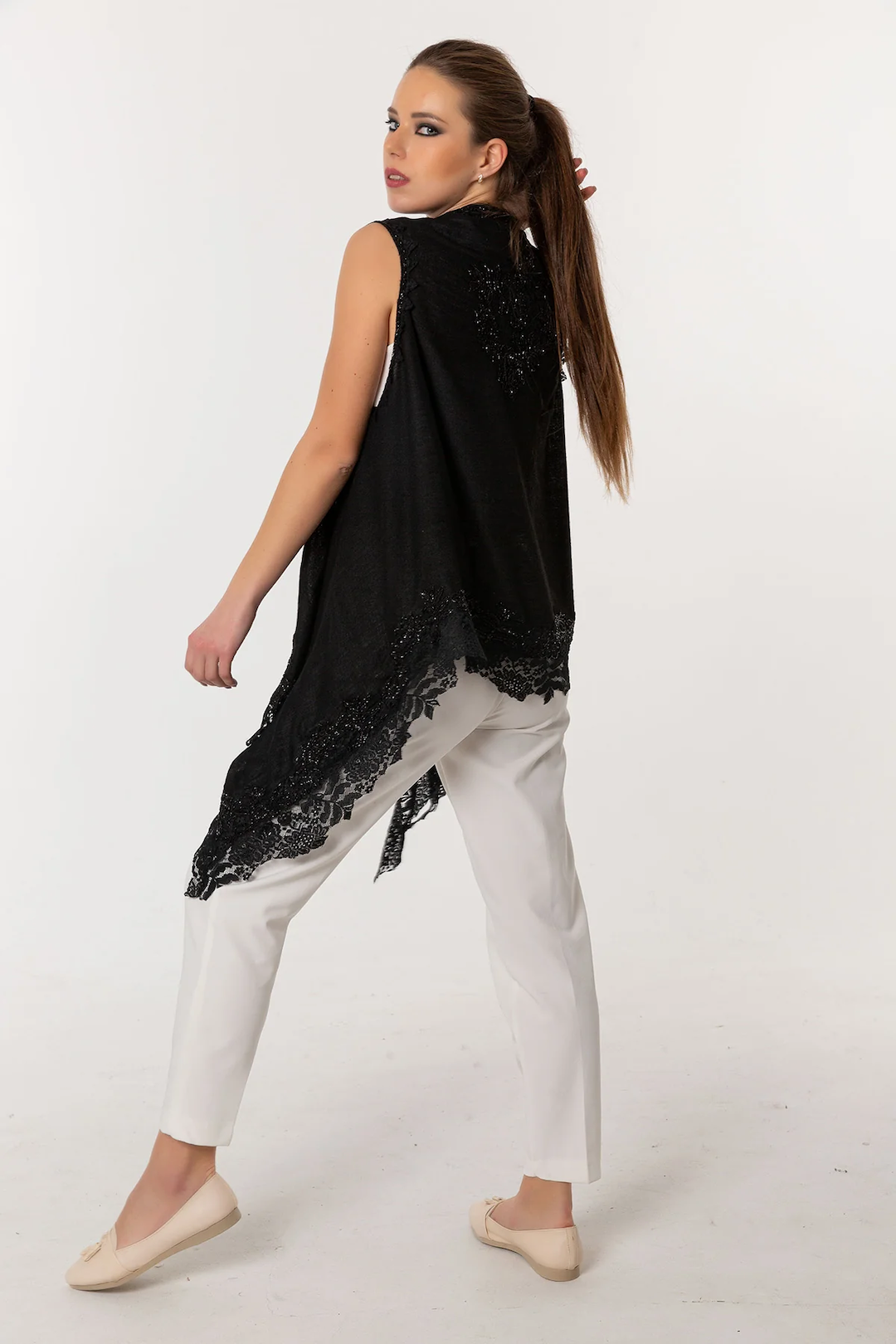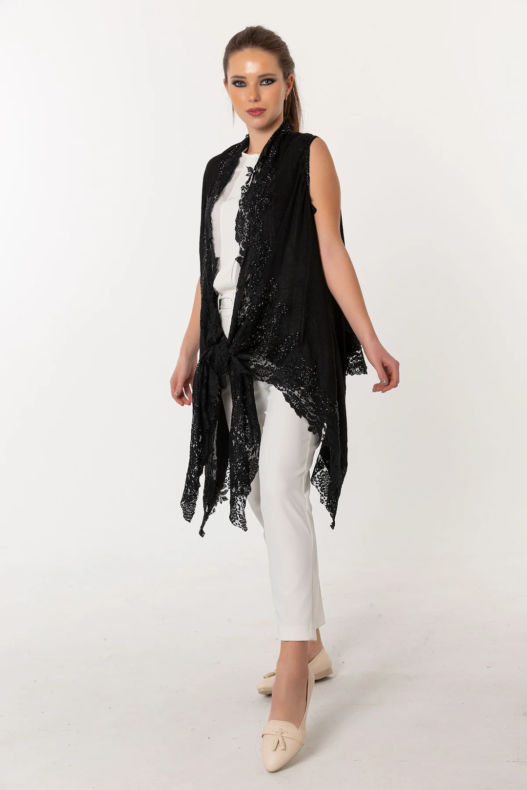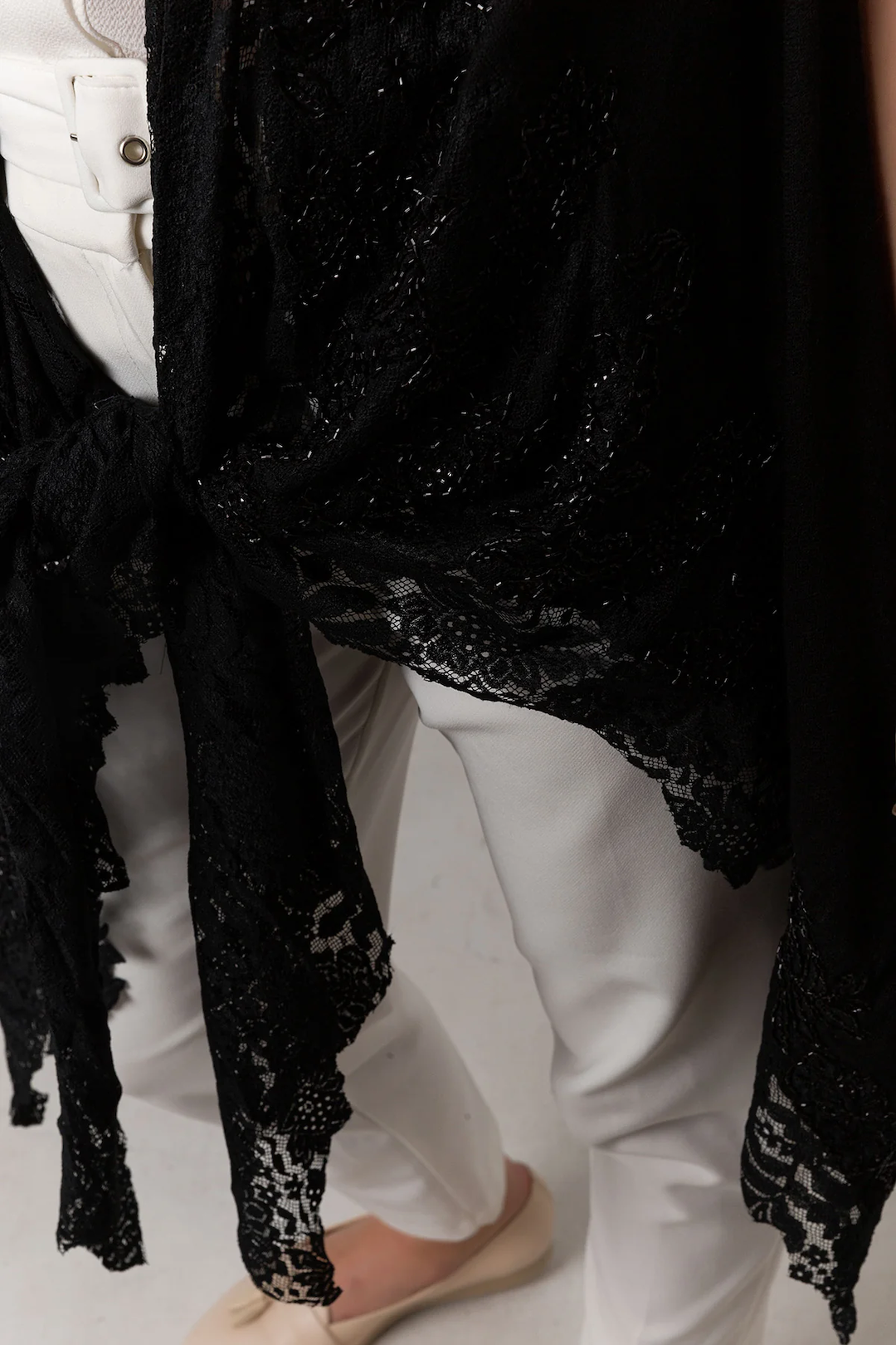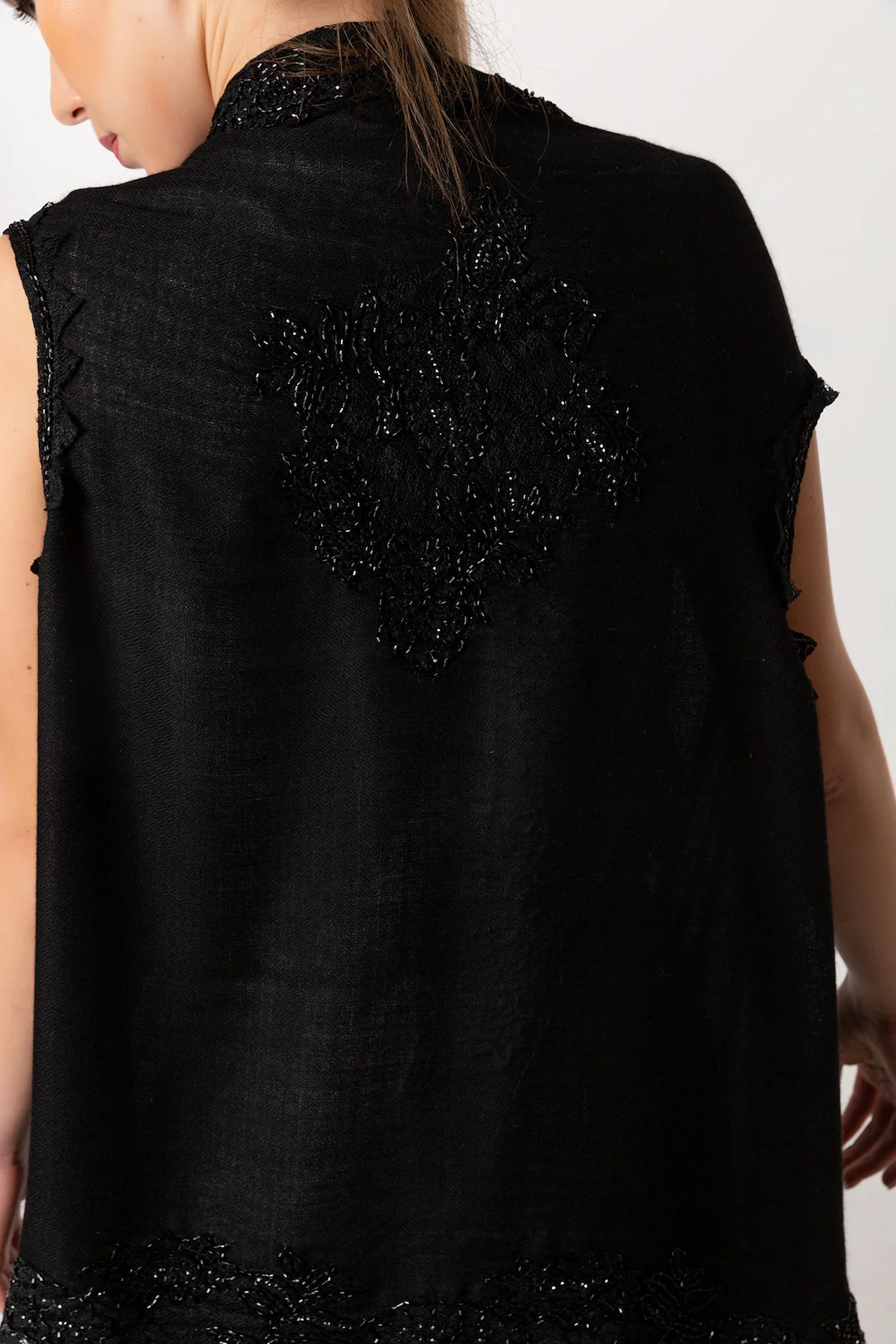 Indulge in luxurious elegance with this exclusive poncho shawl, unlike any other. This beautiful piece combines the finest materials - 92% cashmere and 8% silk - with exquisite French lace and intricate bead work. The result is a stunning vest/poncho that is both elegant and unique, making a bold statement wherever you go. The delicate lace adds a touch of femininity, while the bead work lends a touch of sparkle and sophistication. This poncho is the perfect choice for any special occasion, whether you're dressing up for a wedding or adding a touch of glamour to a casual outfit. Wrap yourself in the unparalleled luxury and beauty of this exquisite piece.