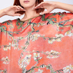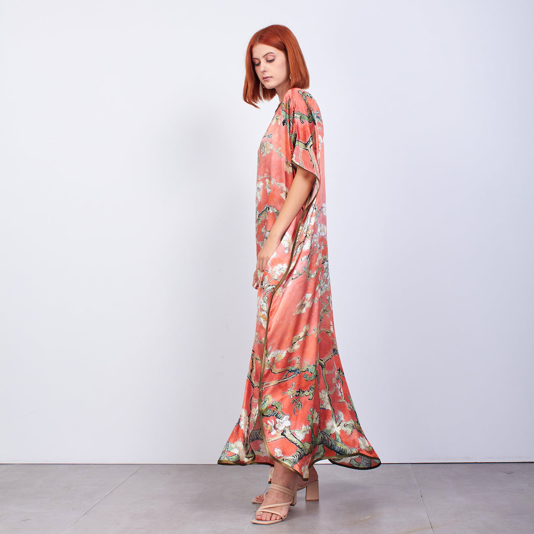 Long Mulberry Pure Silk Dress - Van Gohg Red Almond Blossom