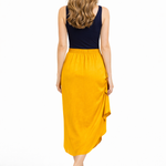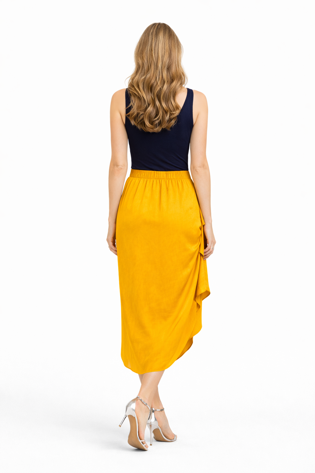 Crafted from a luxurious silk and viscose blend, the fabric offers a soft, fluid drape with a subtle sheen. The rich mustard tone enhances the sculptural lines, creating a statement that feels both modern and timeless.