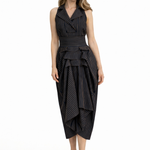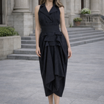 A refined expression of modern tailoring, the Tuxedo Dress reinterprets classic tuxedo structure through a feminine, architectural lens. Featuring a sleek sleeveless bodice and a sculpted waist, the design balances sharp tailoring with fluid elegance.