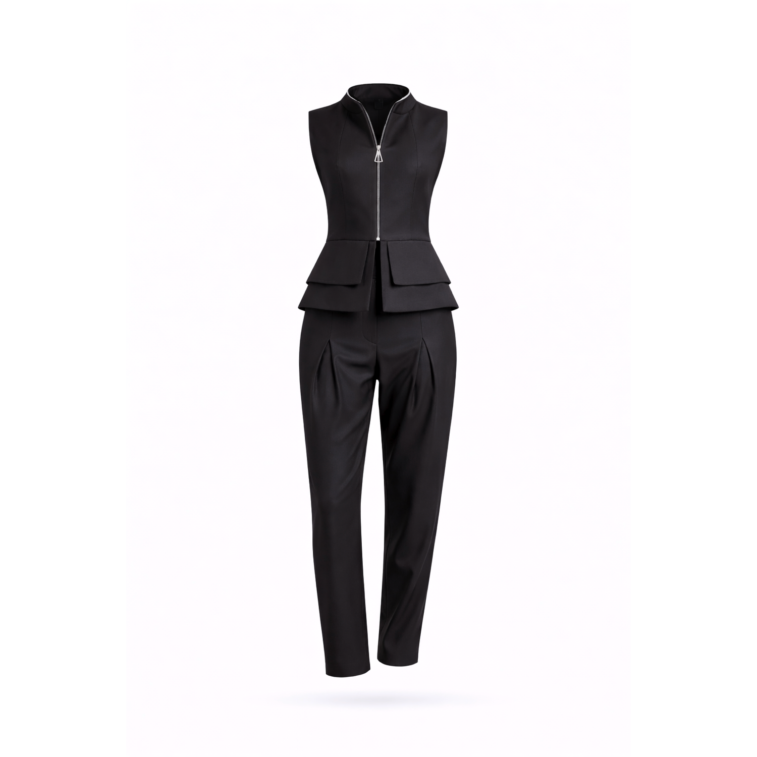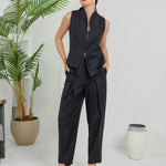 The Construct Vest Suit & Pants Ensemble is a study in strength, precision, and modern tailoring. A sleeveless vest with a full-length zipper elongates the body and creates an upward, sculptural line, while leather detailing along the edges adds a subtle edge of authority. Paired with sharply tailored pants featuring dual darts, the silhouette is refined, confident, and commanding.
