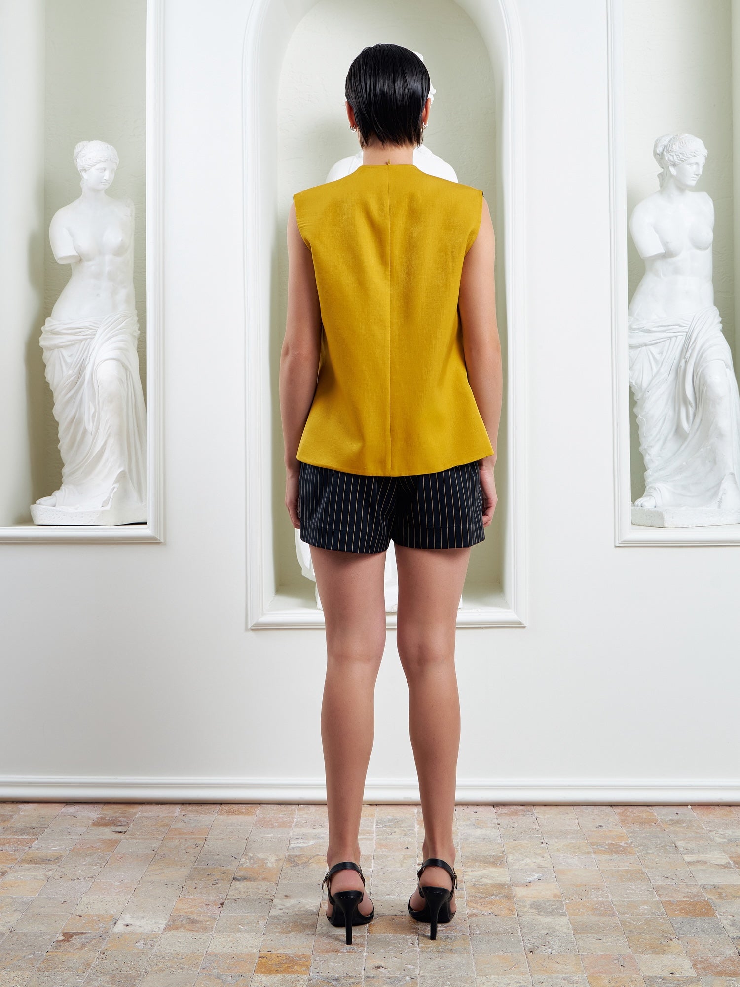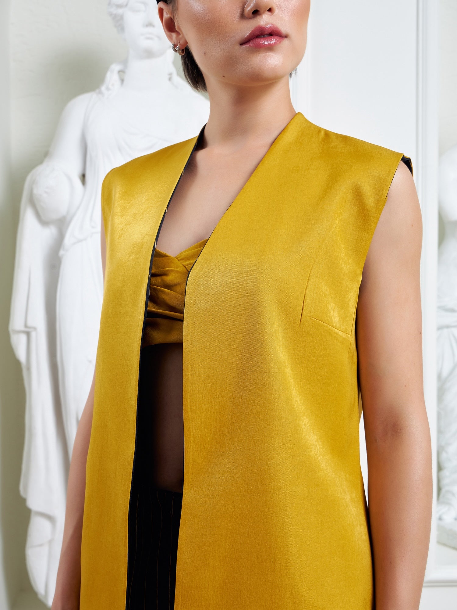 Crafted with clean, intentional lines, the vest sharpens the silhouette while maintaining fluid ease. One side presents a refined navy pinstripe, while the reverse reveals a gold mustard interior, allowing the piece to shift mood and character with understated confidence. The elongated cut and tailored proportions create a strong yet effortless profile.