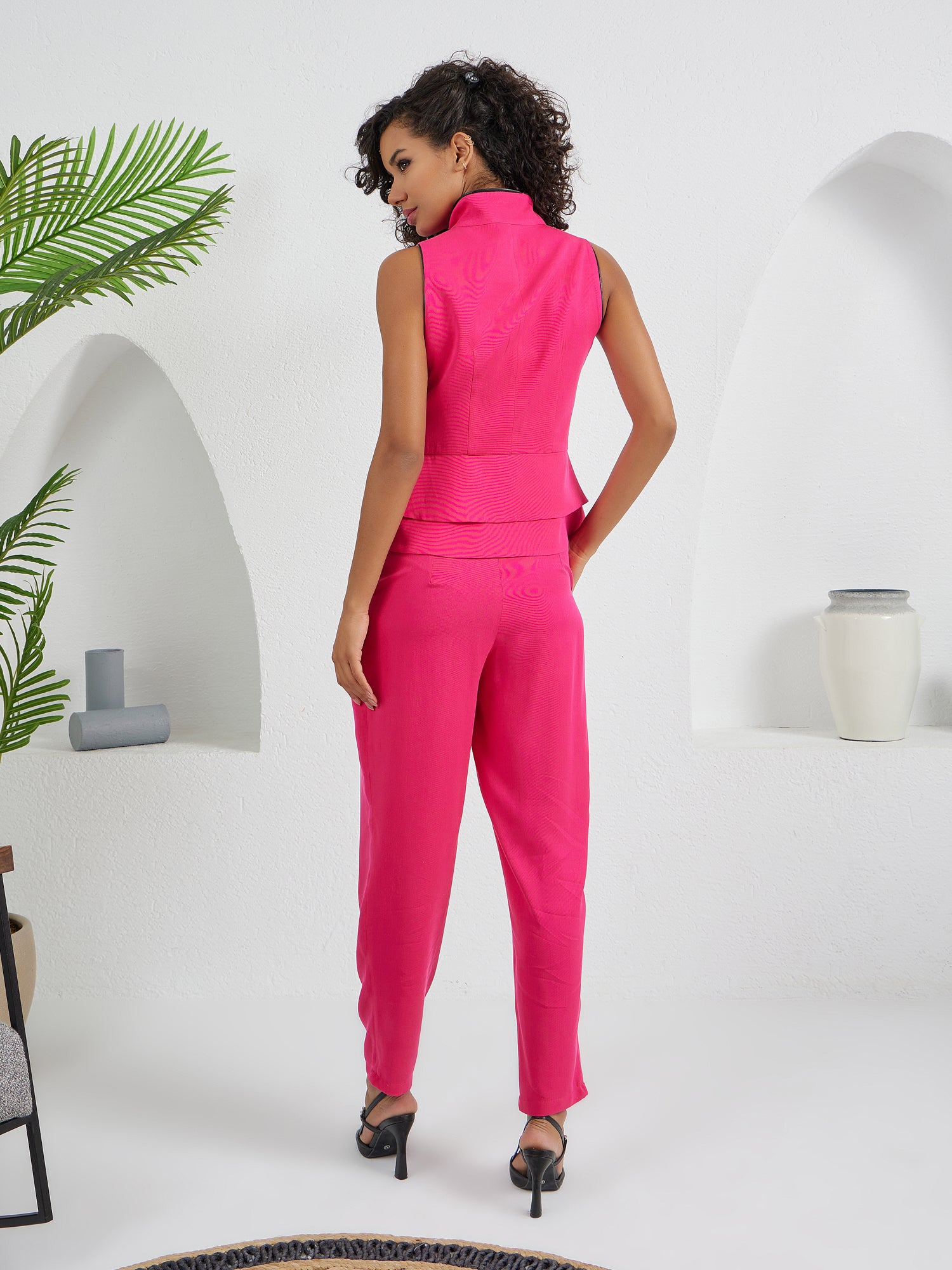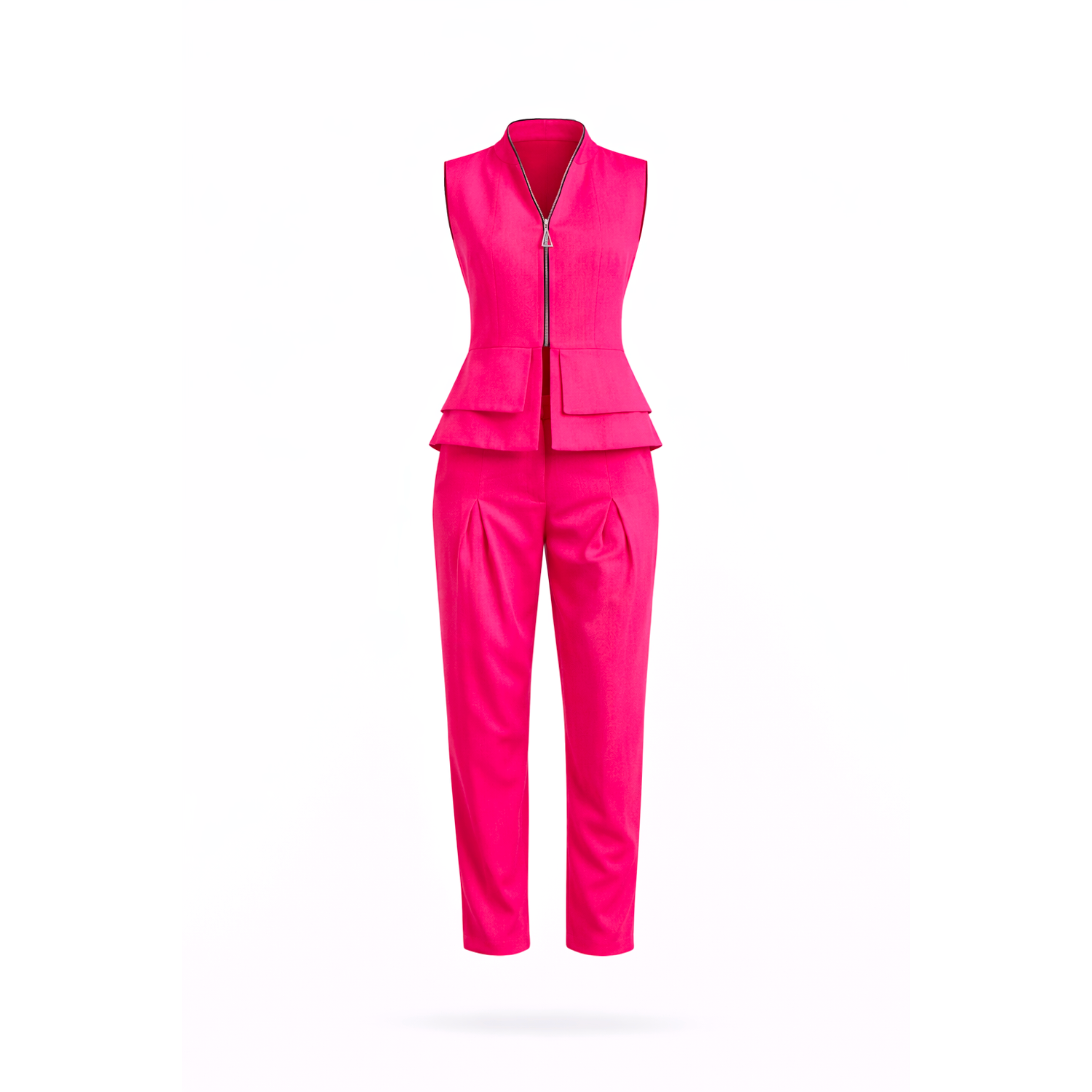 In its vibrant Fuchsia variation, the silk-viscose blend brings bold energy while remaining lightweight and refined. The fabric drapes effortlessly and reflects light with a soft sheen, making this ensemble ideal for warm days that transition seamlessly into elegant evenings. A powerful yet playful statement for women who lead with presence.