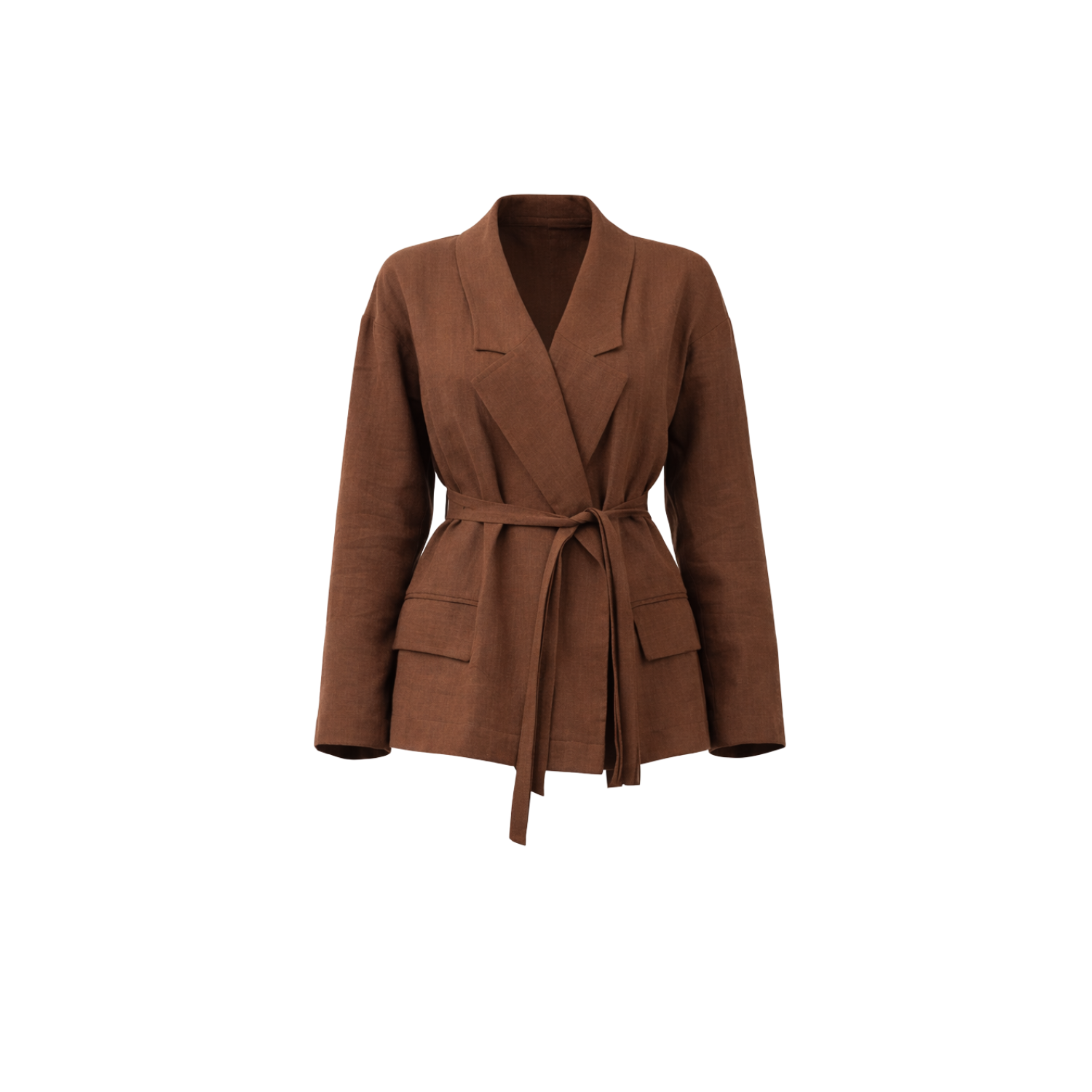Inspired by the quiet strength of armor, the Arma Jacket combines commanding structure with natural fluidity. Its long sleeves, wrap front, and self-tie belt create a strong silhouette softened by breathable linen. Notched lapels lend a tailored edge, while its effortless wrap design allows for adjustable styling — from powerfully cinched to loosely layered.
