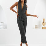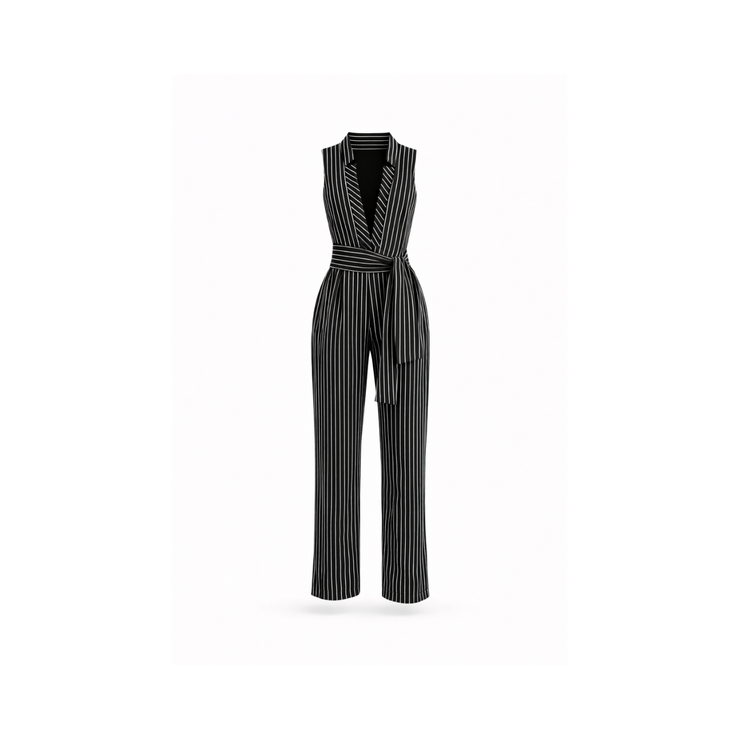 A masterpiece in sophistication, this deconstructed overall jumpsuit by Lumina Eligma redefines elegance. Trompe-l’oeil folds create an illusion of meticulous artistry, complemented by feminine sensibilities and a thoughtfully cut collar. The addition of a carefully crafted fabric belt ensures a defined look, while the wide V cut adds an enigmatic flair. Perfect for a business meeting or a night out, it captures the essence of Lumina Eligma’s refined allure, offering versatility for every occasion
