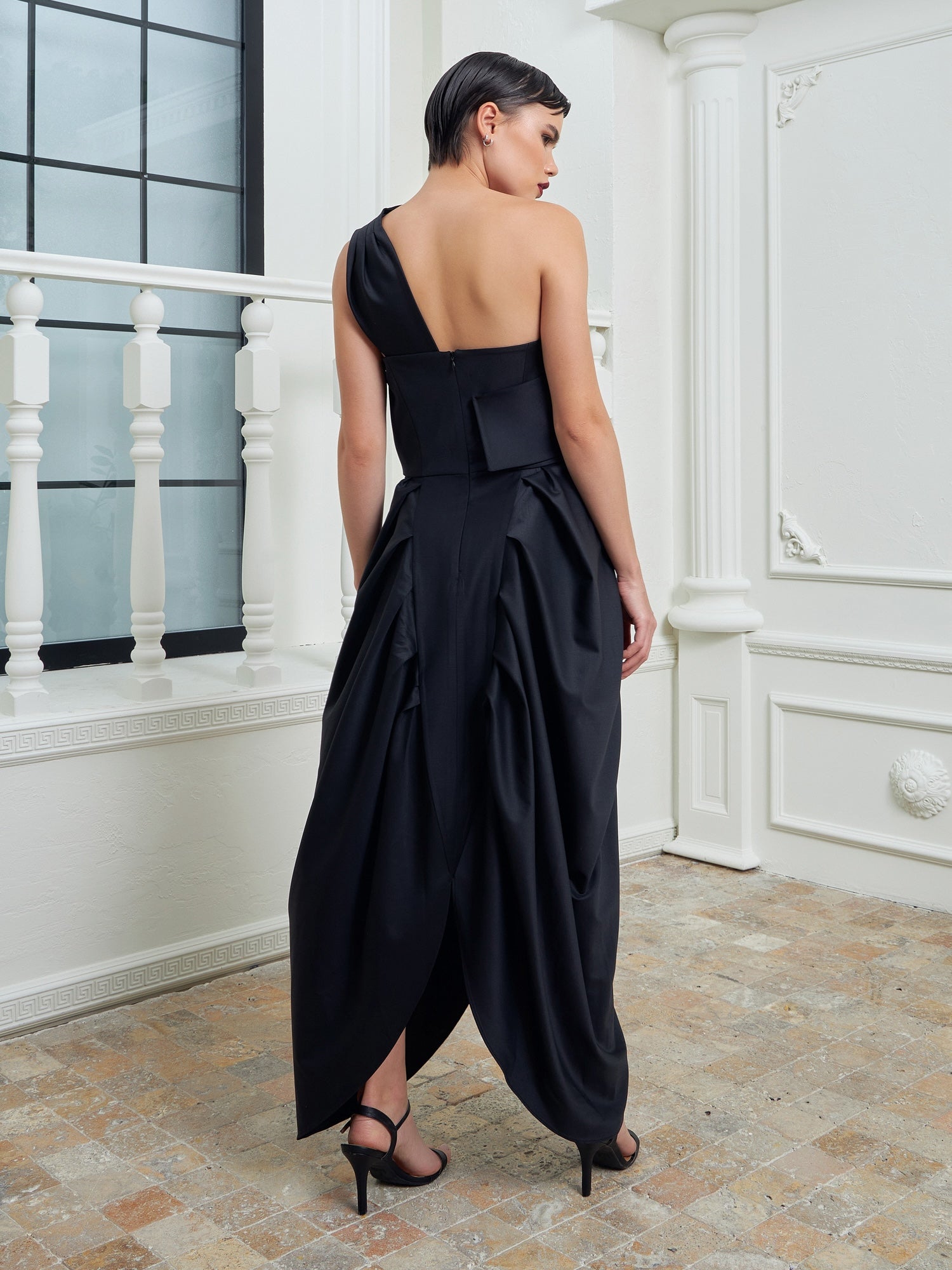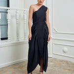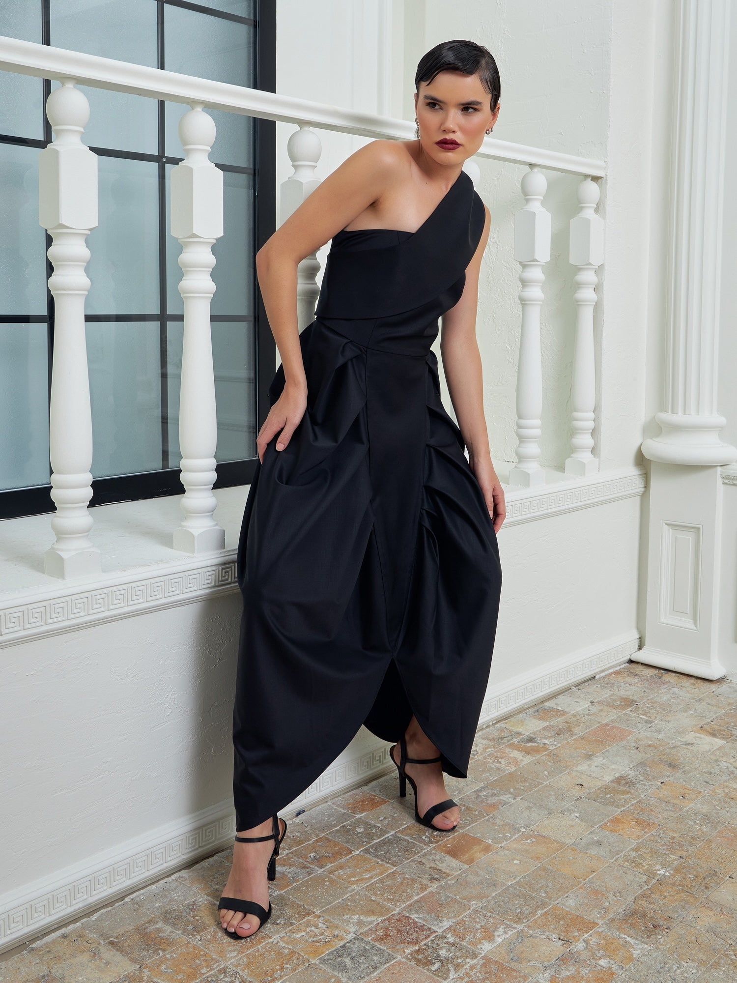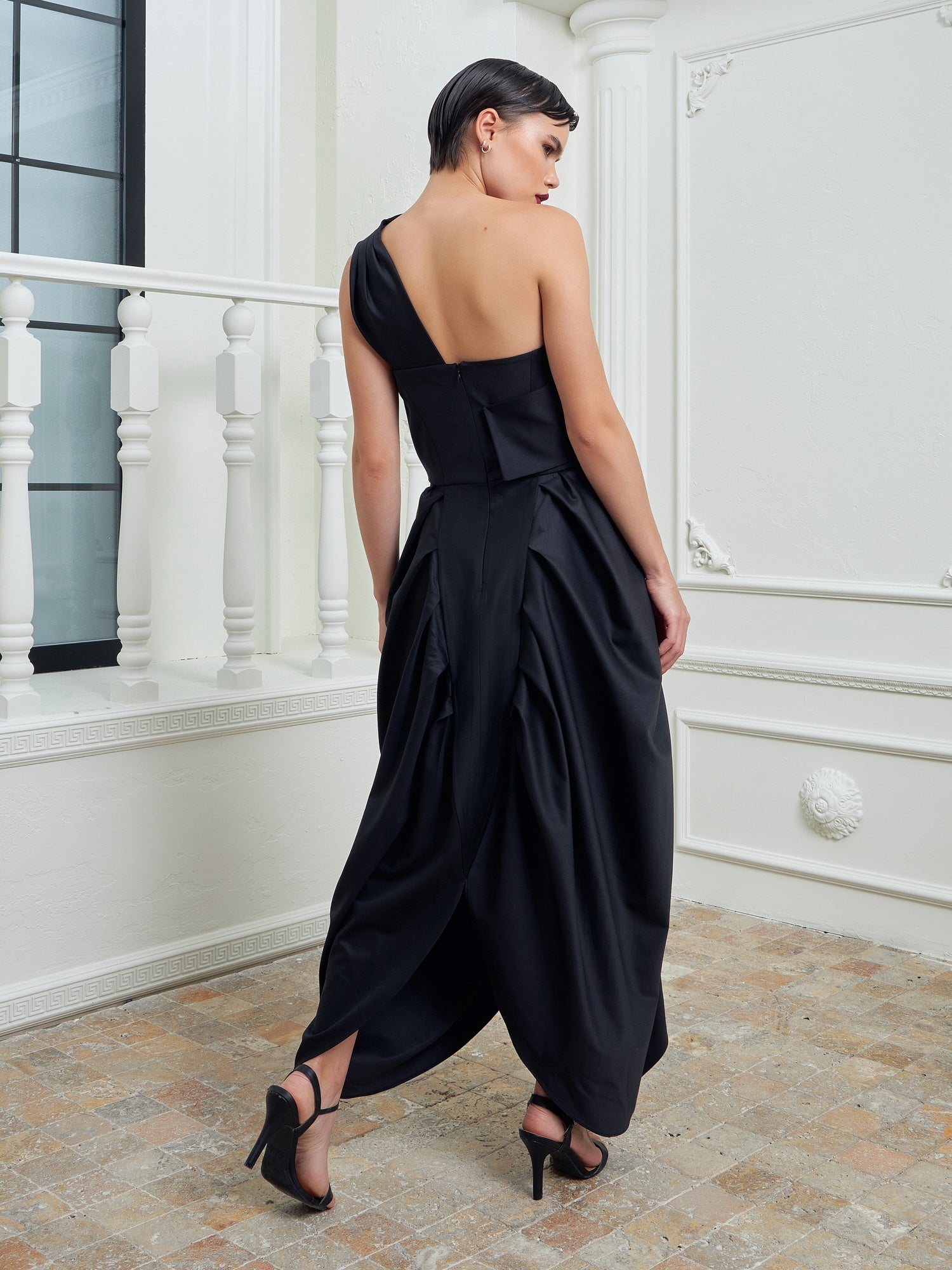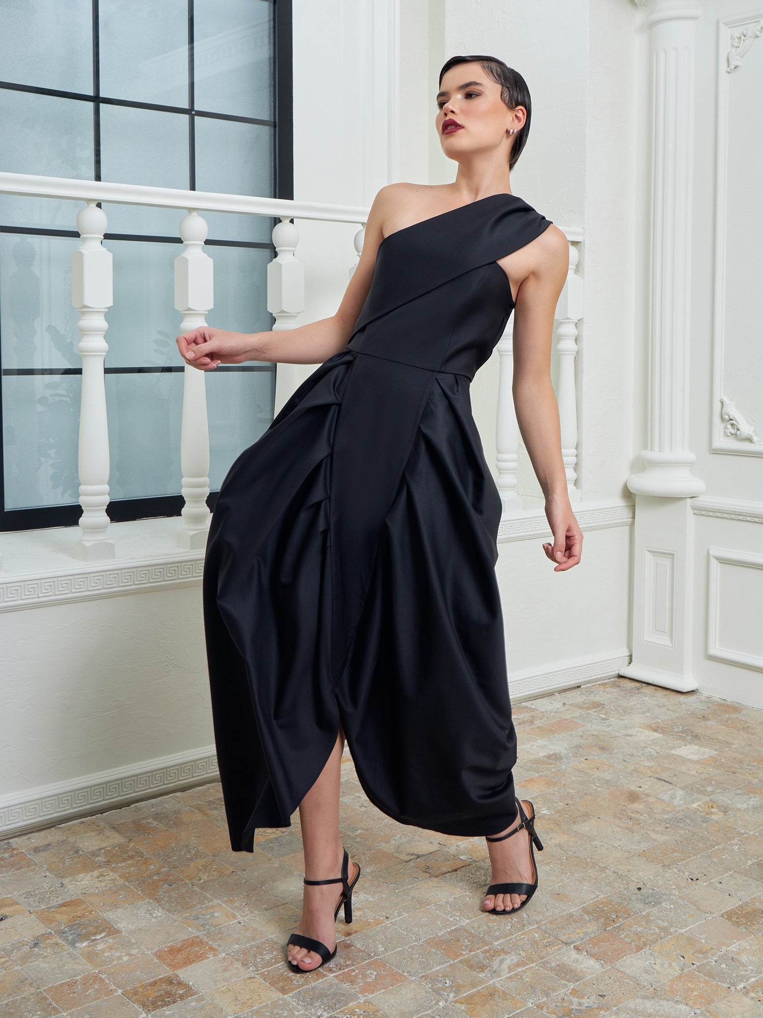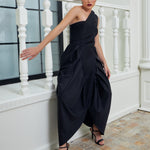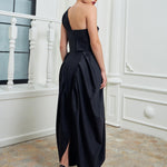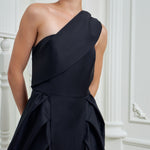 The Dynamic Motion dress features an exquisite play on multi-layering, highlighted by its elegant black one-shoulder diagonal draping and asymmetrical design on the top. The dress’s skirt section contrasts this with symmetrical ruffling elements, creating a harmonious blend of textures. This minimalist yet sophisticated look accentuates your figure, offering a unique and modern take on classic elegance. Perfect for any occasion, the Dynamic Motion dress effortlessly combines style and structure, ensuring you stand out with grace and poise.