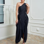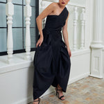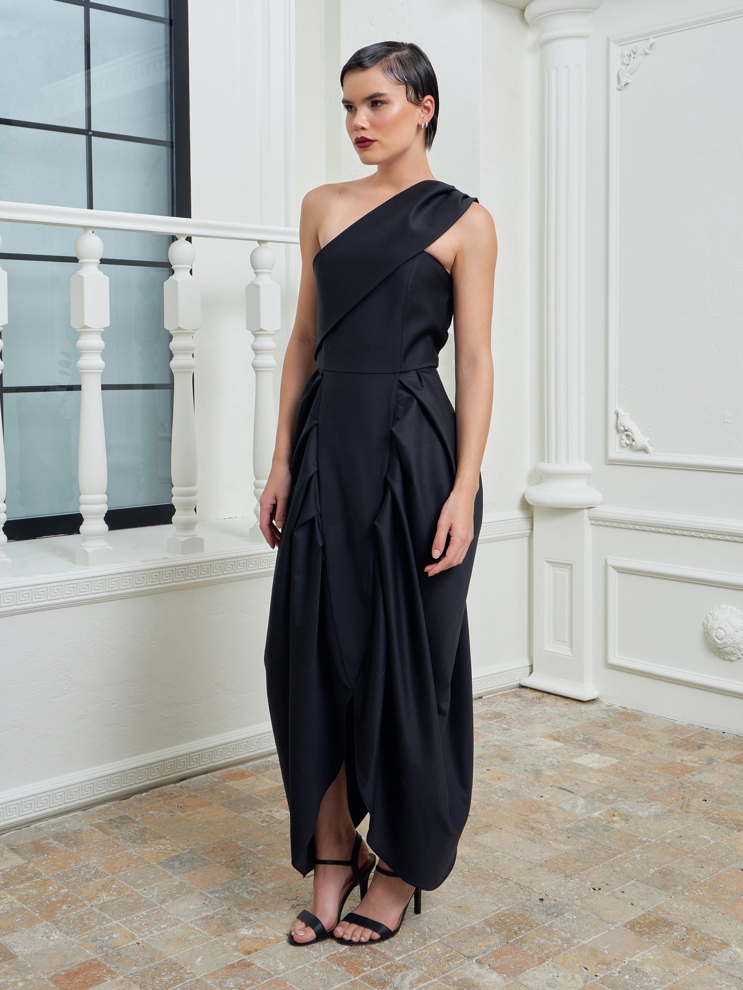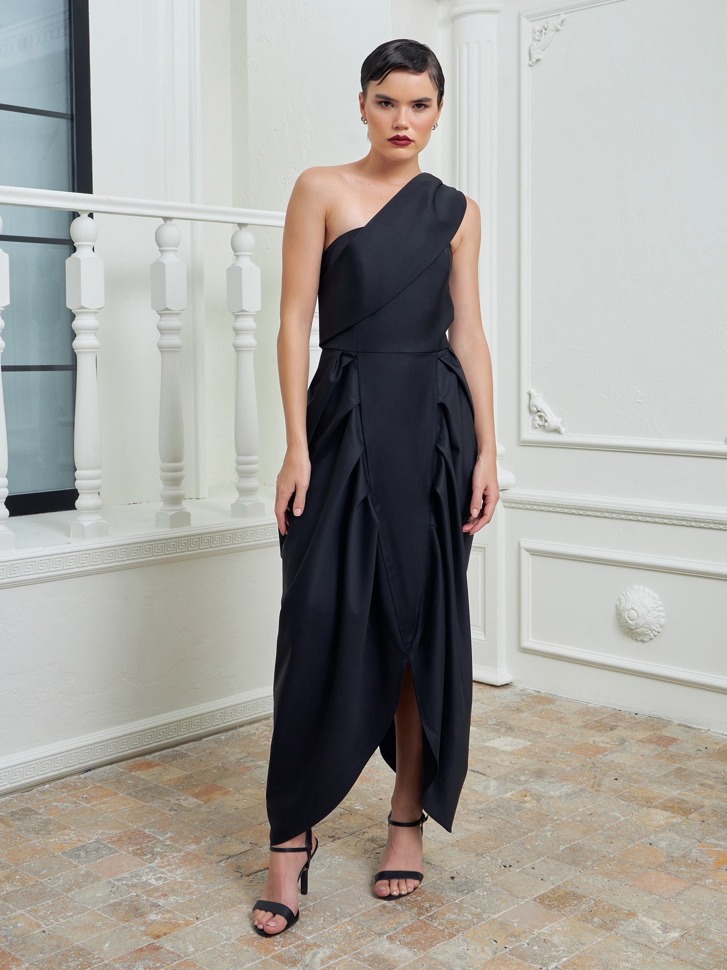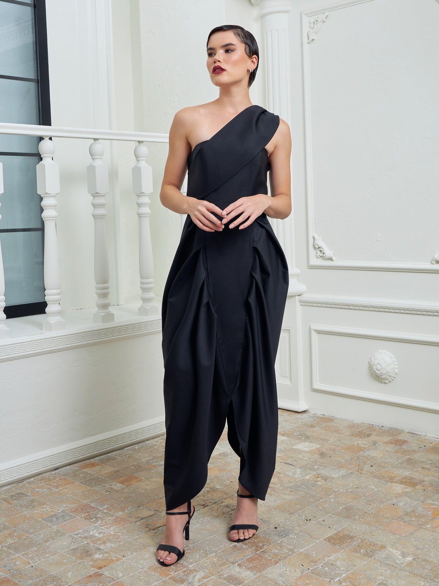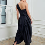 The Dynamic Motion dress features an exquisite play on multi-layering, highlighted by its elegant black one-shoulder diagonal draping and asymmetrical design on the top. The dress’s skirt section contrasts this with symmetrical ruffling elements, creating a harmonious blend of textures. This minimalist yet sophisticated look accentuates your figure, offering a unique and modern take on classic elegance. Perfect for any occasion, the Dynamic Motion dress effortlessly combines style and structure, ensuring you stand out with grace and poise.