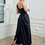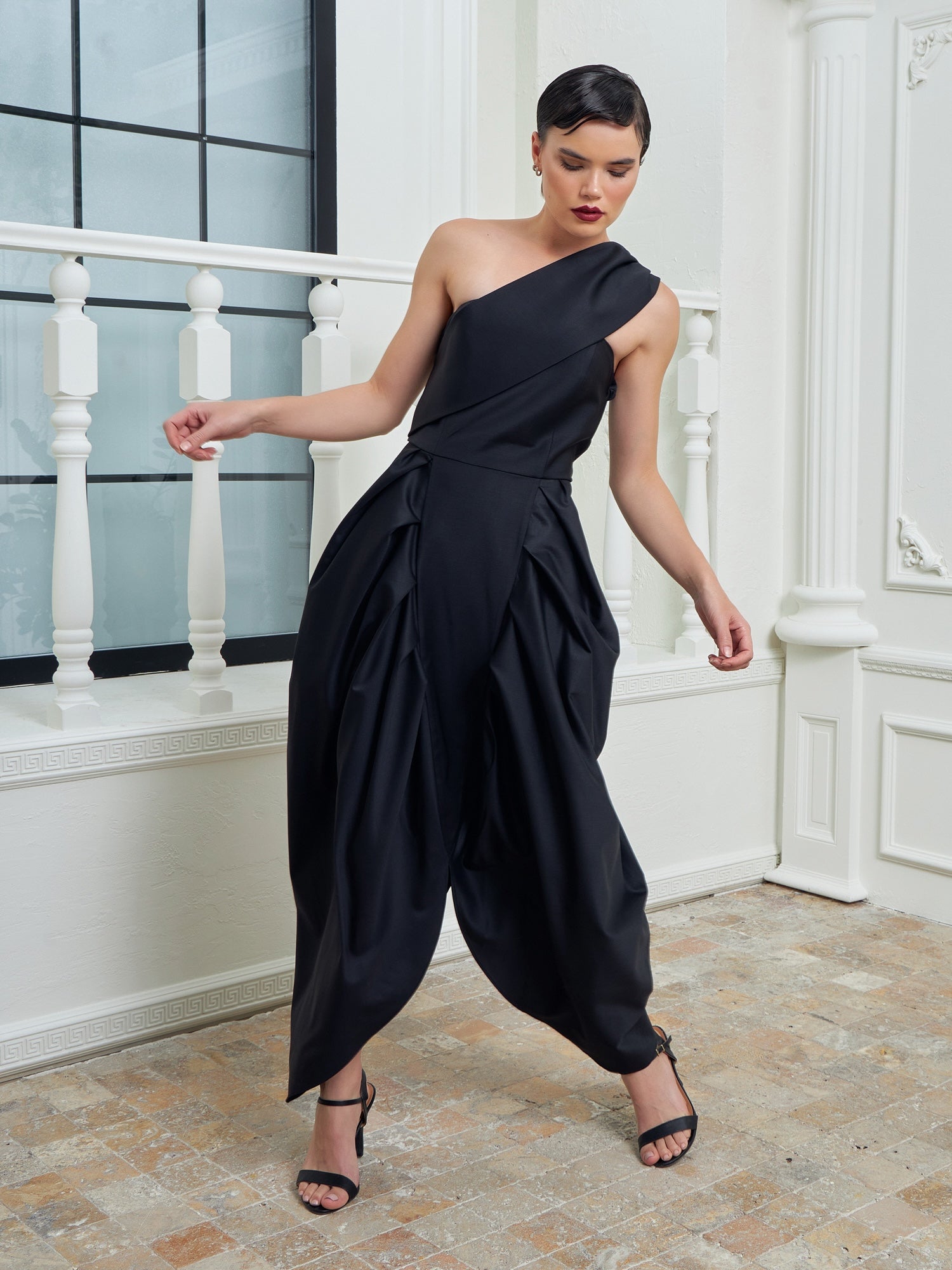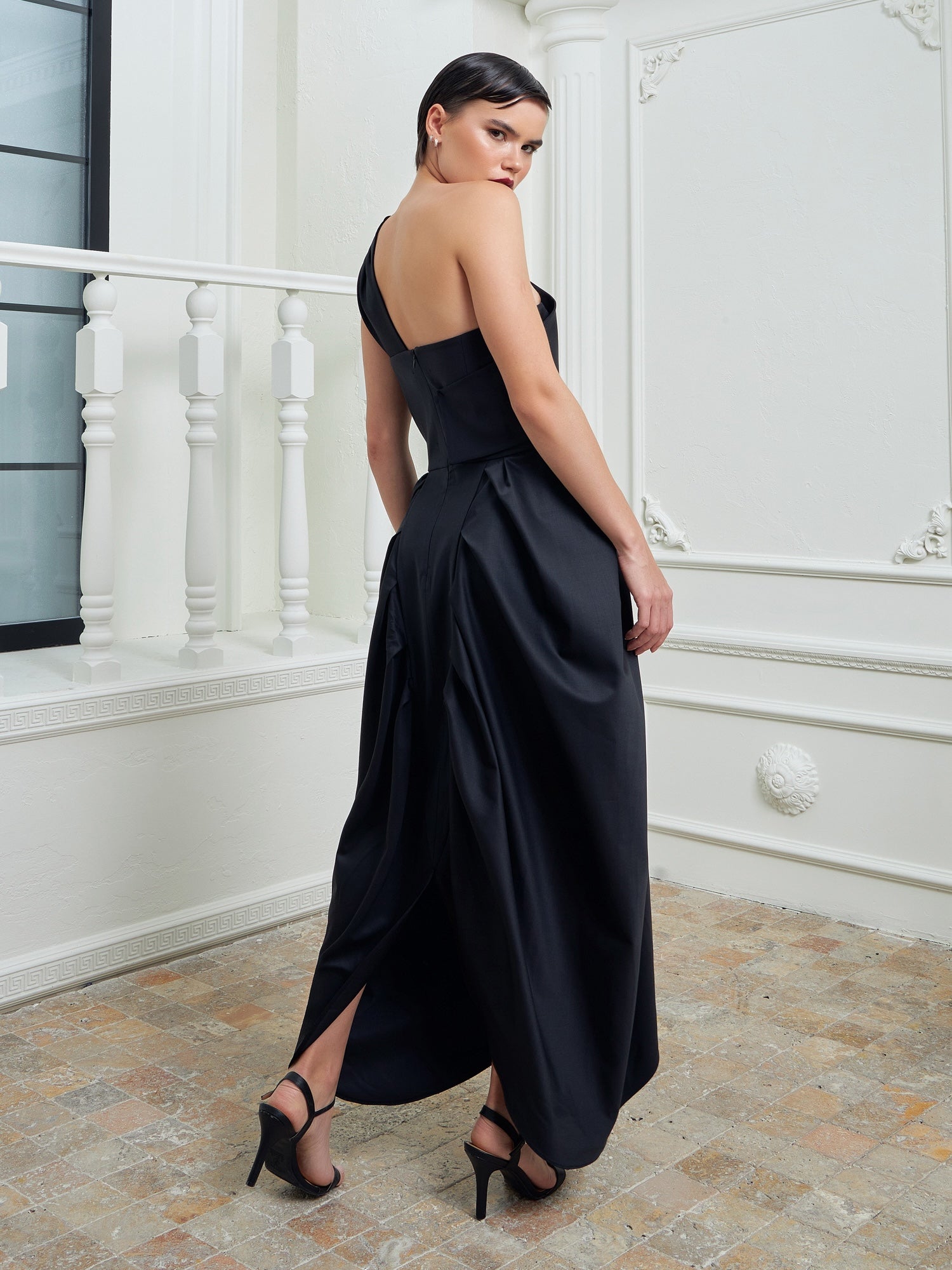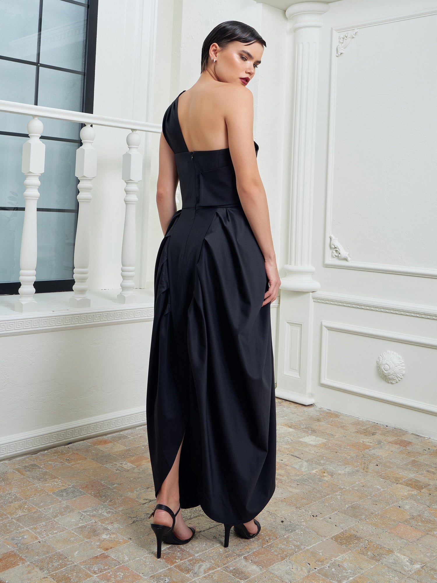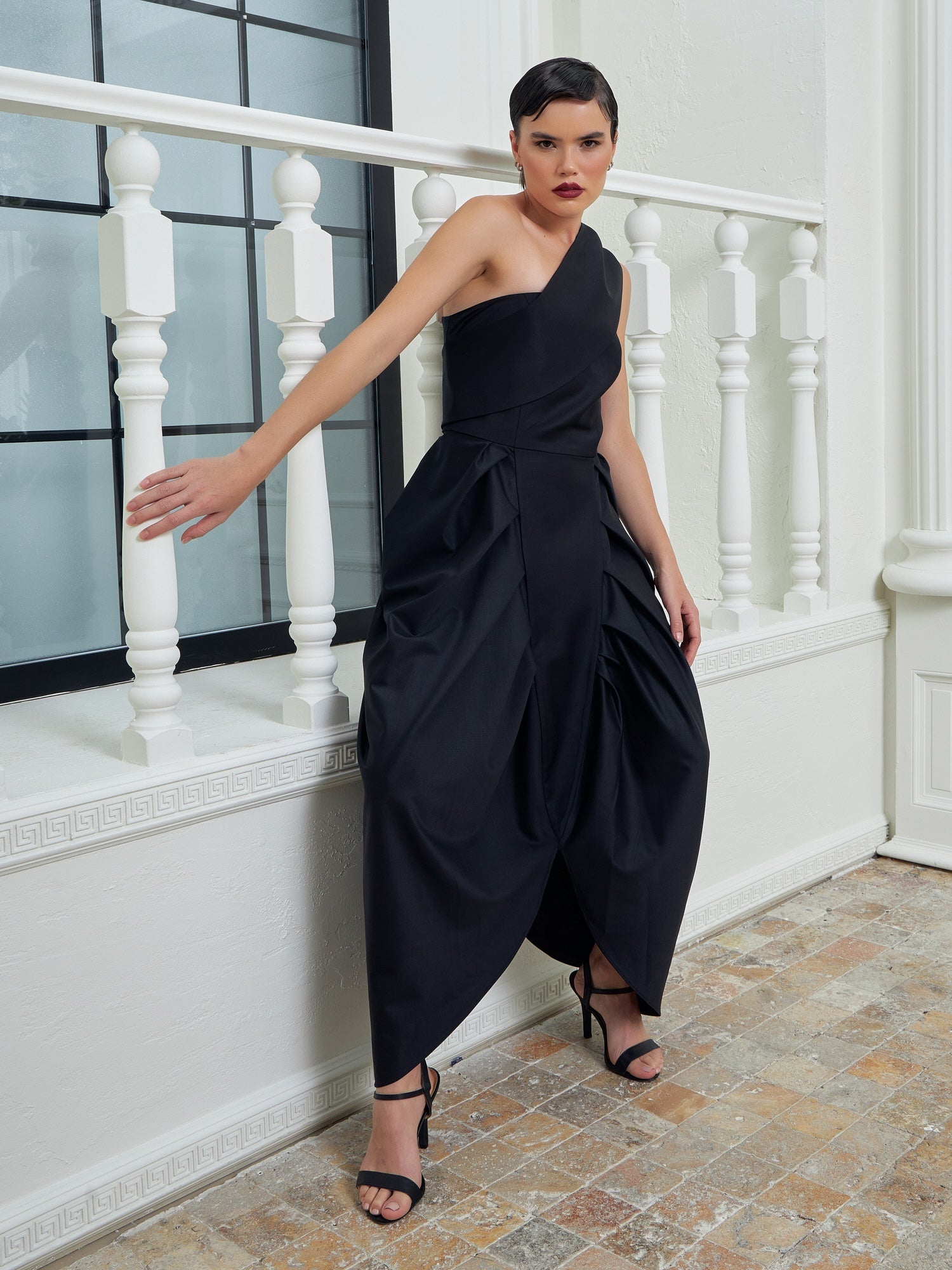 The Dynamic Motion dress features an exquisite play on multi-layering, highlighted by its elegant black one-shoulder diagonal draping and asymmetrical design on the top. The dress’s skirt section contrasts this with symmetrical ruffling elements, creating a harmonious blend of textures. This minimalist yet sophisticated look accentuates your figure, offering a unique and modern take on classic elegance. Perfect for any occasion, the Dynamic Motion dress effortlessly combines style and structure, ensuring you stand out with grace and poise.