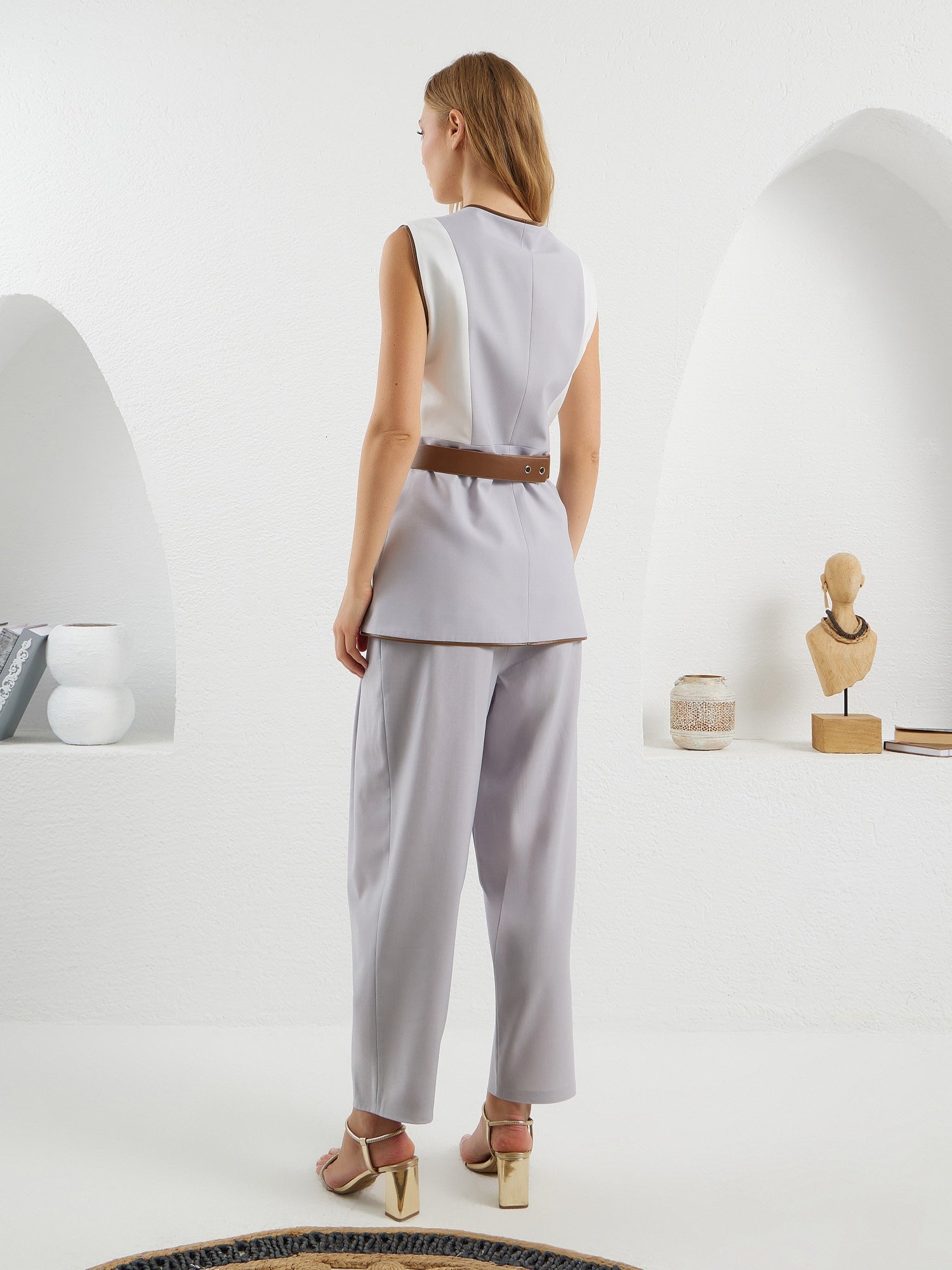 The design is finished with a contrasting belted waist that shapes the body with ease, while subtle edge detailing adds definition without excess. The light gray base is balanced by crisp white accents, creating a composed, modern palette that feels timeless and versatile.
