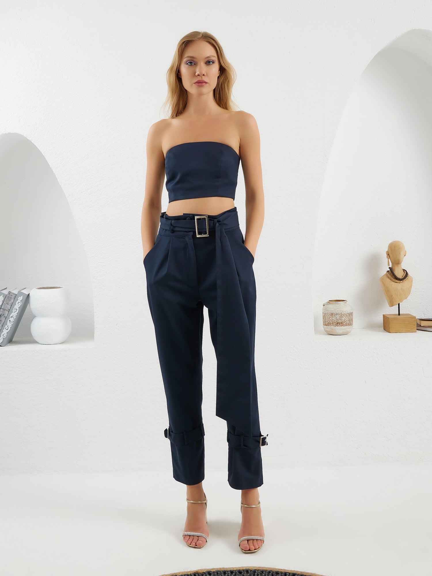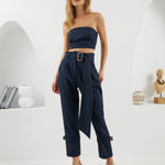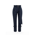A chic high-waisted pants featuring a fabric belt imitating the movements of a matador  and intricate pleating for added dimension. With adjustable belts at the bottom, you can style the pants from formal to casual effortlessly.