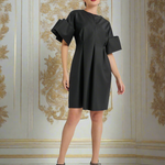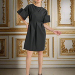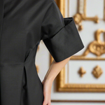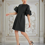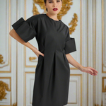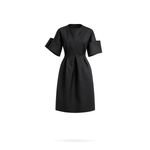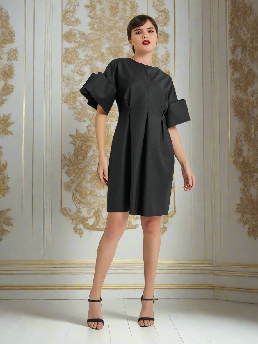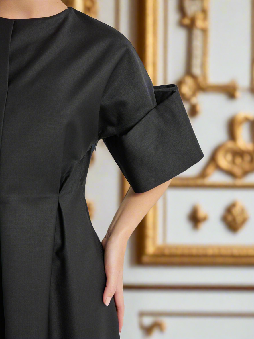 The Neoteric Dress – Black is defined by architectural restraint and sculptural precision. Designed with a structured fold collar and pronounced flared shoulders, the dress establishes a strong, composed silhouette that balances modern tailoring with understated femininity.