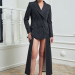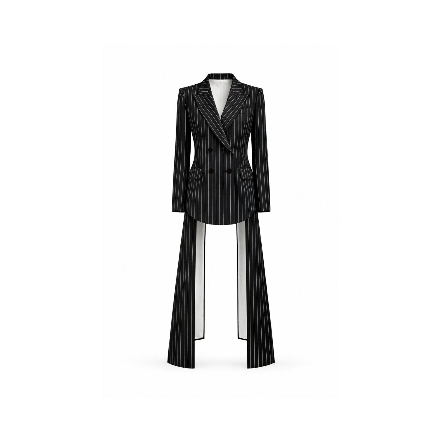 The timeless black and white pinstripe pattern introduces a refined contrast, highlighting the architectural cut and precision tailoring. Designed to be worn as a standalone statement dress or layered over tailored trousers, this piece transitions effortlessly from formal settings to elevated evening occasions.
