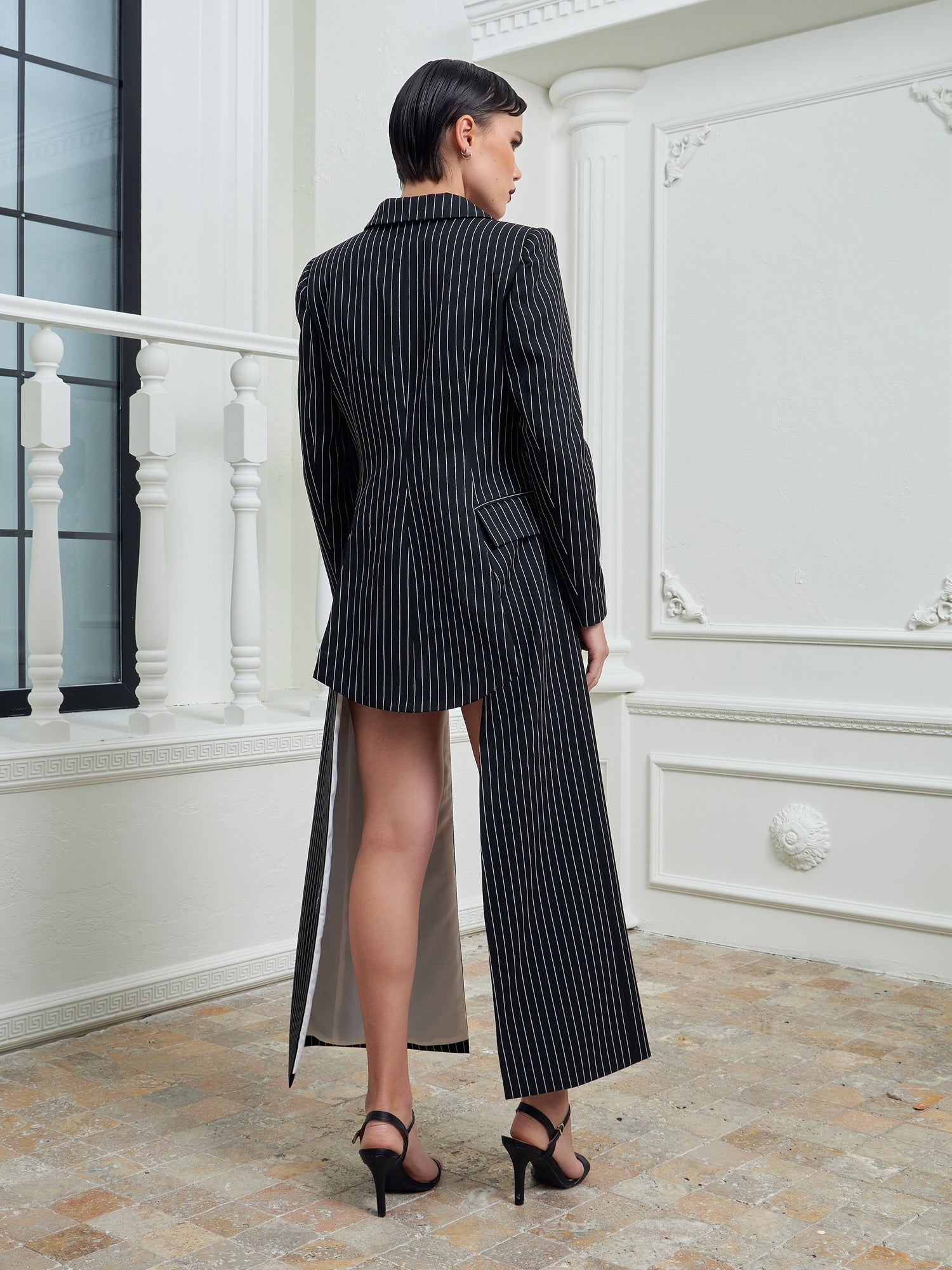 The Opera Blazer Dress in Black & White Stripes reinterprets classic tailoring through a contemporary, sculptural lens. Designed as a suit-inspired blazer dress, it features elongated side accents that create fluid movement while visually elongating the silhouette. The sharp structure of the blazer is softened by rhythmic vertical lines, resulting in a look that feels powerful yet elegant.