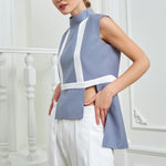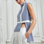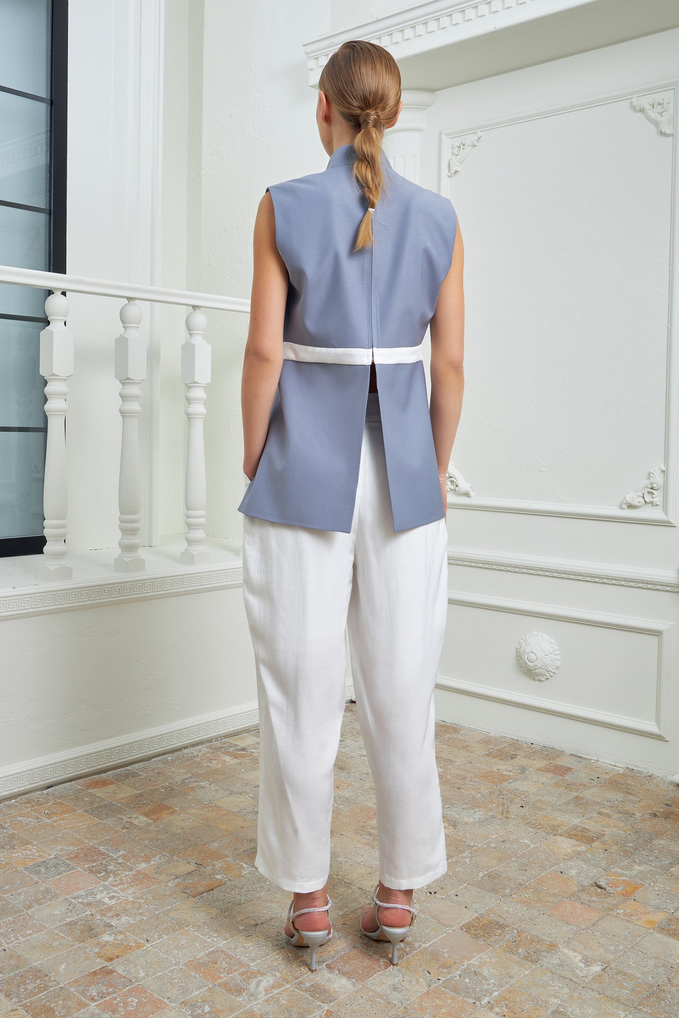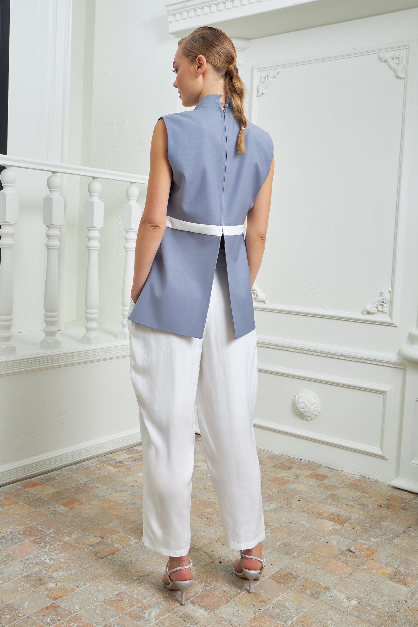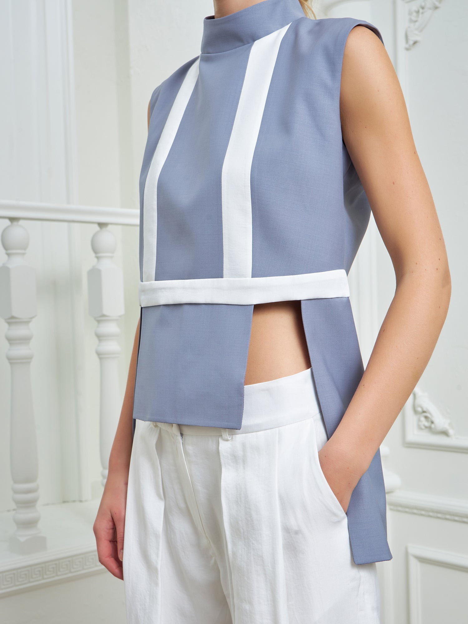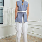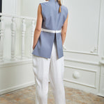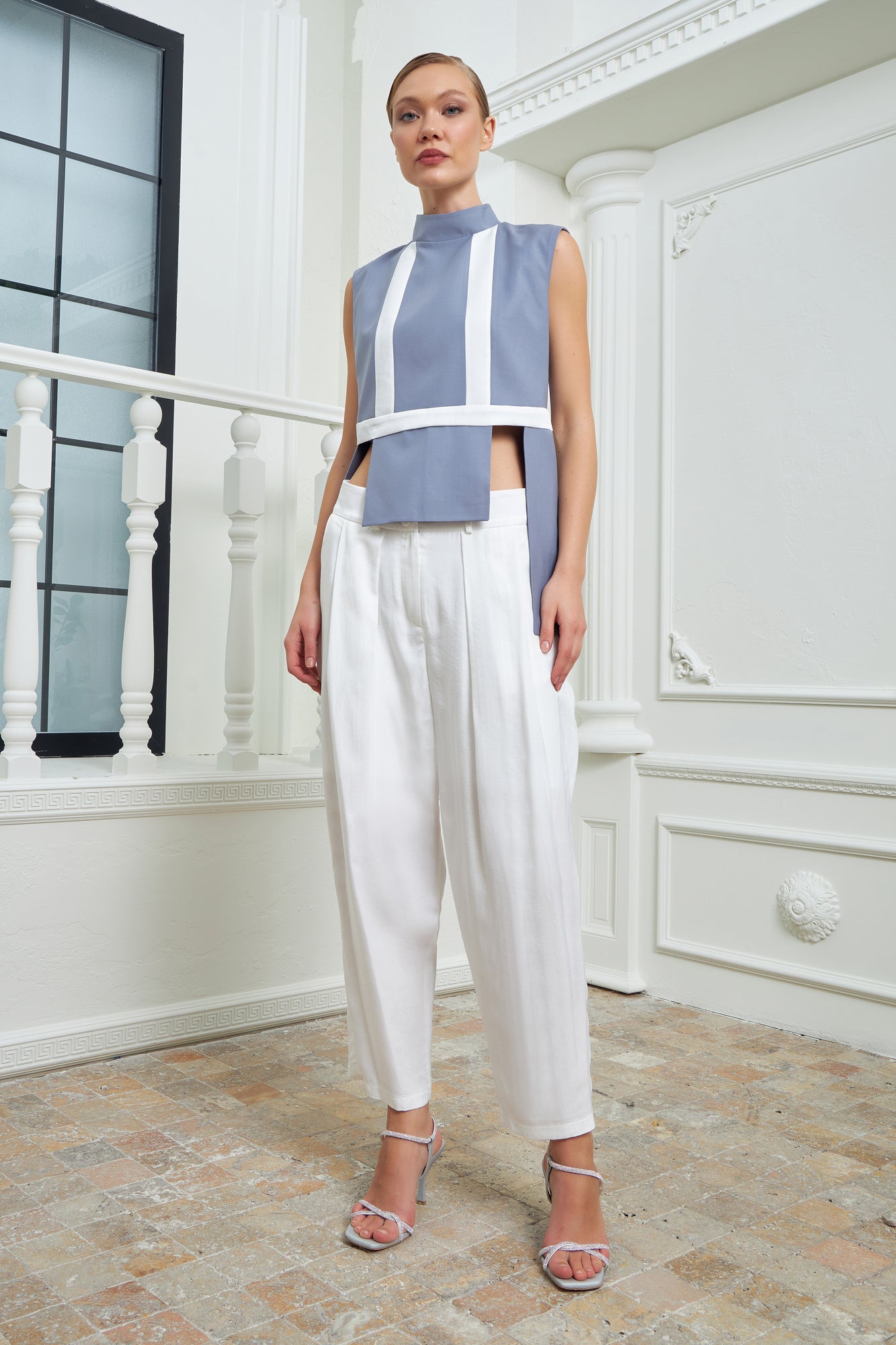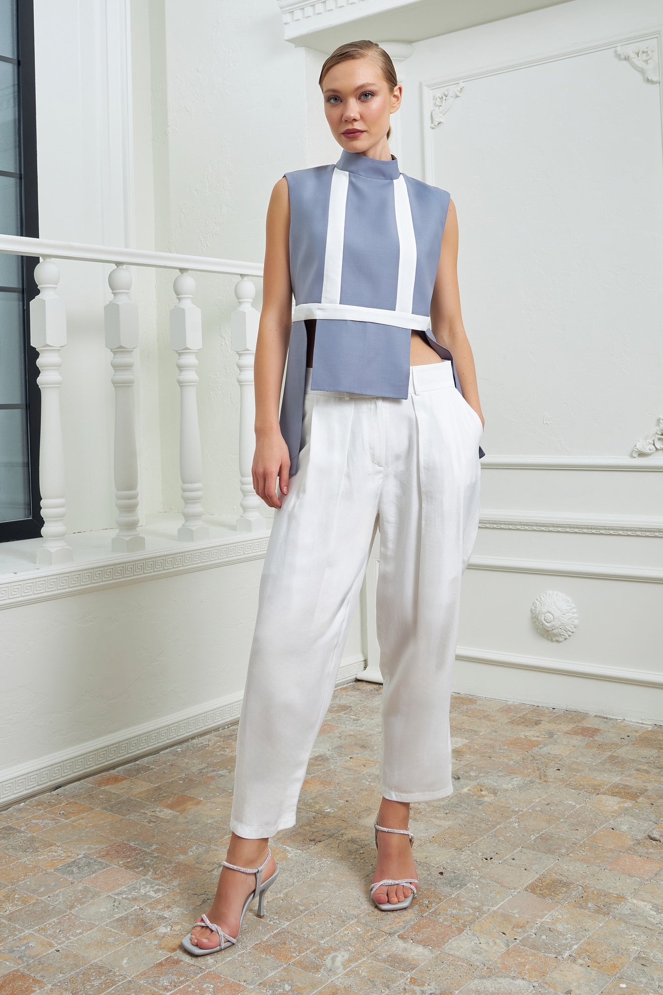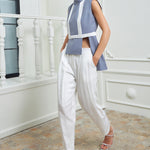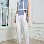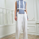 Chic high-waisted pants designed to elongate and flatter, featuring two parallel layers that add dimension and sophistication to the piece. Made in a silky white fabric for a fresh look.