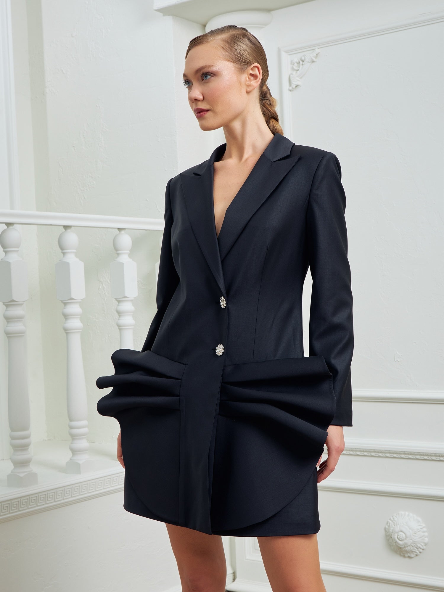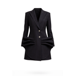 Rendered in deep black, this blazer dress becomes an emblem of timeless power. It transcends occasion—equally striking as an evening statement, a gallery opening piece, or a modern power look. Designed not to follow trends, but to challenge them.