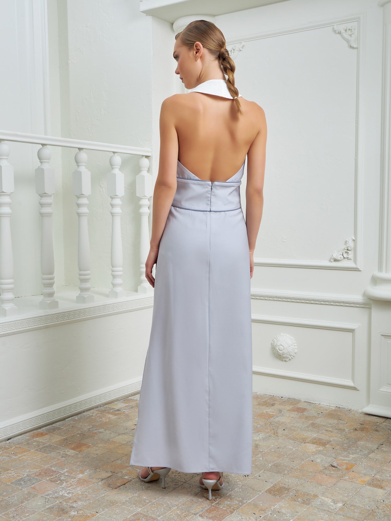 An elegant and sophisticated piece designed to make a lasting impression. This sleeveless, floor-length fine merino wool dress features a stunning layering of gray palettes, exuding a sense of refined elegance. The high leg slit adds a touch of allure, while the incorporated waist belt cinches in the dress to accentuate the wearer's silhouette. With a deep neckline and bold slits, this dress balances elegance with a hint of daring, creating a captivating look that is both timeless and modern. The meticulously crafted layers and luxurious fabric make the Architect Dress a standout choice for any formal occasion, embodying sophistication and style.