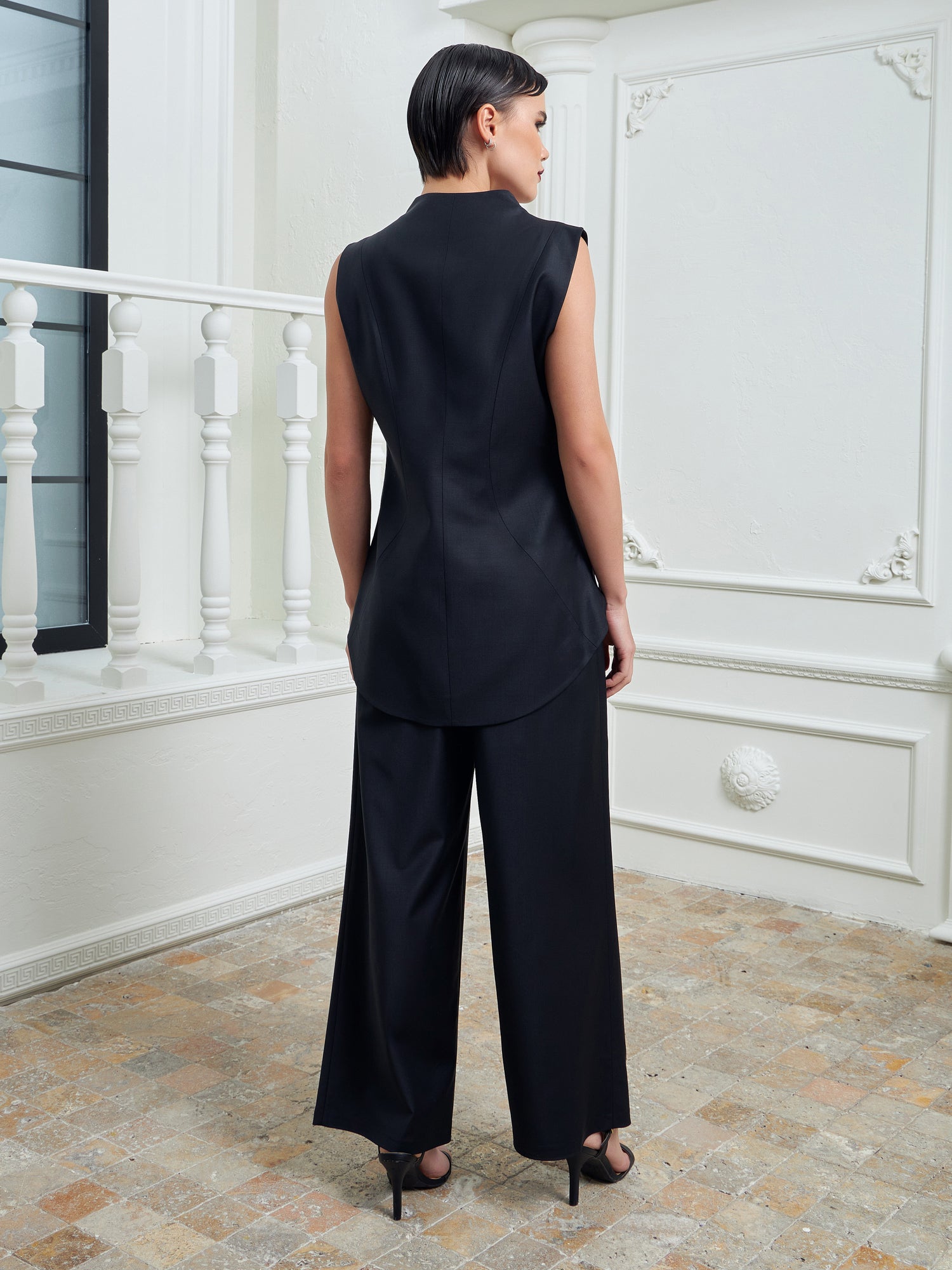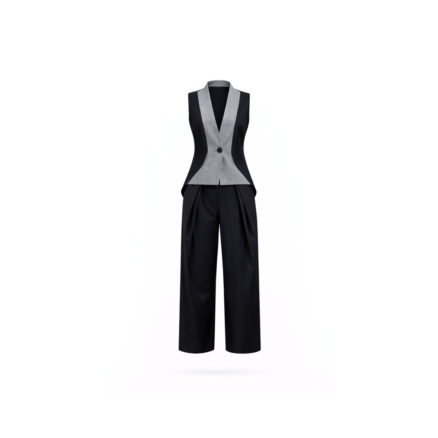 The Gathered Suit Vest & Pants Ensemble explores layered tailoring through contrast, structure, and quiet strength. Designed to play with dimension, the vest and pleated pants create a gathered silhouette that feels confident, architectural, and fluid. A raised collar and sculpted lines elevate the ensemble while maintaining effortless elegance.
