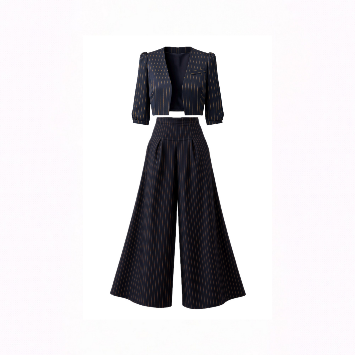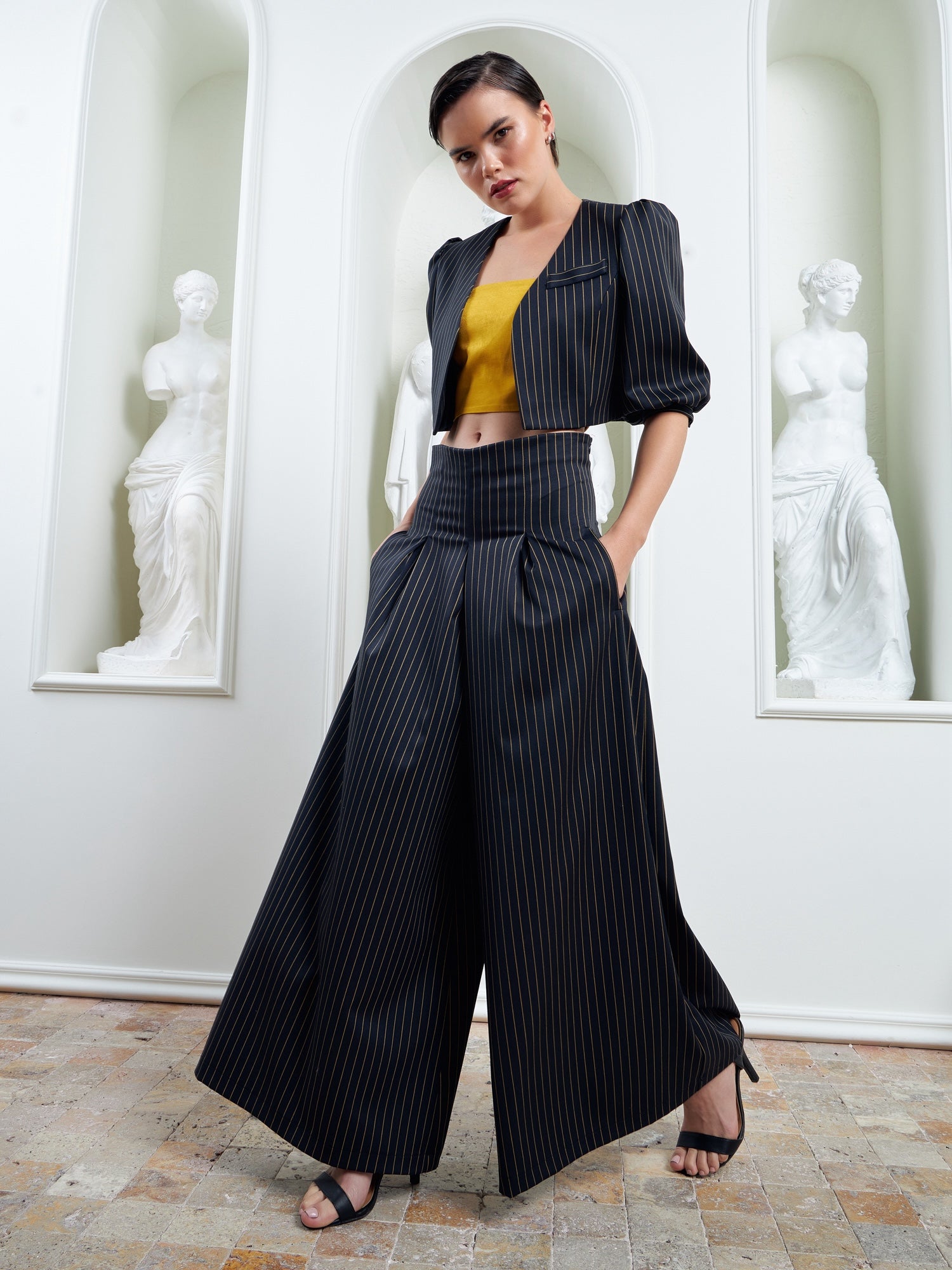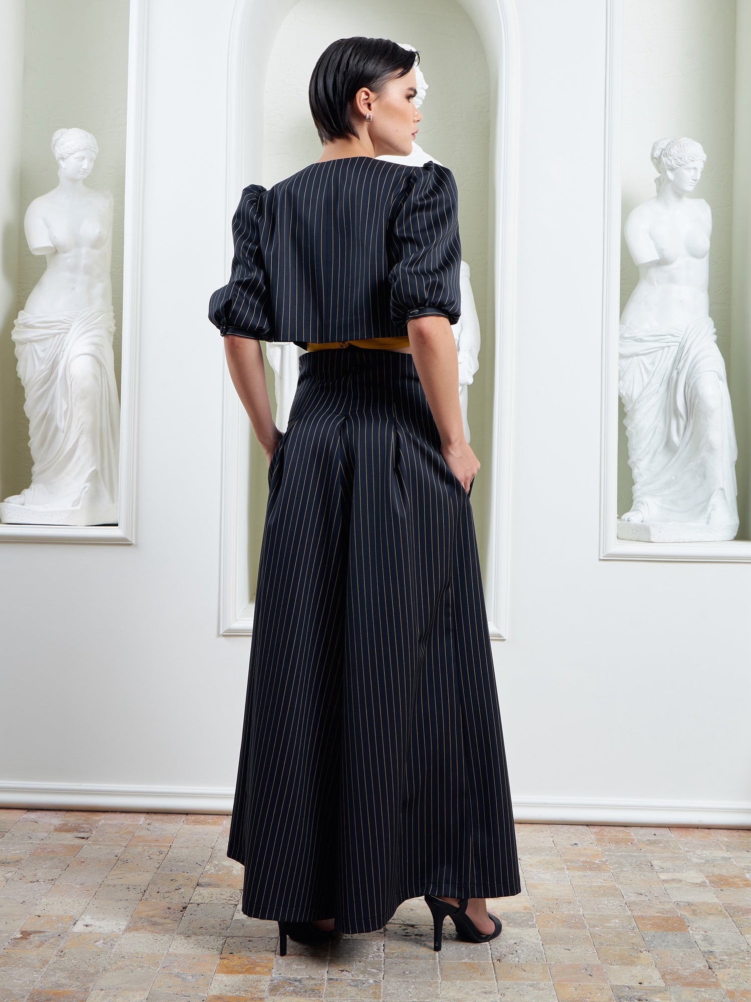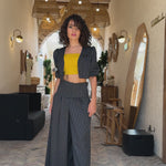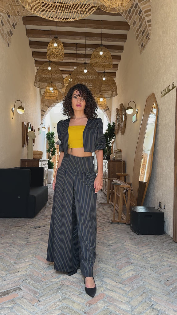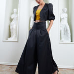 Power in motion, The Palazzo Pants embody fluid strength and modern authority. Crafted from a refined merino wool blend, they balance structure with effortless movement as the wide-leg silhouette flows with every step while keeping a sculpted, architectural presence. A high-rise waist elongates the frame and sharpens posture, while the drape feels soft yet controlled. Wear them as part of a power suit or as a standalone statement, transitioning seamlessly from boardroom precision to evening elegance. Features: Merino wool blend with structured drape, high-waisted wide-leg silhouette, precision tailoring, clean finish with invisible closure.