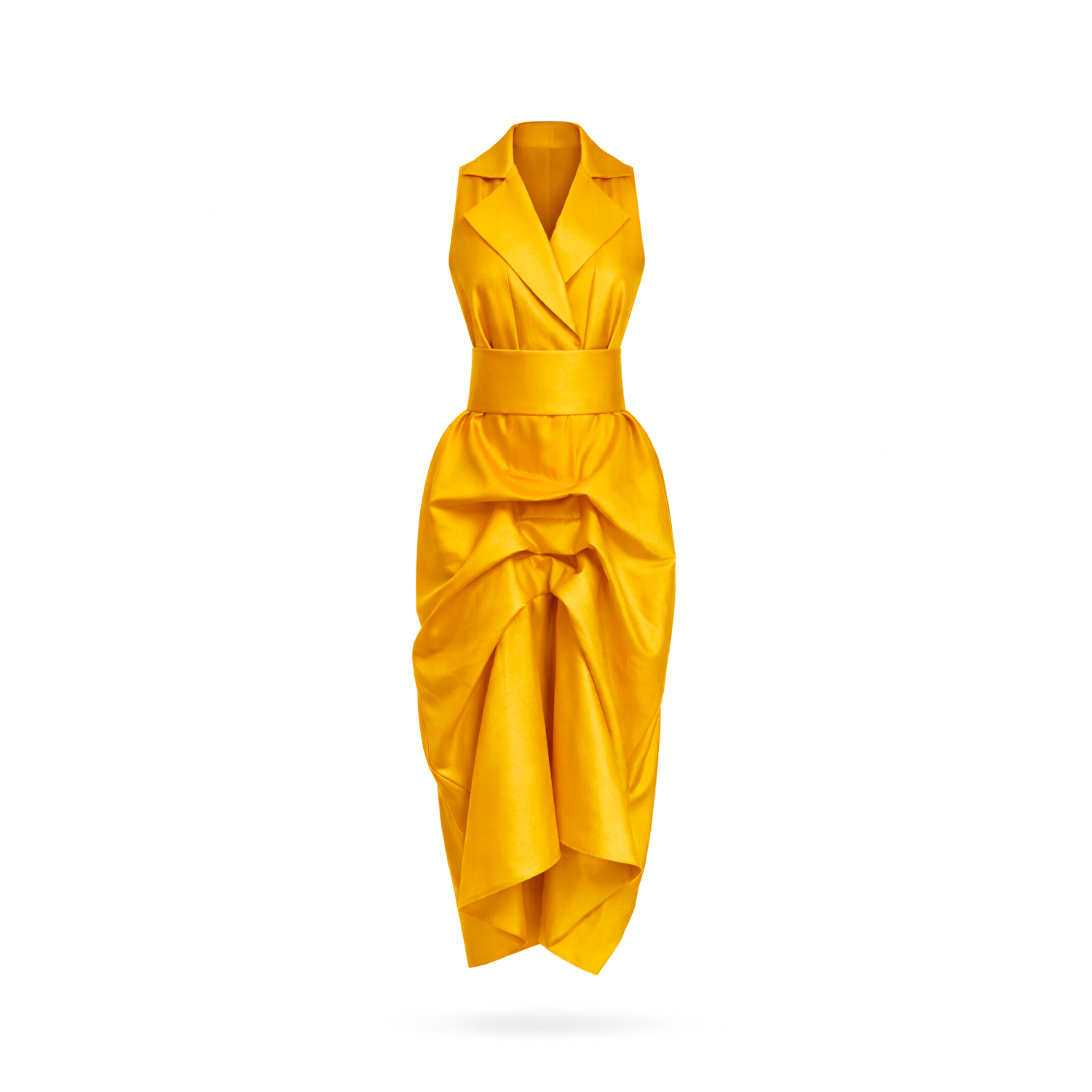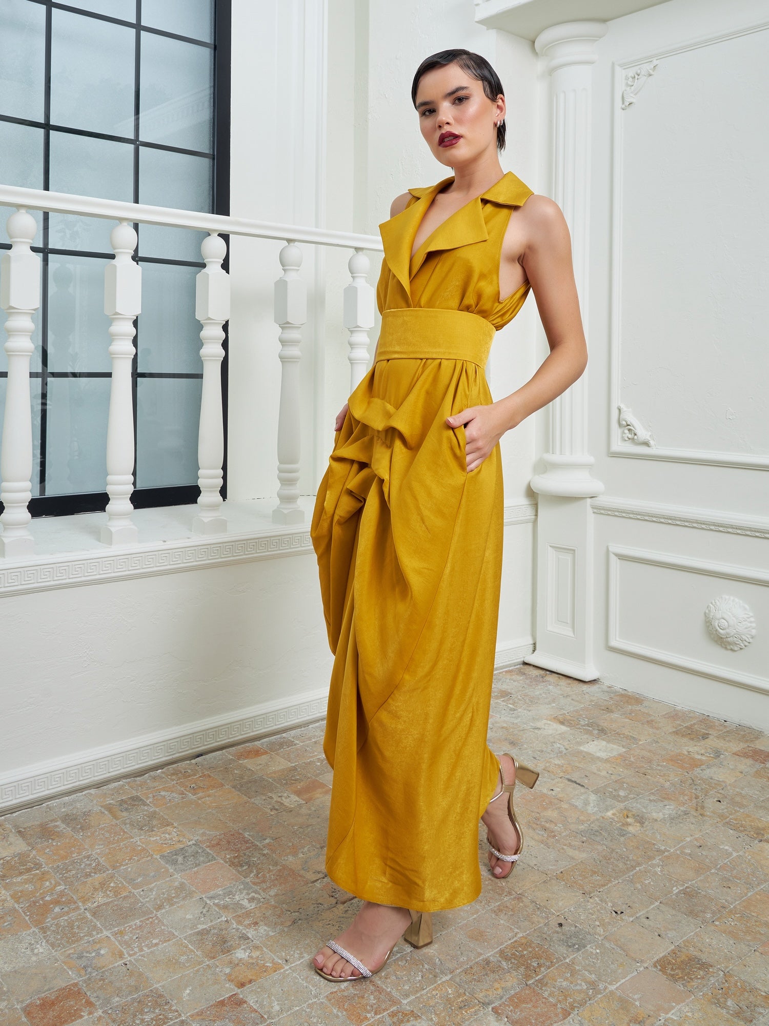 Rendered in a rich mustard hue, this design delivers a bold yet refined statement, ideal for formal occasions and elevated evening settings.