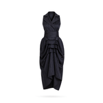 A refined expression of modern tailoring, the Tuxedo Dress reinterprets classic tuxedo structure through a feminine, architectural lens. Featuring a sleek sleeveless bodice and a sculpted waist, the design balances sharp tailoring with fluid elegance.