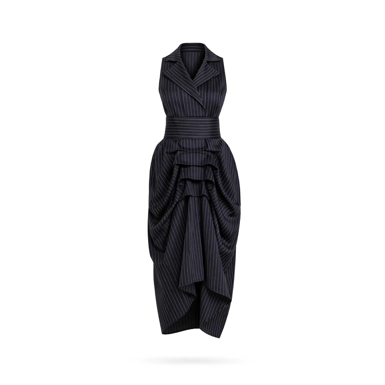 The oversized draped skirt introduces movement and volume, creating a powerful silhouette that flows effortlessly with every step. A wide fabric belt cinches the waist, defining the form while enhancing the clean, elongated lines of the dress.