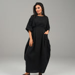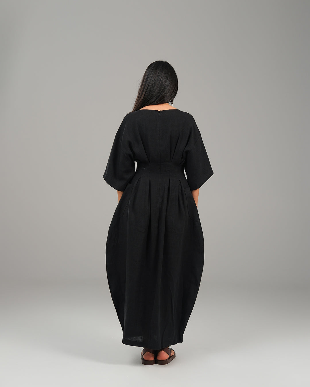 Draped elegance meets purposeful structure in this midi dress designed with a sculptural silhouette. Tapered at the waist with soft, architectural folds that gather and fall, it offers ease of movement without compromising form. The clean neckline and relaxed sleeves bring a quiet strength to the piece—an effortless balance of softness and statement.