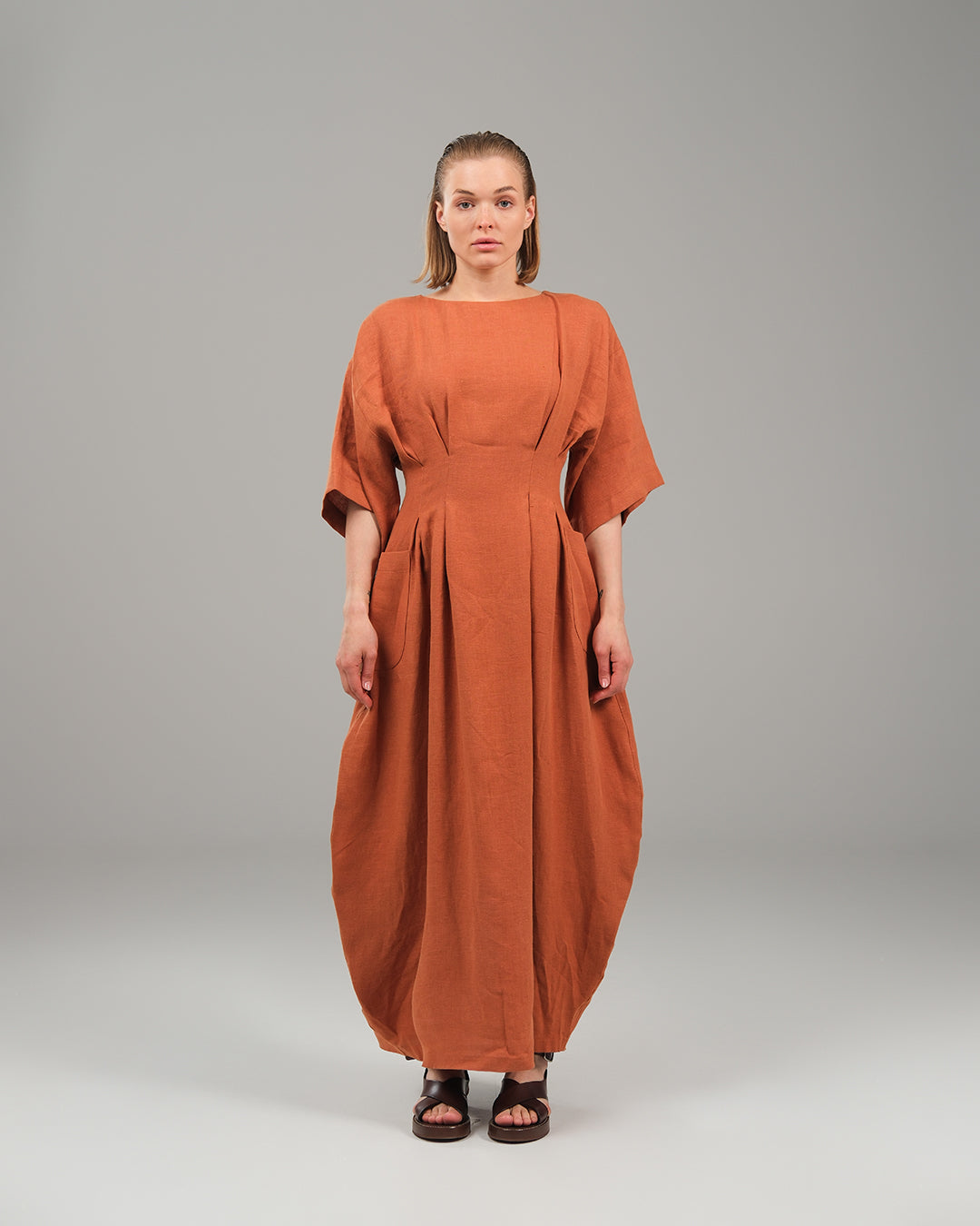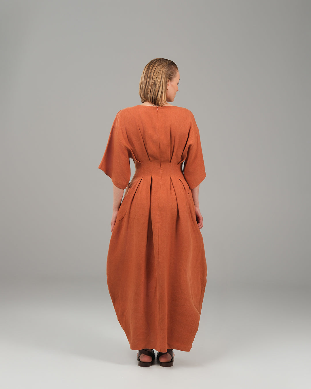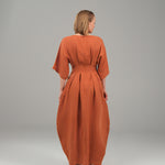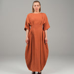 Draped elegance meets purposeful structure in this midi dress designed with a sculptural silhouette. Tapered at the waist with soft, architectural folds that gather and fall, it offers ease of movement without compromising form. The clean neckline and relaxed sleeves bring a quiet strength to the piece—an effortless balance of softness and statement.