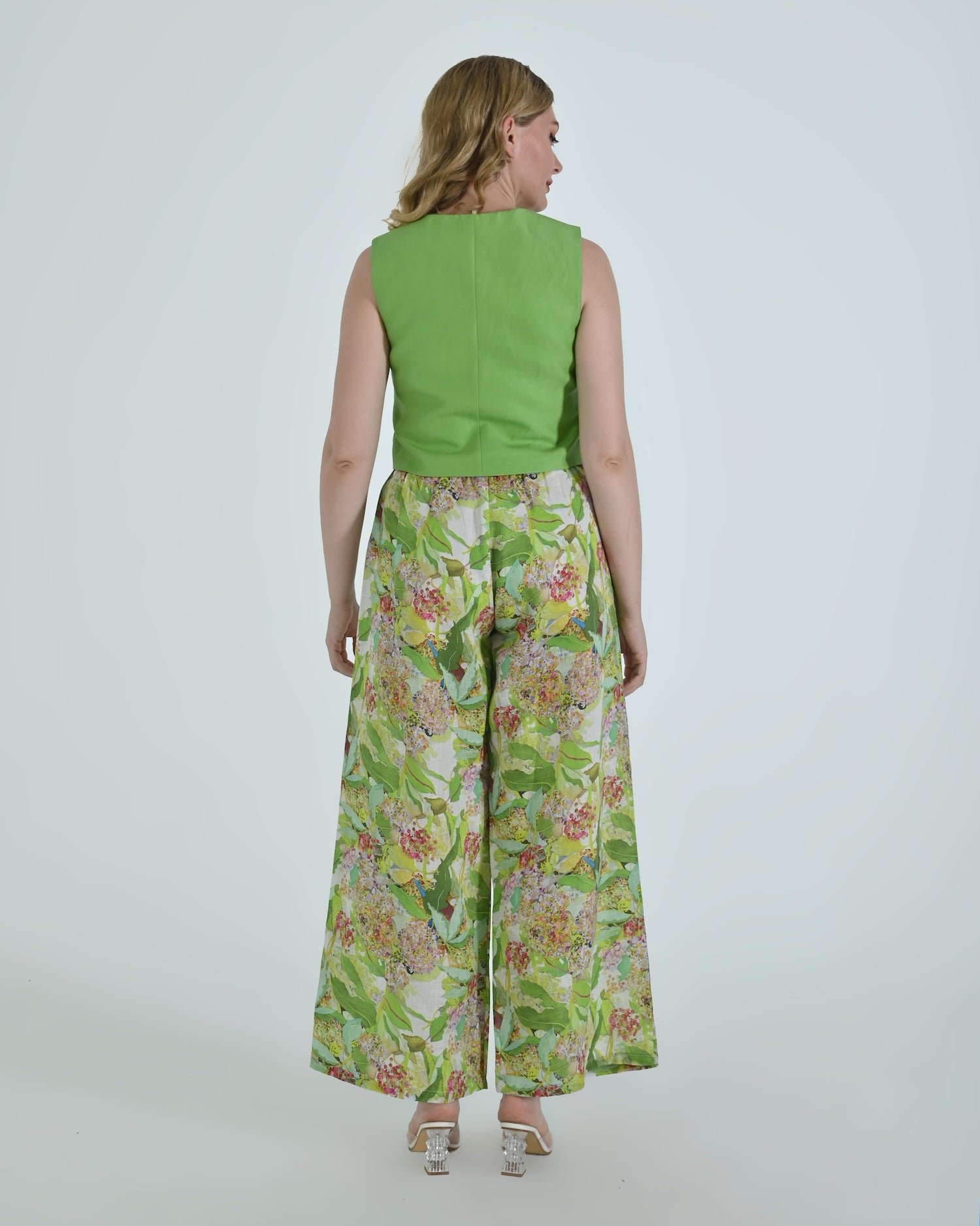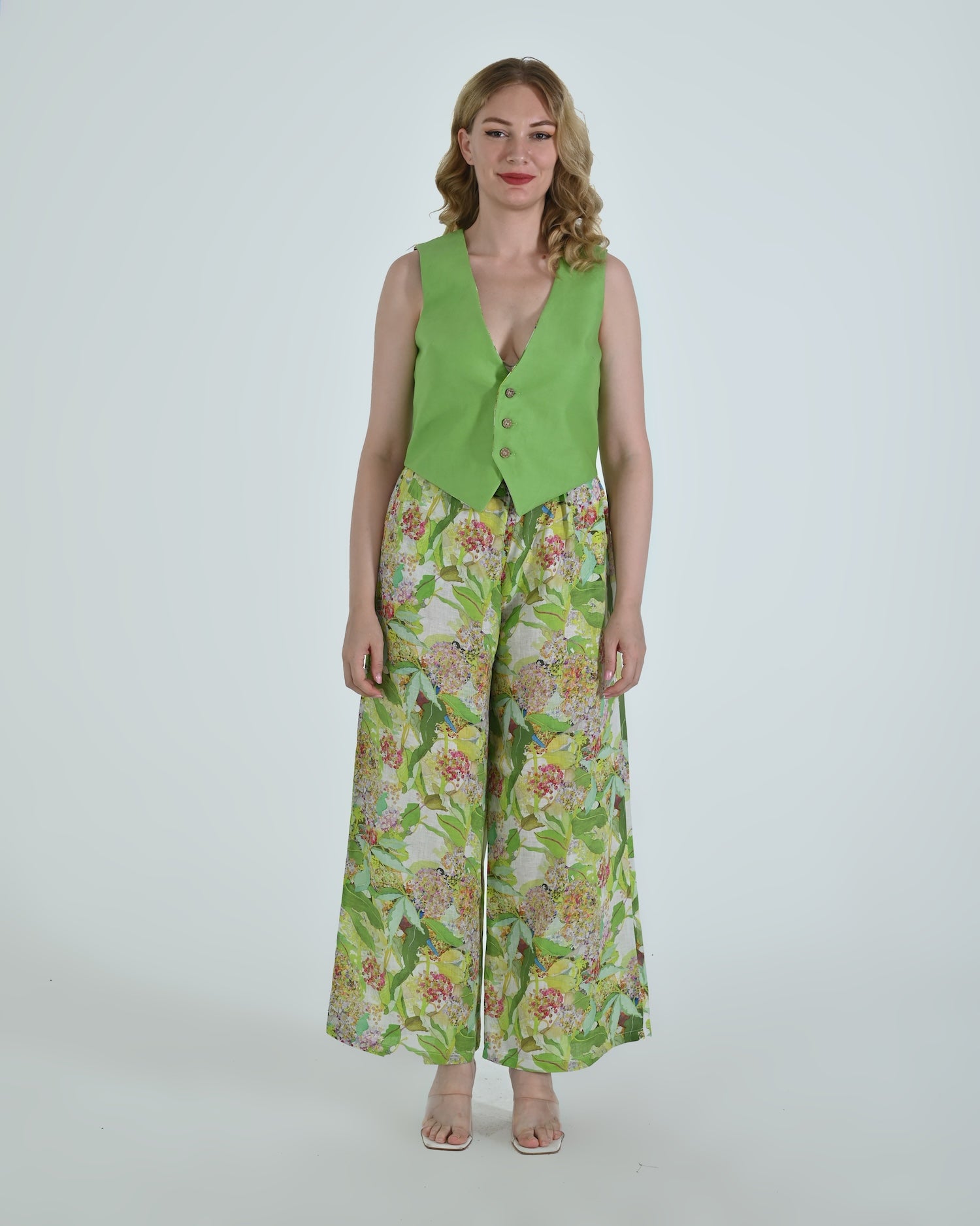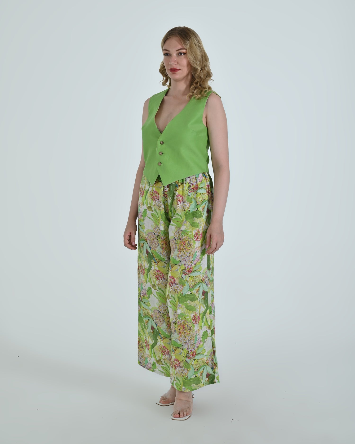 Paired with wide-leg trousers that flow with relaxed confidence, the Vento pants blend soft structure with a flattering high waist and crisp pleating. Together, they celebrate linen’s natural drape and airy comfort.