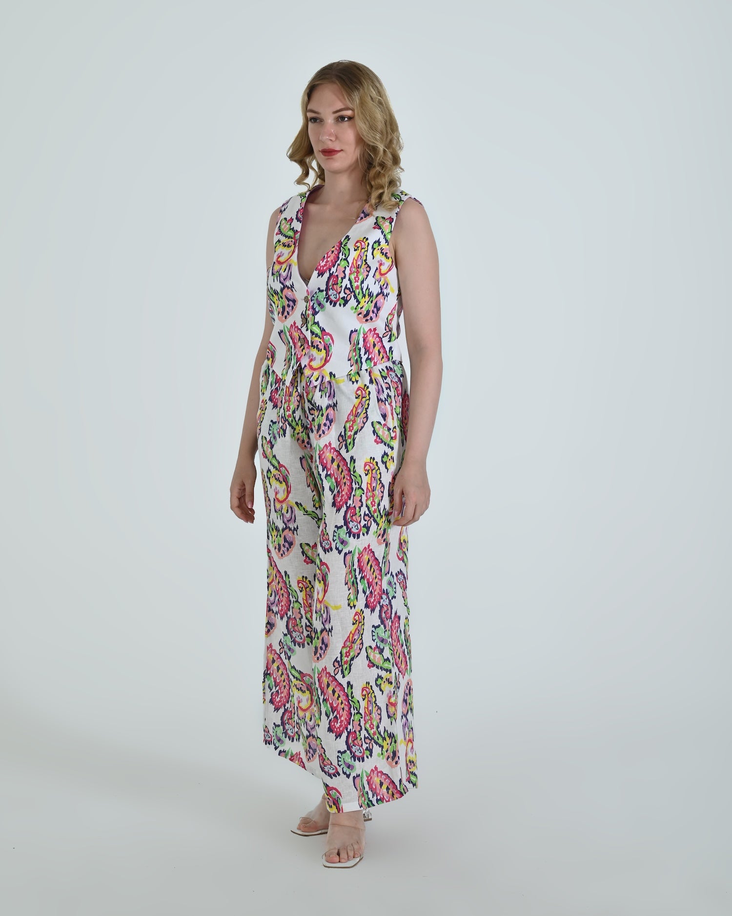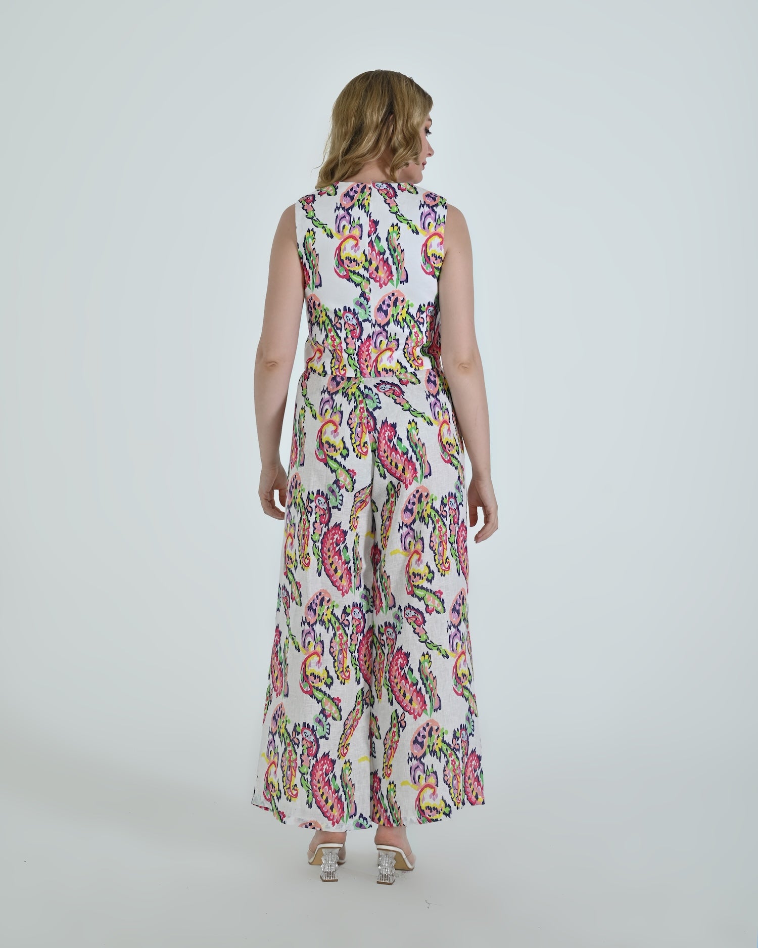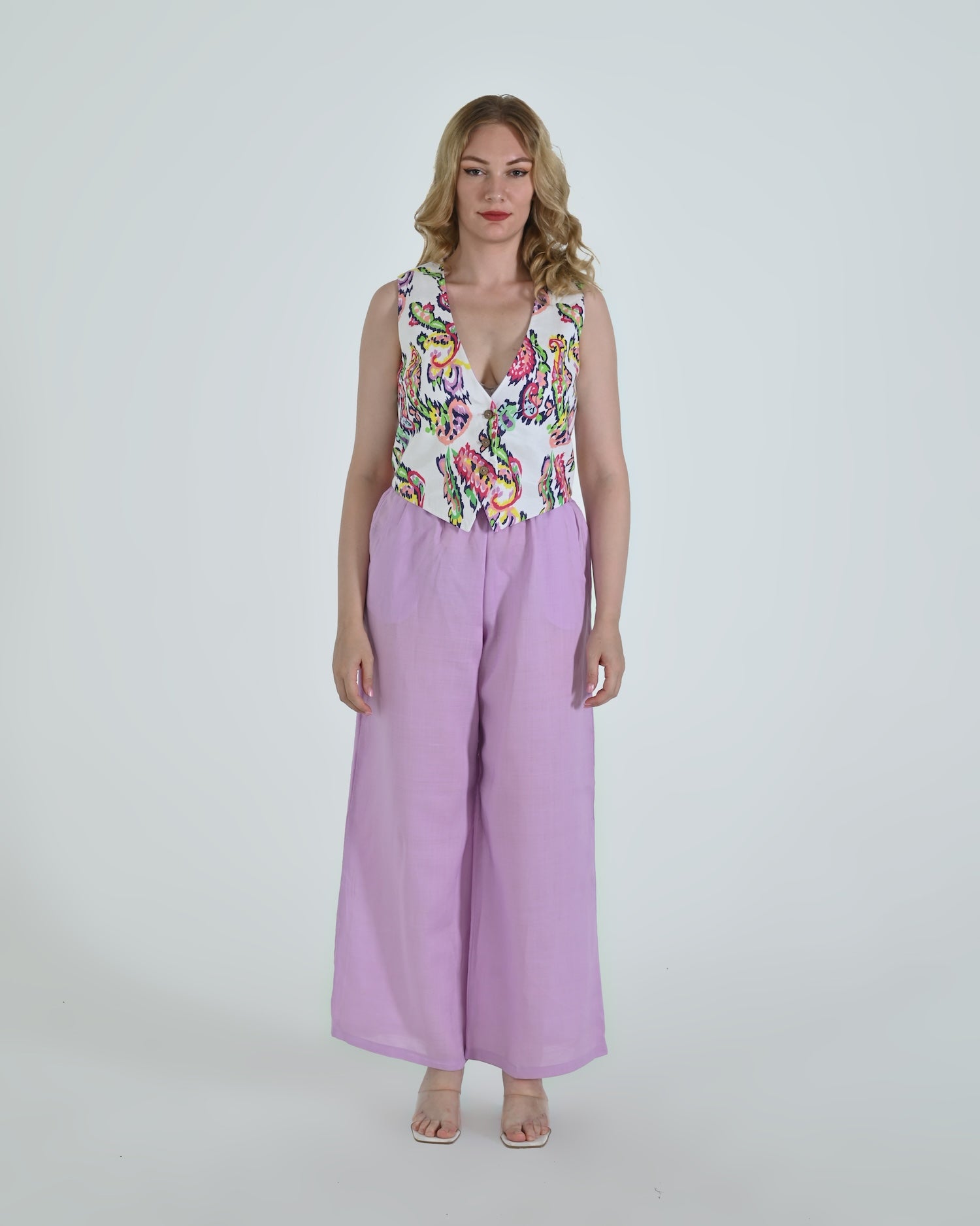 Paired with wide-leg trousers that flow with relaxed confidence, the Vento pants blend soft structure with a flattering high waist and crisp pleating. Together, they celebrate linen’s natural drape and airy comfort.