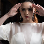 Minimalism with a molten edge—“The Whisper Dress” speaks volumes through pure silhouette and radiant silk. Designed in 100% silk with a soft sheen that catches the light like liquid metal, this dress is an exploration of restraint and presence. The relaxed, architectural cut features wide, kimono-inspired sleeves and a subtle seam detail that elongates the form. Its high neckline and clean lines draw the eye to the craftsmanship, while the clean white hue adds a quiet power. A timeless piece that whispers strength without raising its voice.