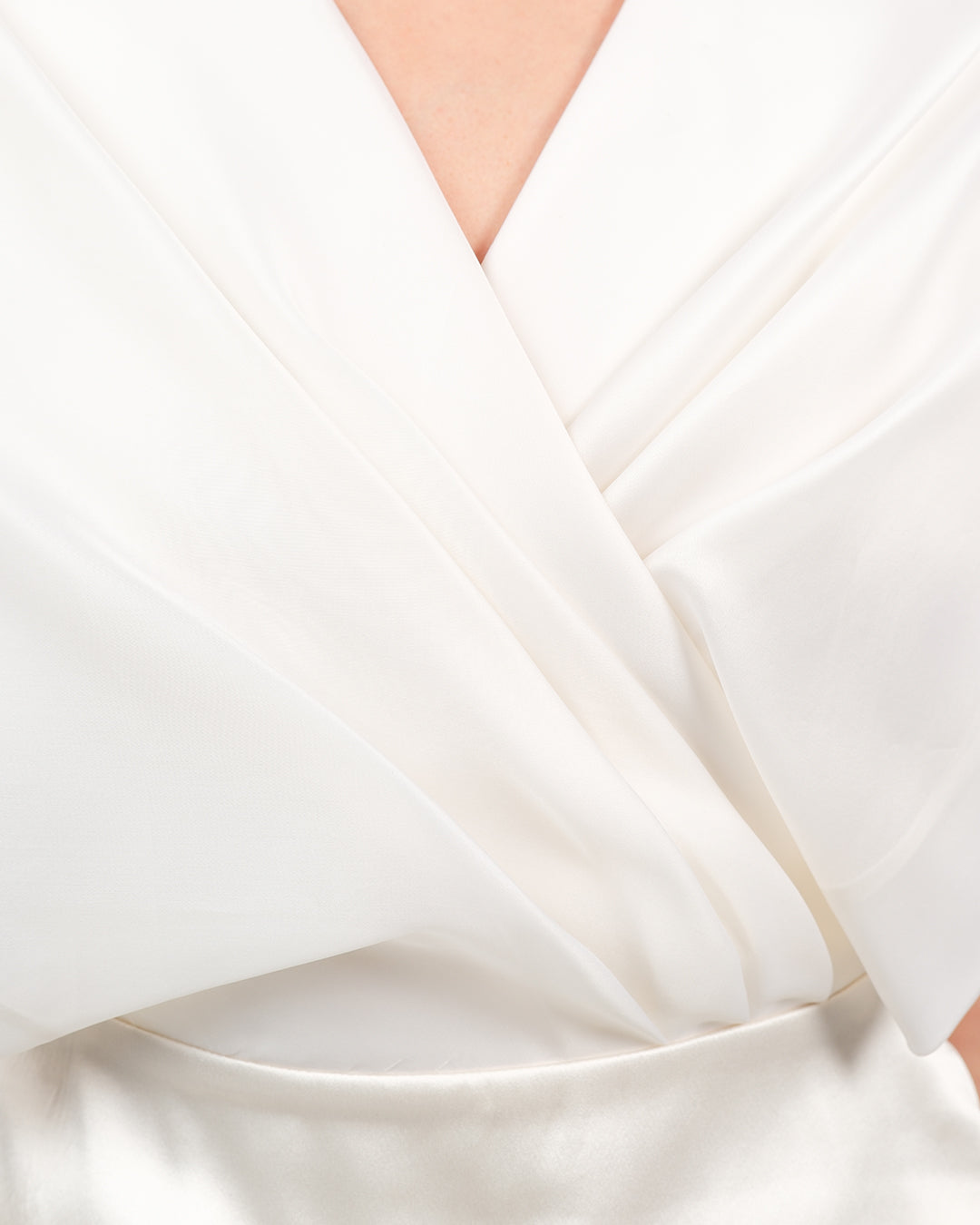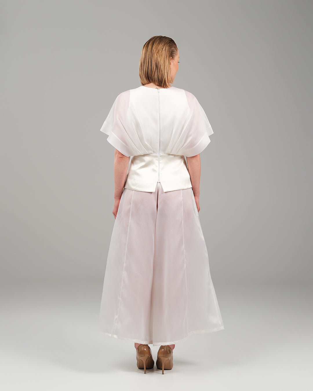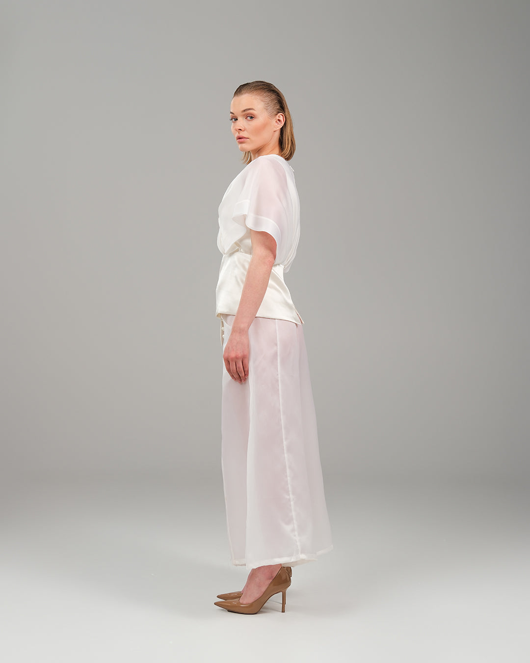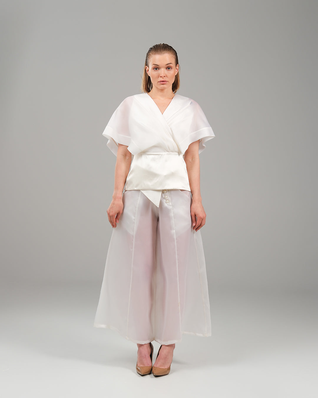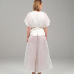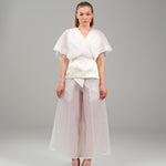 A poetic symphony of structure and softness, this two-piece ensemble redefines contemporary elegance through subtle drama and fluid lines. The wrapped silk top, crafted in airy organza, contours the waist with a sculptural silhouette and asymmetric hem, while layered kimono sleeves evoke a sense of effortless grace. Paired with ethereal wide-leg pants in matching organza silk, the look glides with lightness and intention. A celebration of refined femininity, where modern tailoring meets poetic movement.
