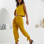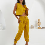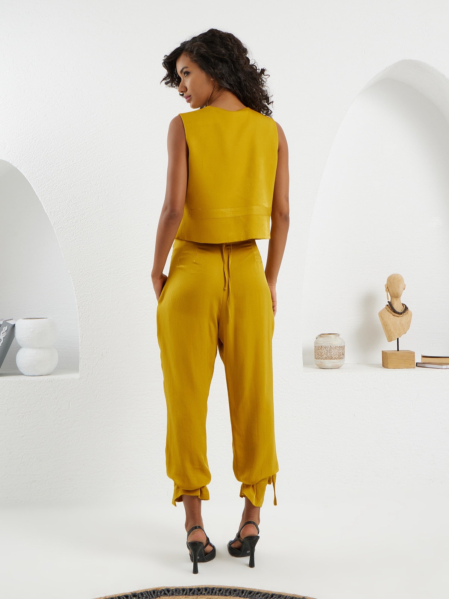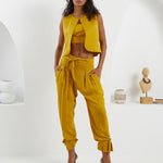A captivating ensemble featuring a front-facing vest paired with a stylish waistcoat and pleated harem pants. With ankle closure detailing, this set presents a striking combination of classic charm and contemporary flair. The reversible vest adds a touch of versatility, allowing you to effortlessly transition between different looks. Elevate your wardrobe with this meticulously designed ensemble that effortlessly blends sophistication and modern style.