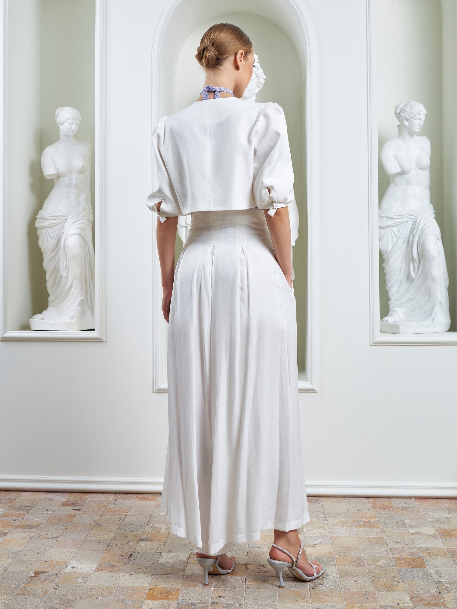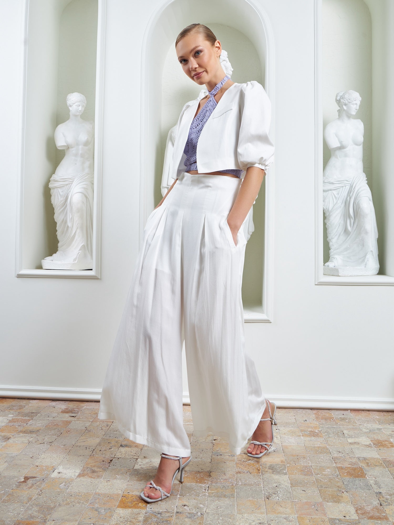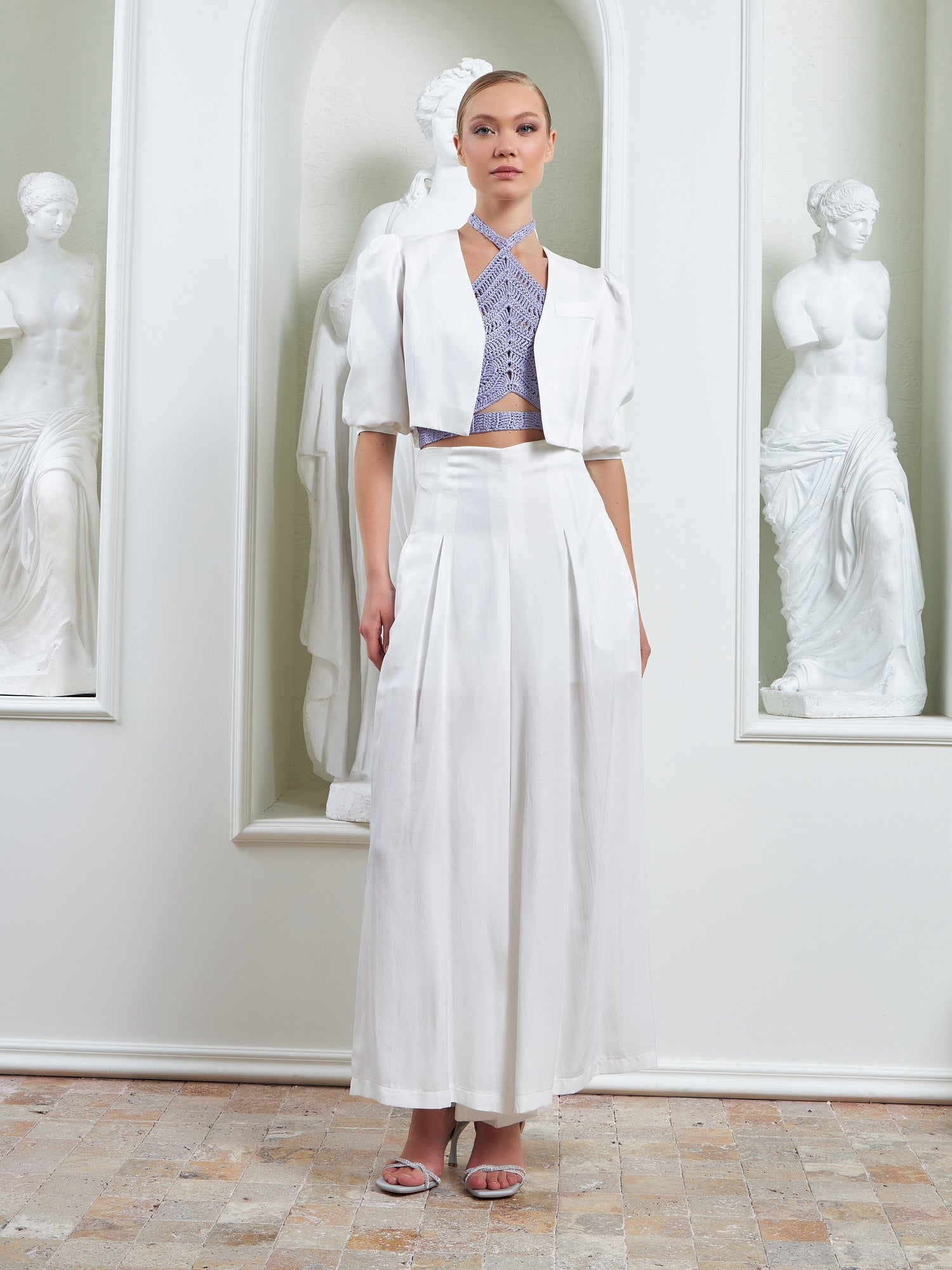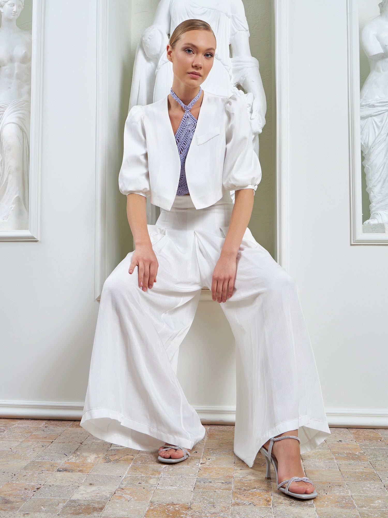 The Palazzo Ensemble – White is defined by its sculptural cropped jacket, designed to anchor the look with architectural precision and refined ease. Featuring softly structured puffer shoulders and clean, intentional tailoring, the jacket sharpens the upper silhouette while maintaining lightness and balance.