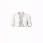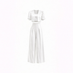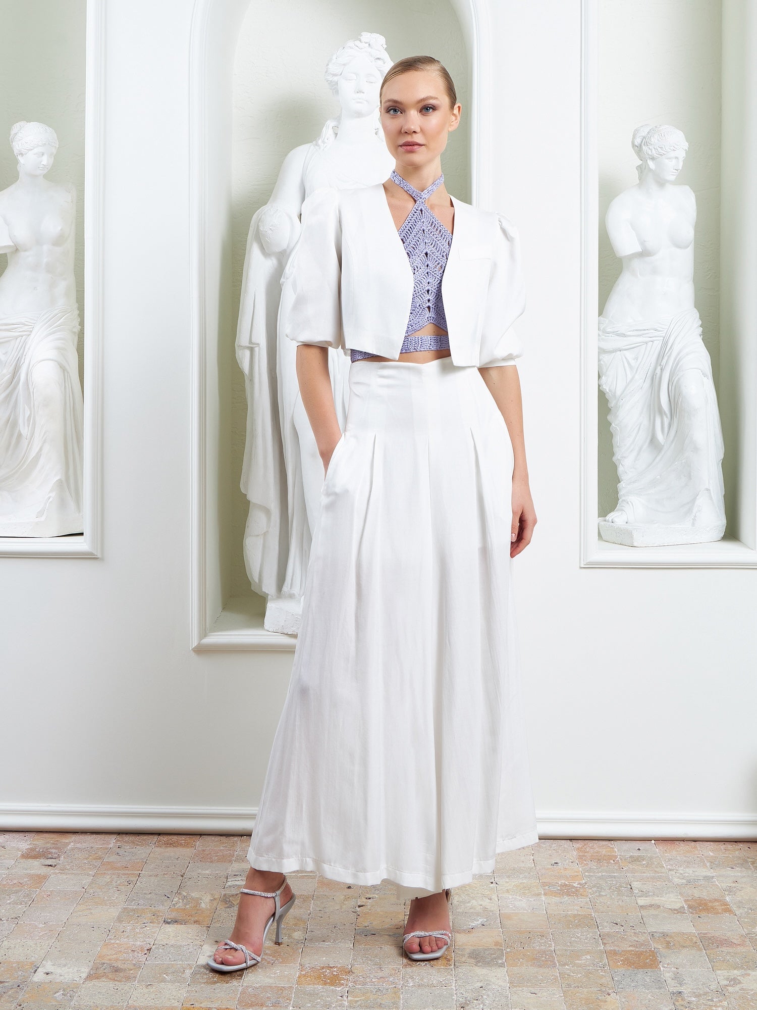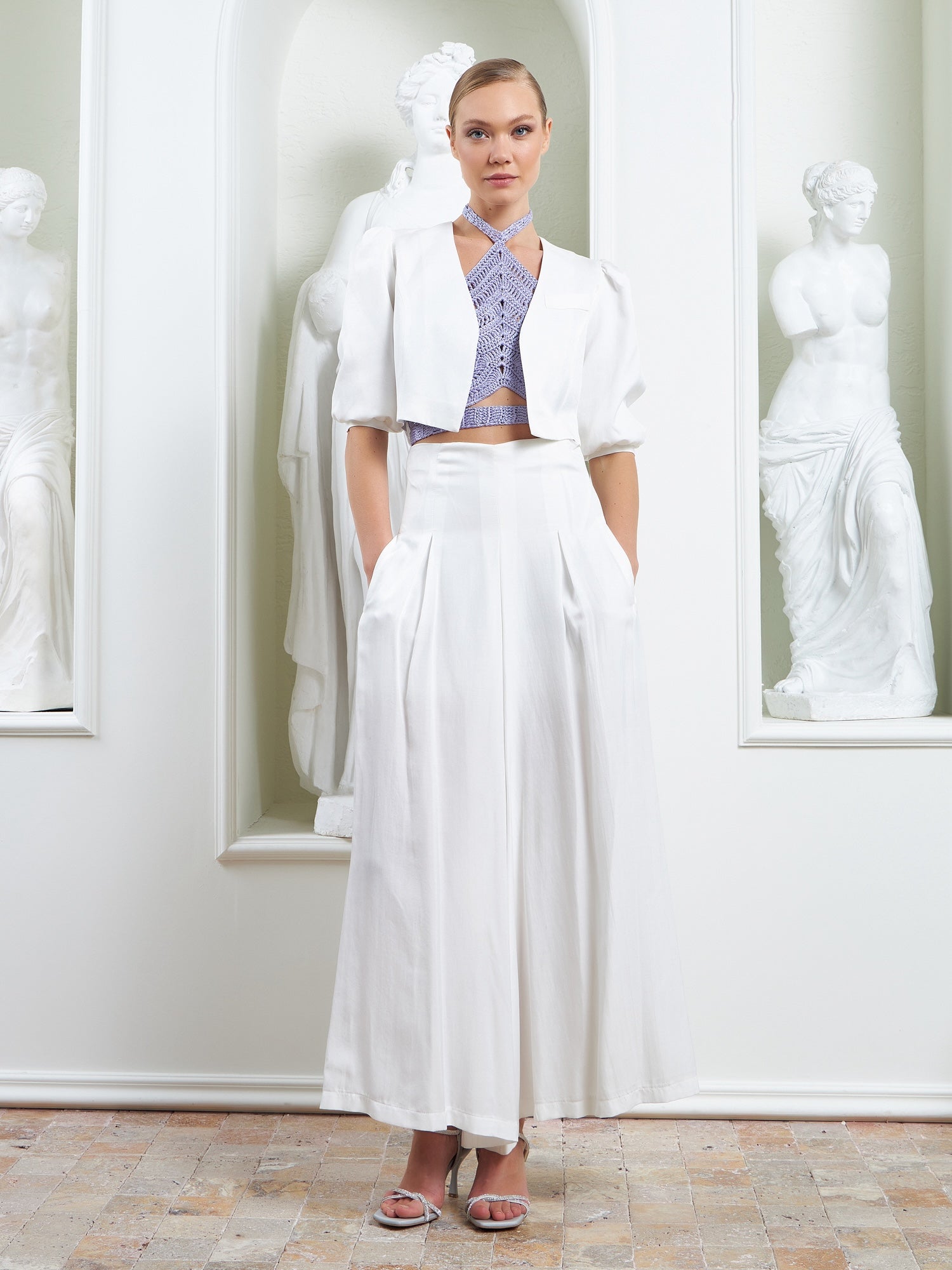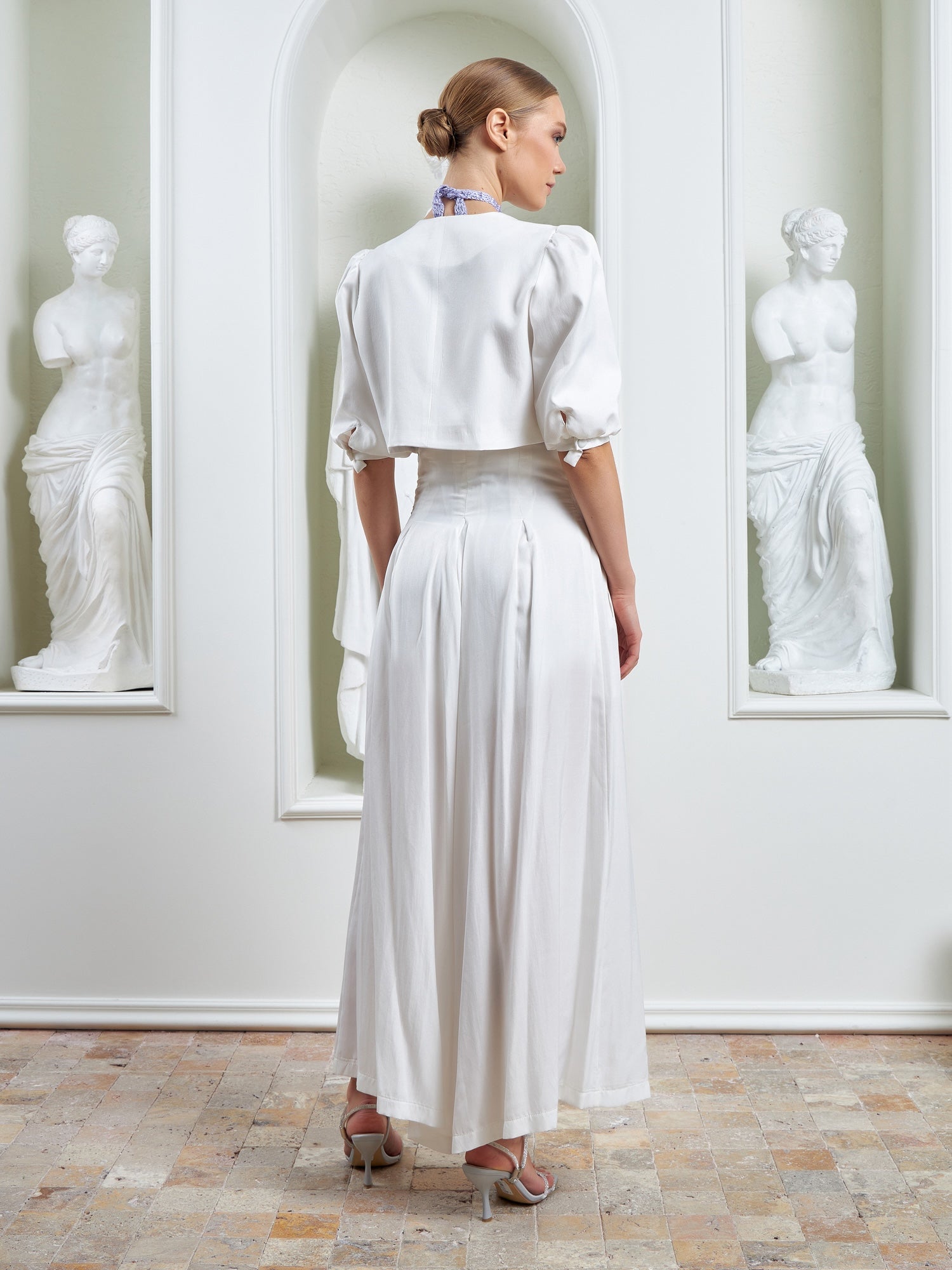 The Palazzo Ensemble – White is defined by its sculptural cropped jacket, designed to anchor the look with architectural precision and refined ease. Featuring softly structured puffer shoulders and clean, intentional tailoring, the jacket sharpens the upper silhouette while maintaining lightness and balance.