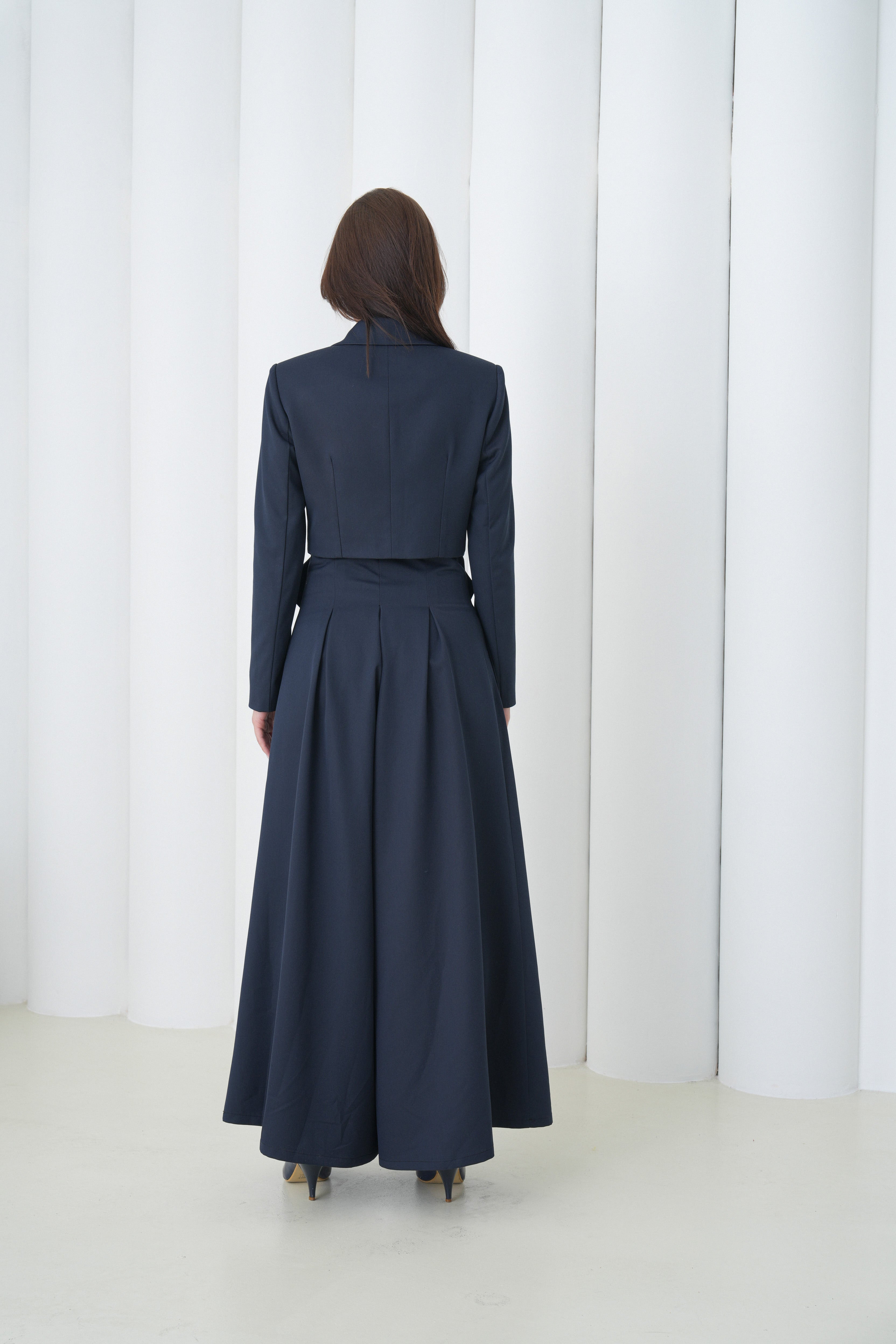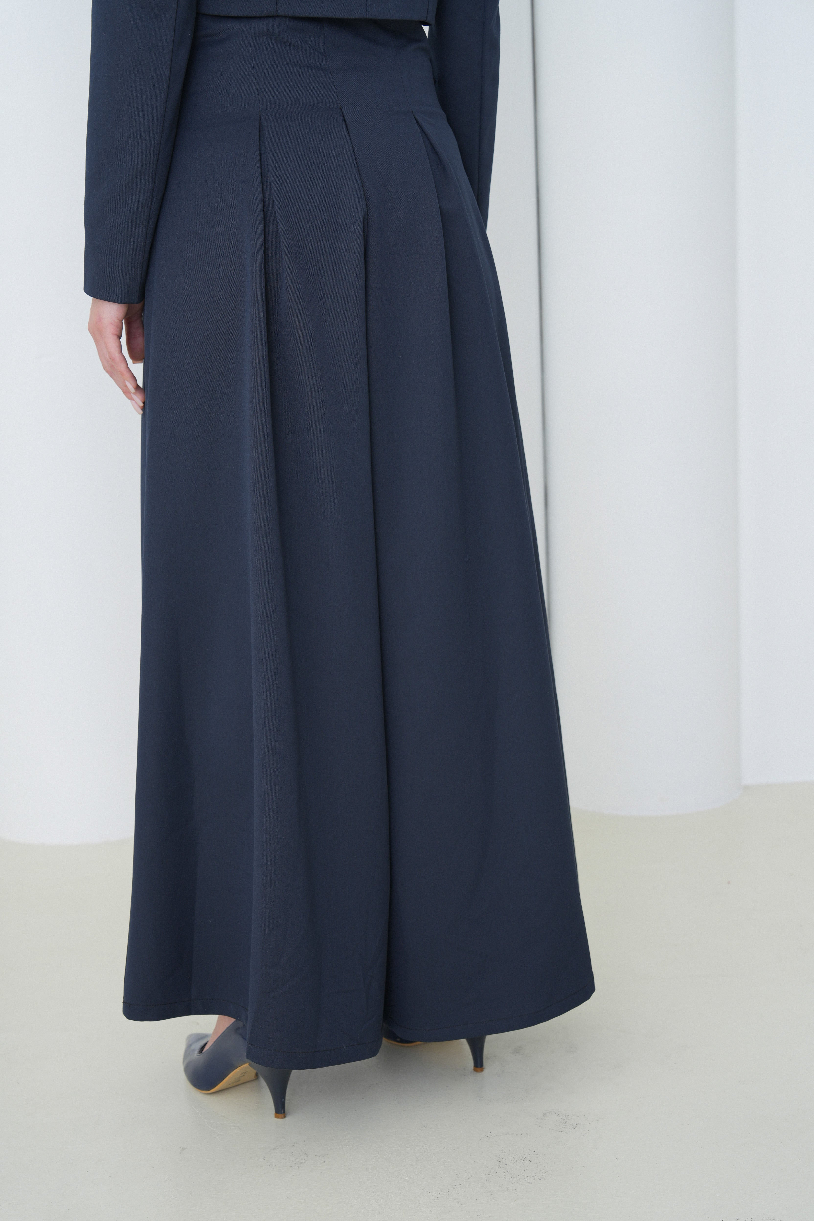 Designed to elongate the frame and sharpen posture, the high-rise waist anchors the silhouette as the generous leg width creates dramatic runway movement. The fabric drapes with intention, offering a balance between softness and control that feels commanding yet comfortable. Whether styled as part of a power suit or worn as a standalone statement, The Palazzo Pants transition seamlessly from boardroom precision to evening elegance.