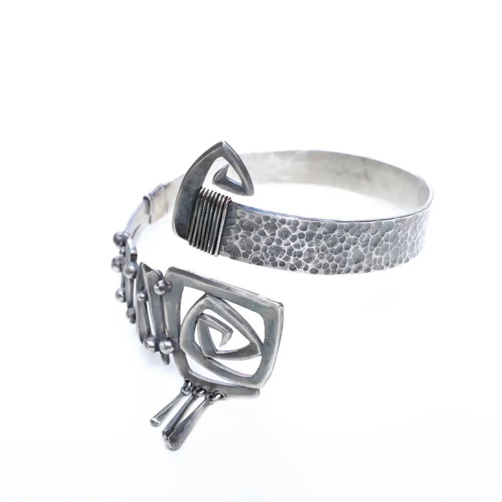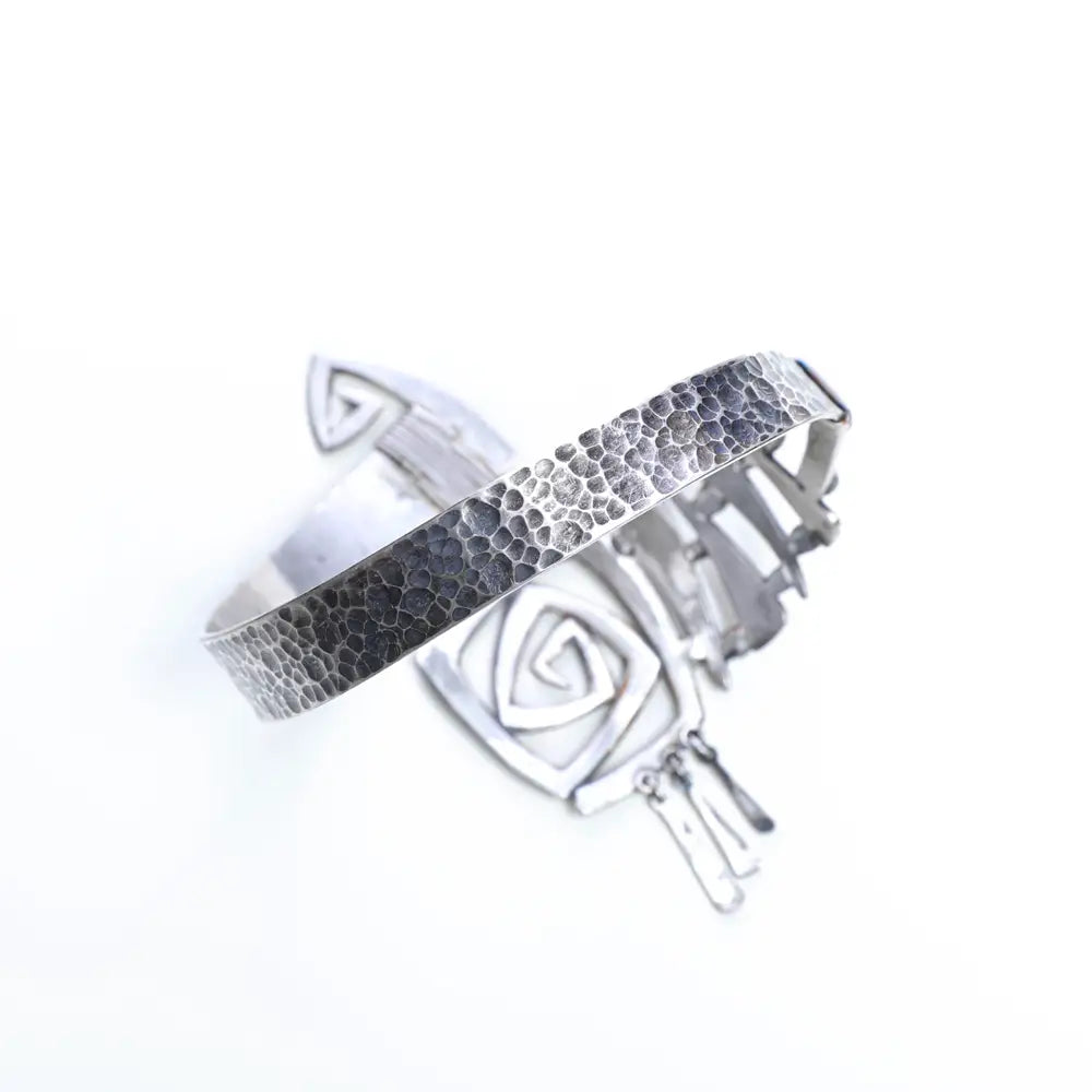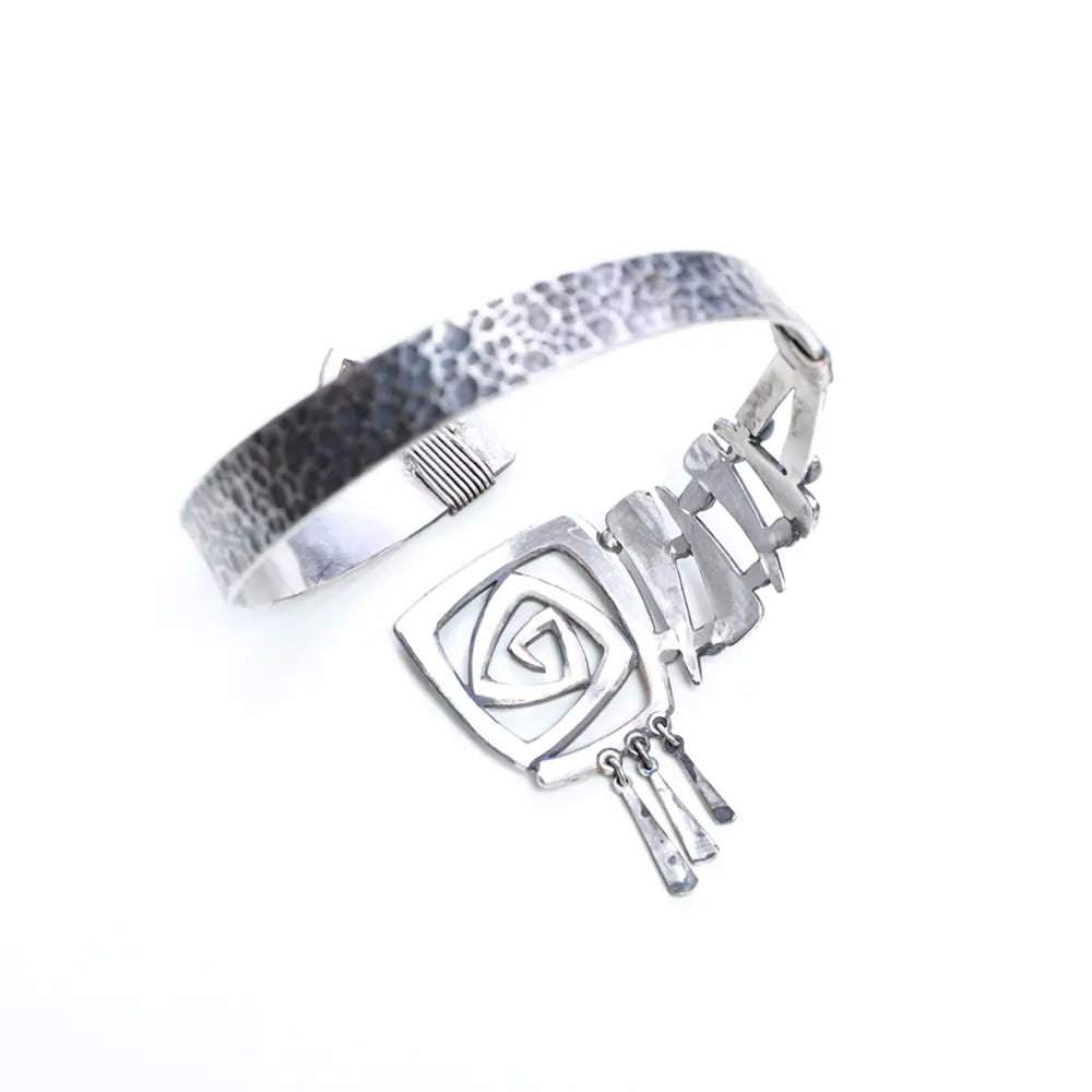 This striking bracelet is a handcrafted piece in oxidized sterling silver, featuring a beautifully hammer-textured band and bold geometric accents. The asymmetrical design showcases a square spiral motif—a modern take on ancient symbols—paired with layered wire detailing and delicate dangle elements that echo kinetic movement. The juxtaposition of smooth and textured surfaces adds depth, while the open-ended structure enhances its sculptural feel. It's a piece that blends brutalist aesthetics with artisanal craftsmanship, making it a statement accessory with a strong, artistic presence.