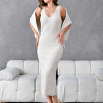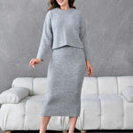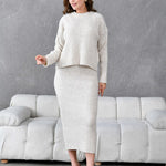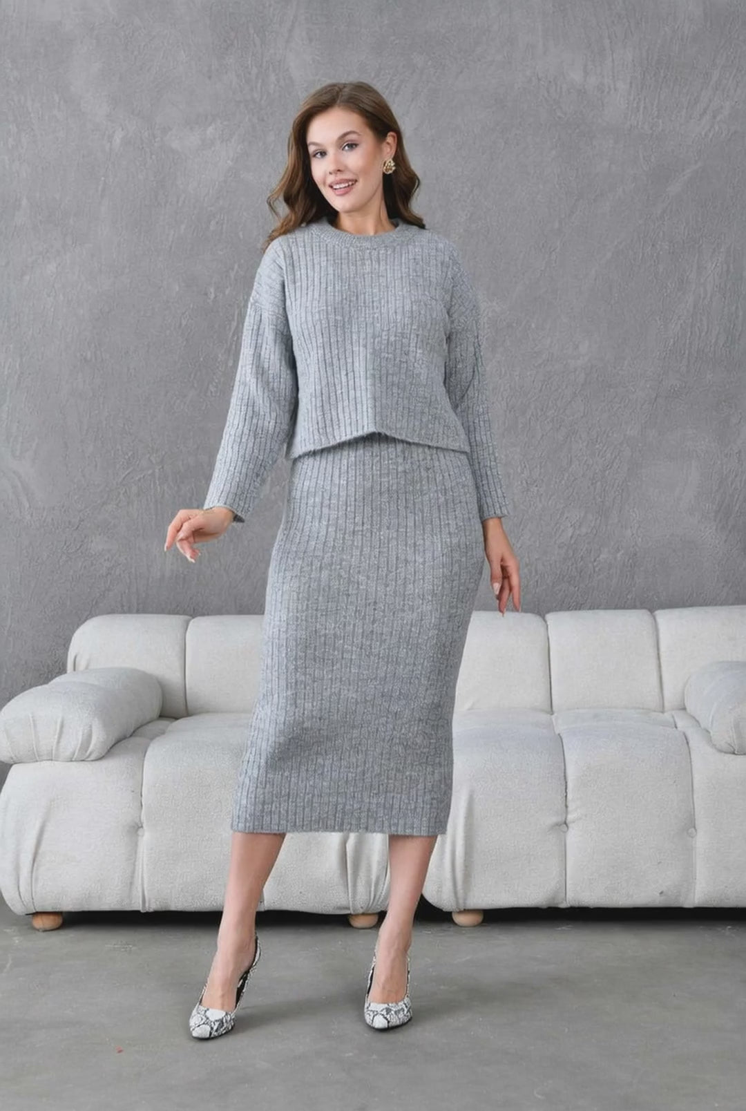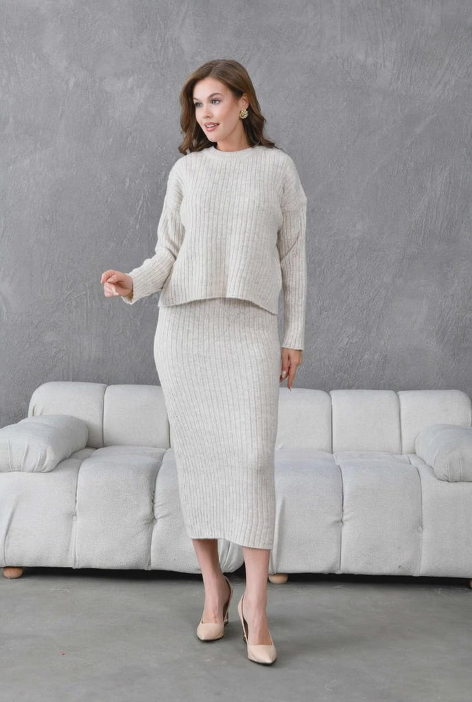 A timeless expression of balance and texture. This two-piece dress combines a softly ribbed knit top with a matching straight skirt, creating the illusion of one continuous silhouette. The design celebrates proportion and movement — relaxed yet refined, with a natural drape that flatters every form.