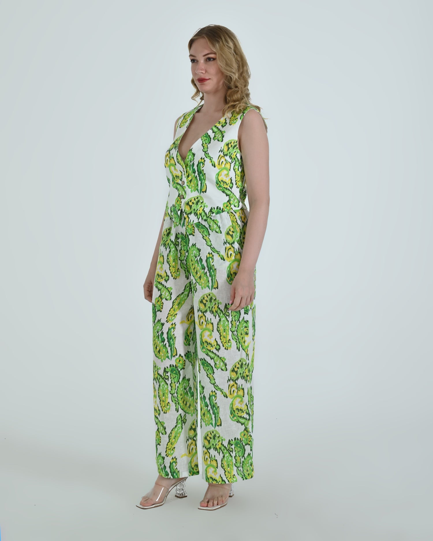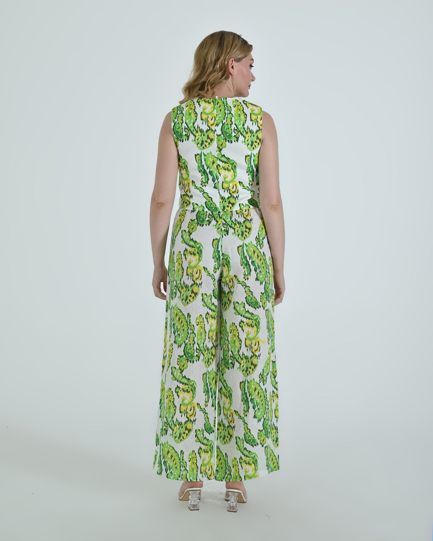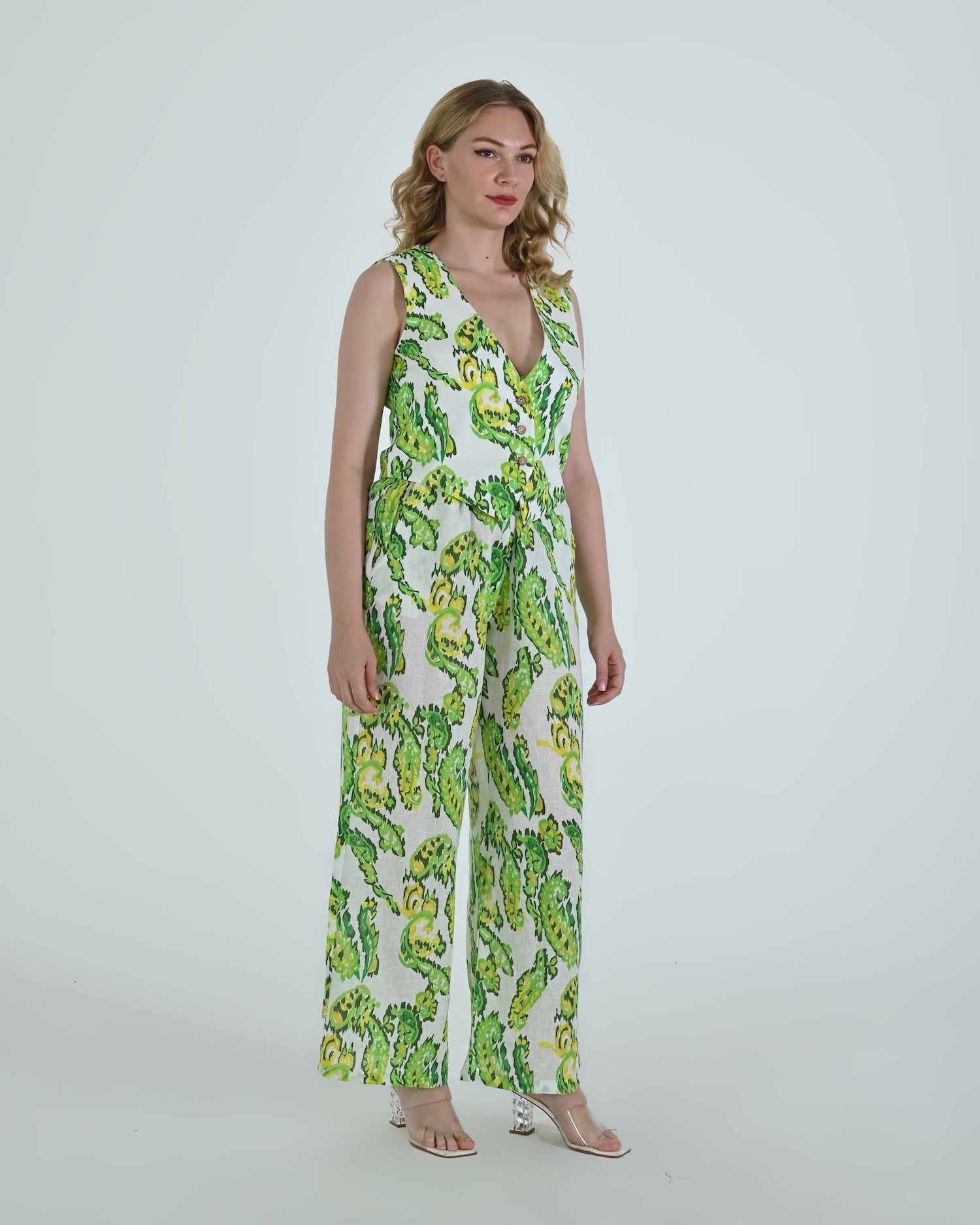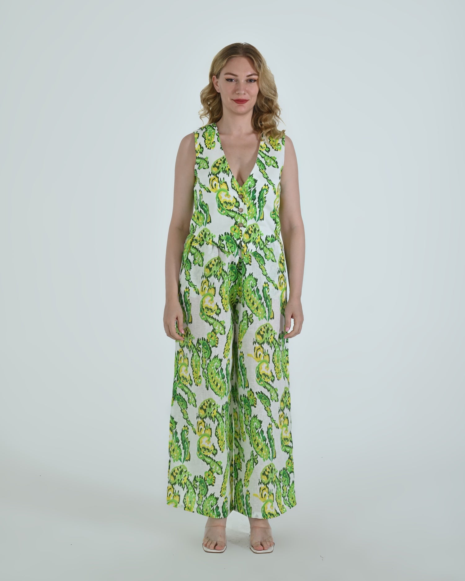 Paired with wide-leg trousers that flow with relaxed confidence, the Vento pants blend soft structure with a flattering high waist and crisp pleating. Together, they celebrate linen’s natural drape and airy comfort.