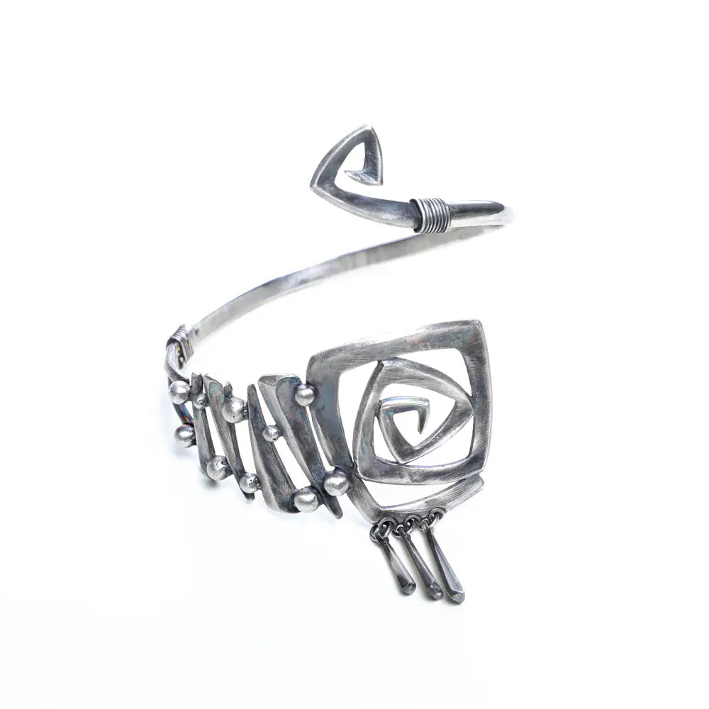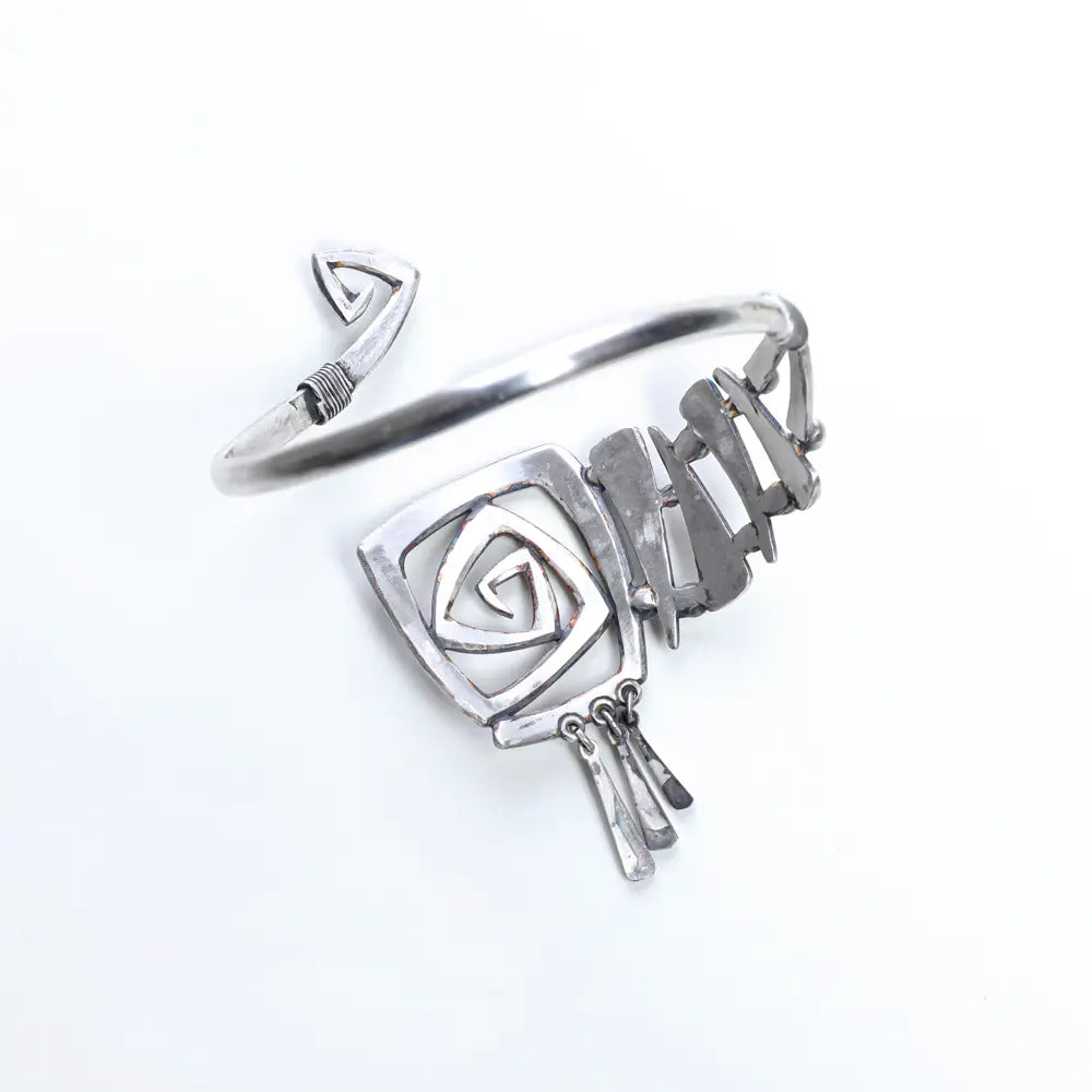 This striking bracelet is a handcrafted piece in oxidized sterling silver, featuring a beautifully hammer-textured band and bold geometric accents. The asymmetrical design showcases a square spiral motif—a modern take on ancient symbols—paired with layered wire detailing and delicate dangle elements that echo kinetic movement. The juxtaposition of smooth and textured surfaces adds depth, while the open-ended structure enhances its sculptural feel. It's a piece that blends brutalist aesthetics with artisanal craftsmanship, making it a statement accessory with a strong, artistic presence.