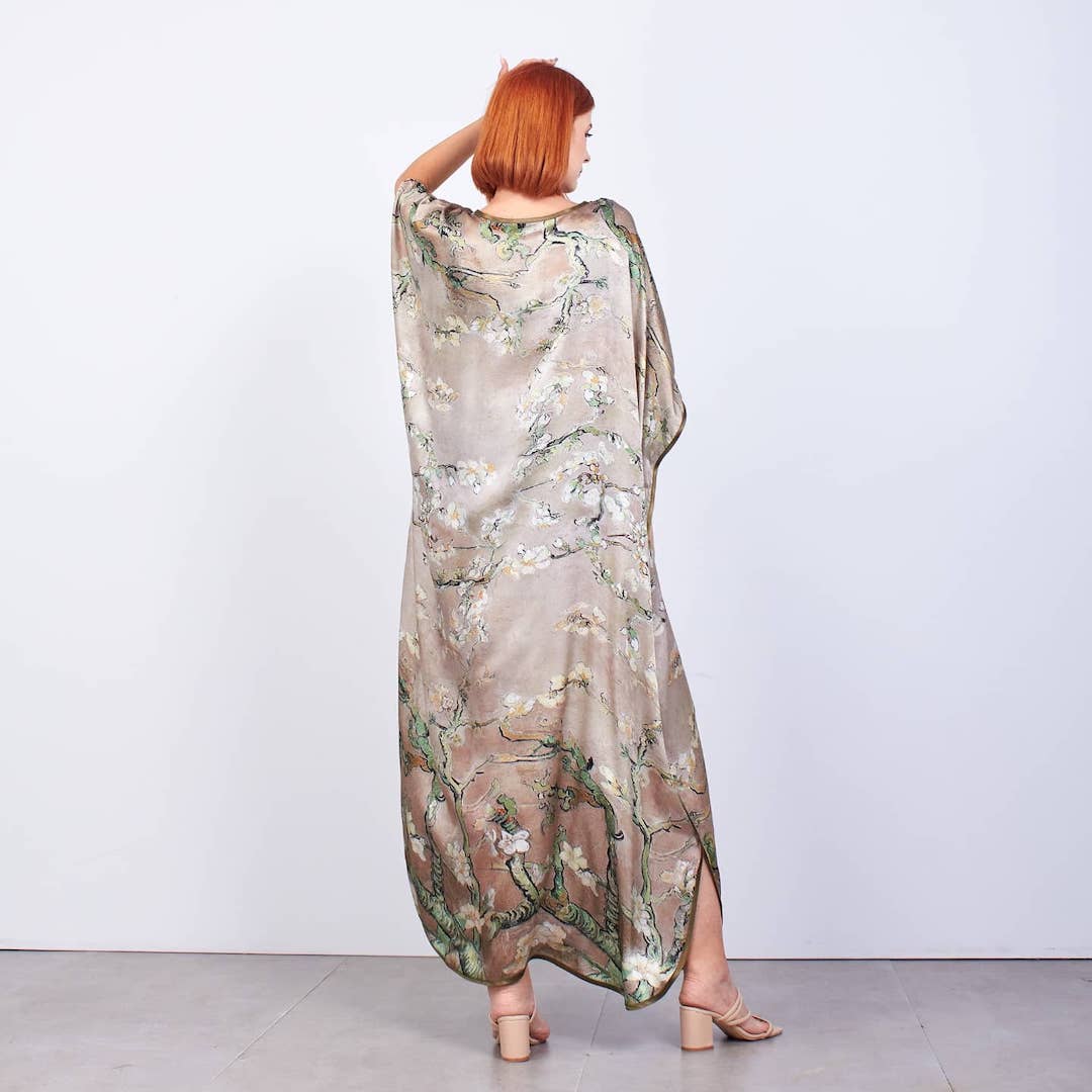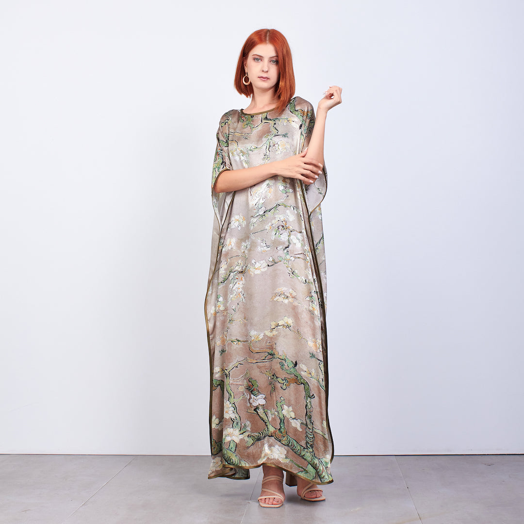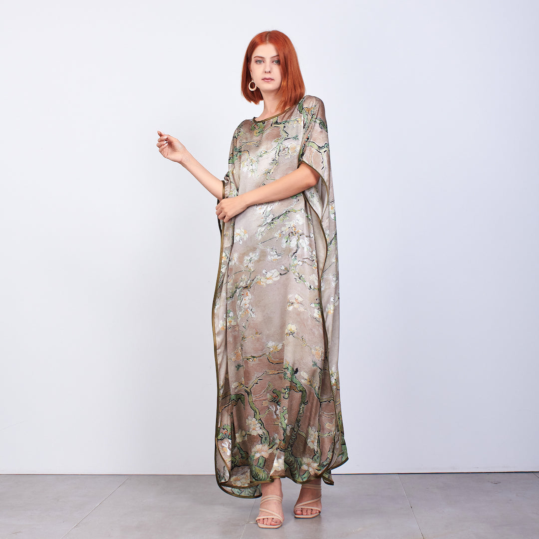 Long Mulberry Pure Silk Dress - Van Gohg Sepia Almond Blossom