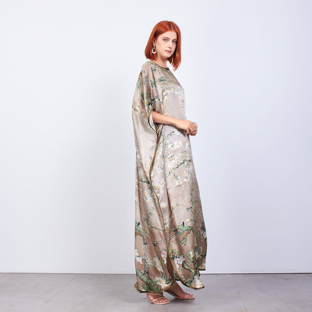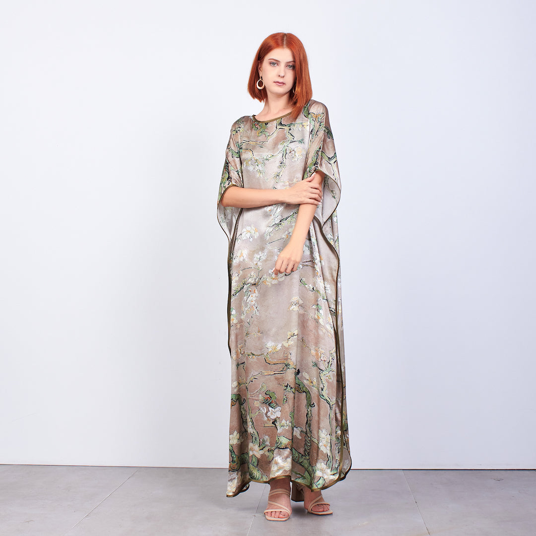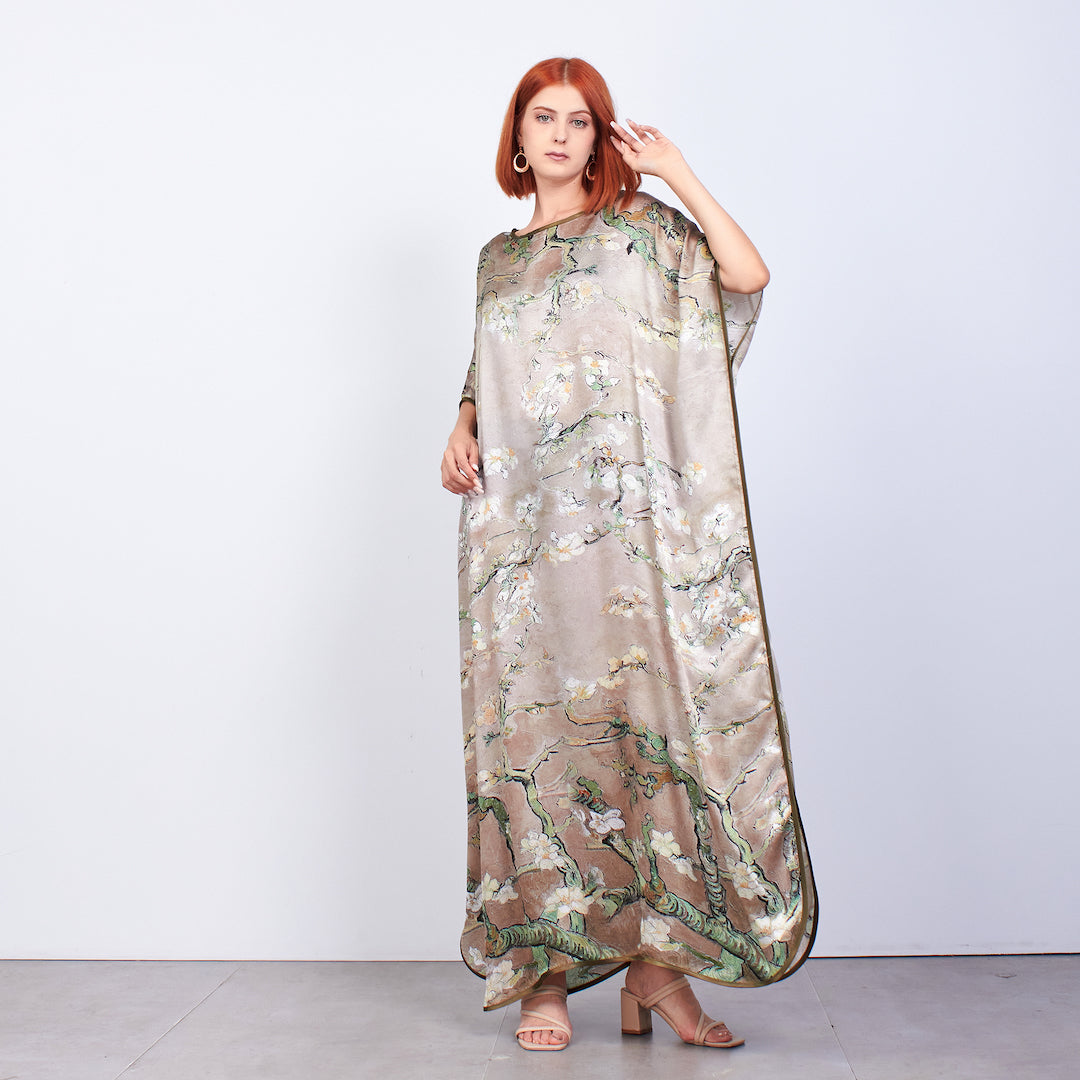 Long Mulberry Pure Silk Dress - Van Gohg Sepia Almond Blossom
