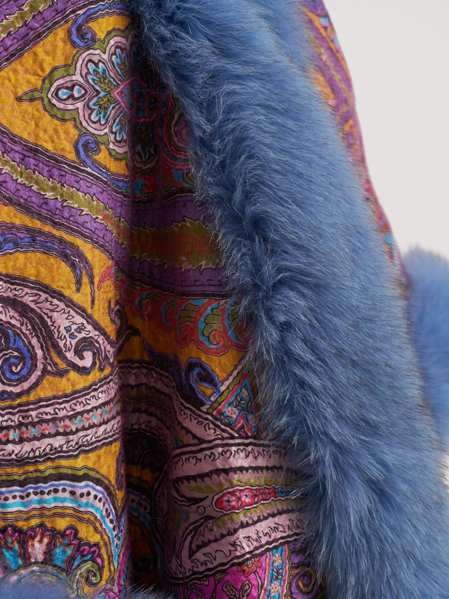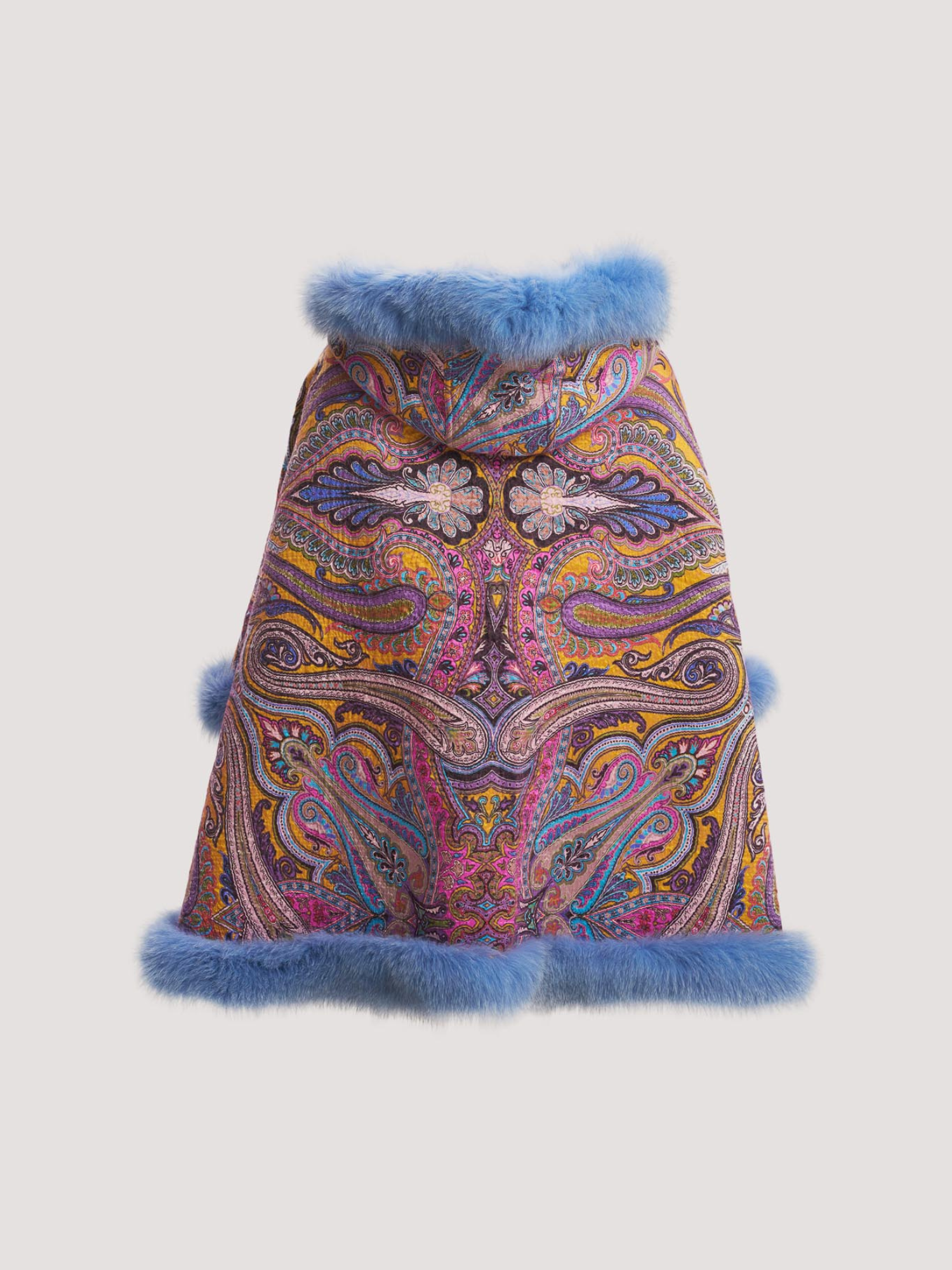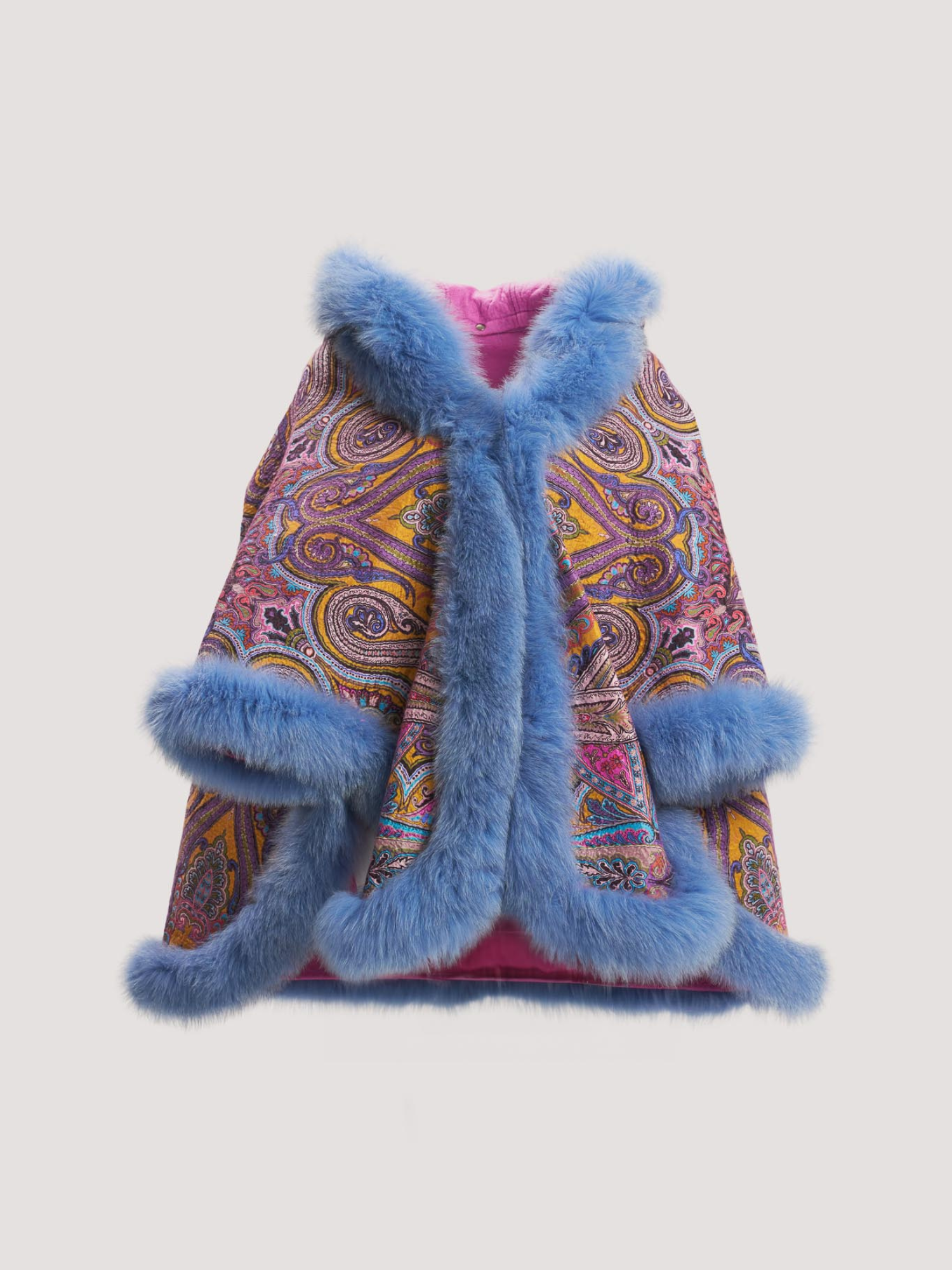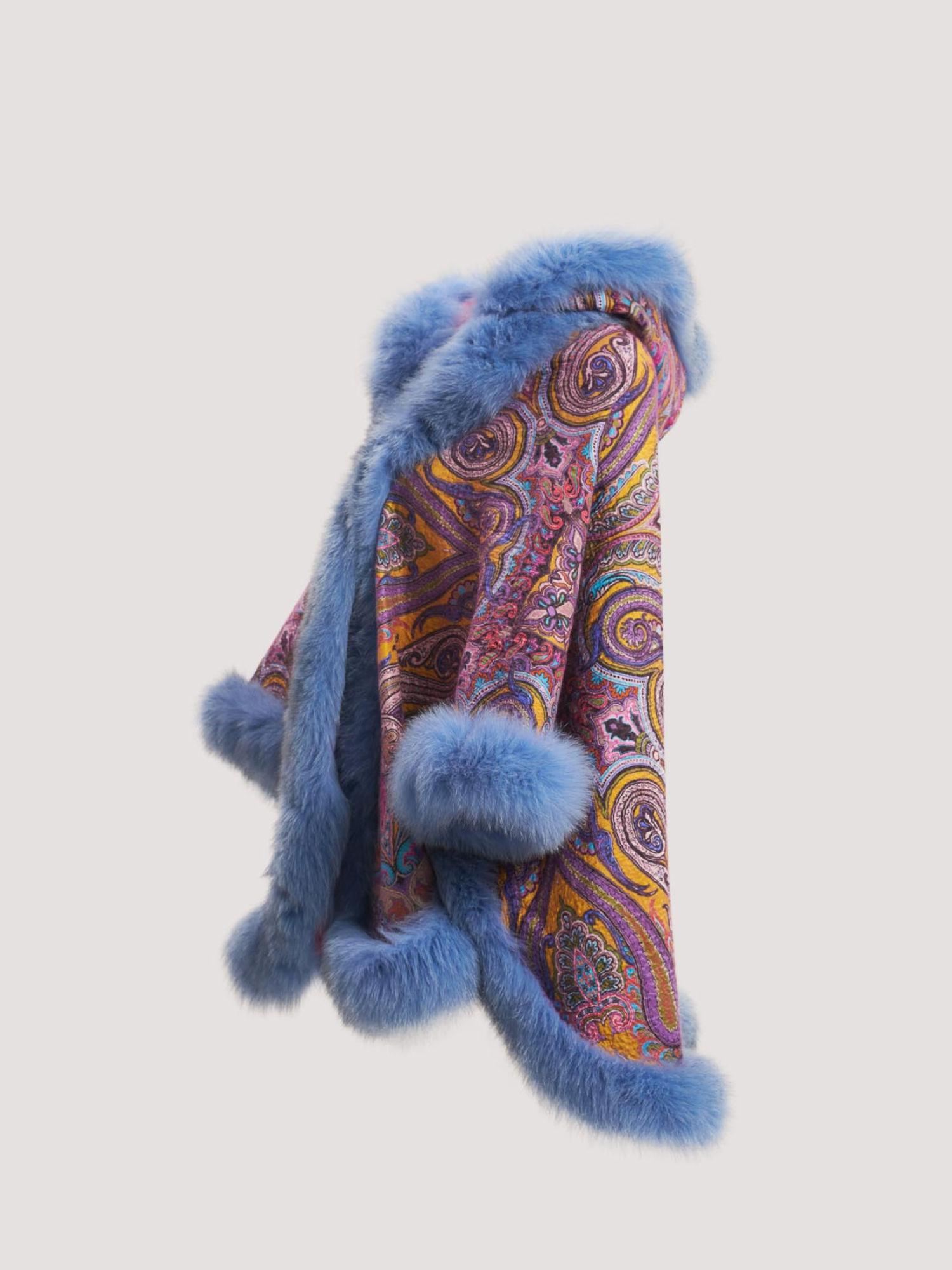 This Hooded poncho, crafted with real fox fur, combines elegance and warmth.