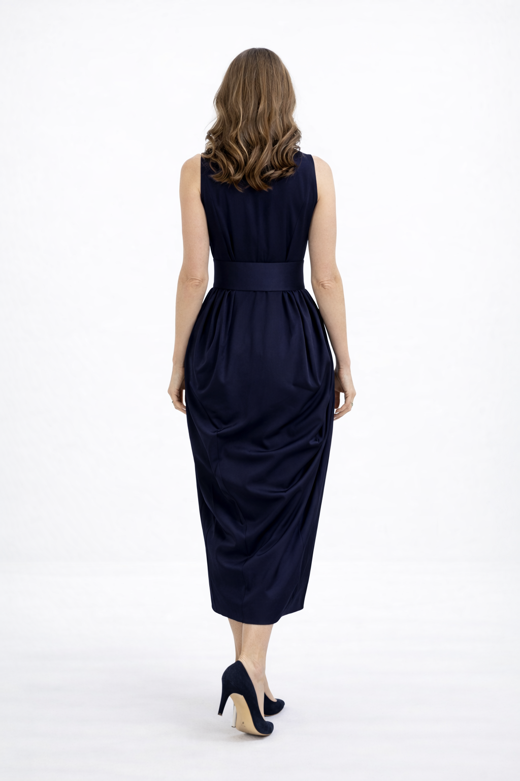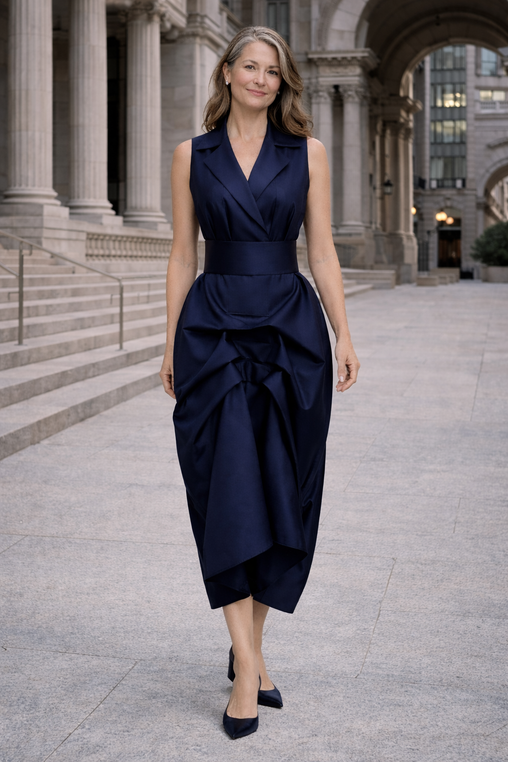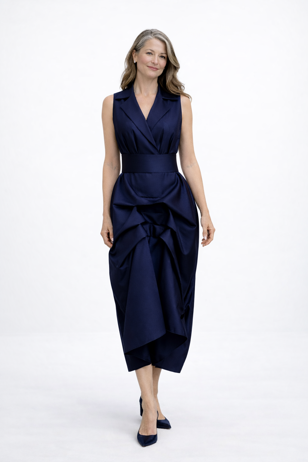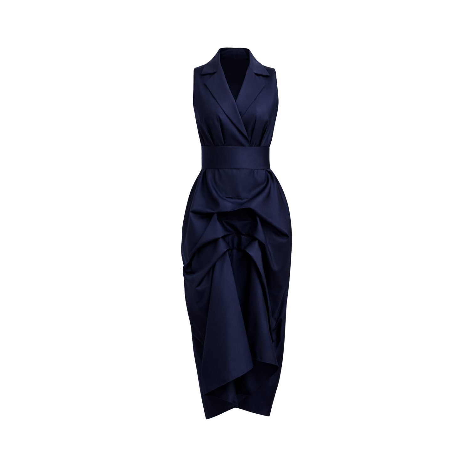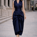 This sophisticated dress features a classic tuxedo-inspired top with a sleek, sleeveless design, exuding confidence and poise. The oversized draped skirt adds a dramatic, flowing silhouette, creating movement and visual interest with every step. A wide fabric belt cinches the waist, accentuating your figure and adding a touch of definition to the ensemble. Perfect for formal occasions or an upscale evening out, this dress offers a chic, contemporary take on classic tuxedo style.